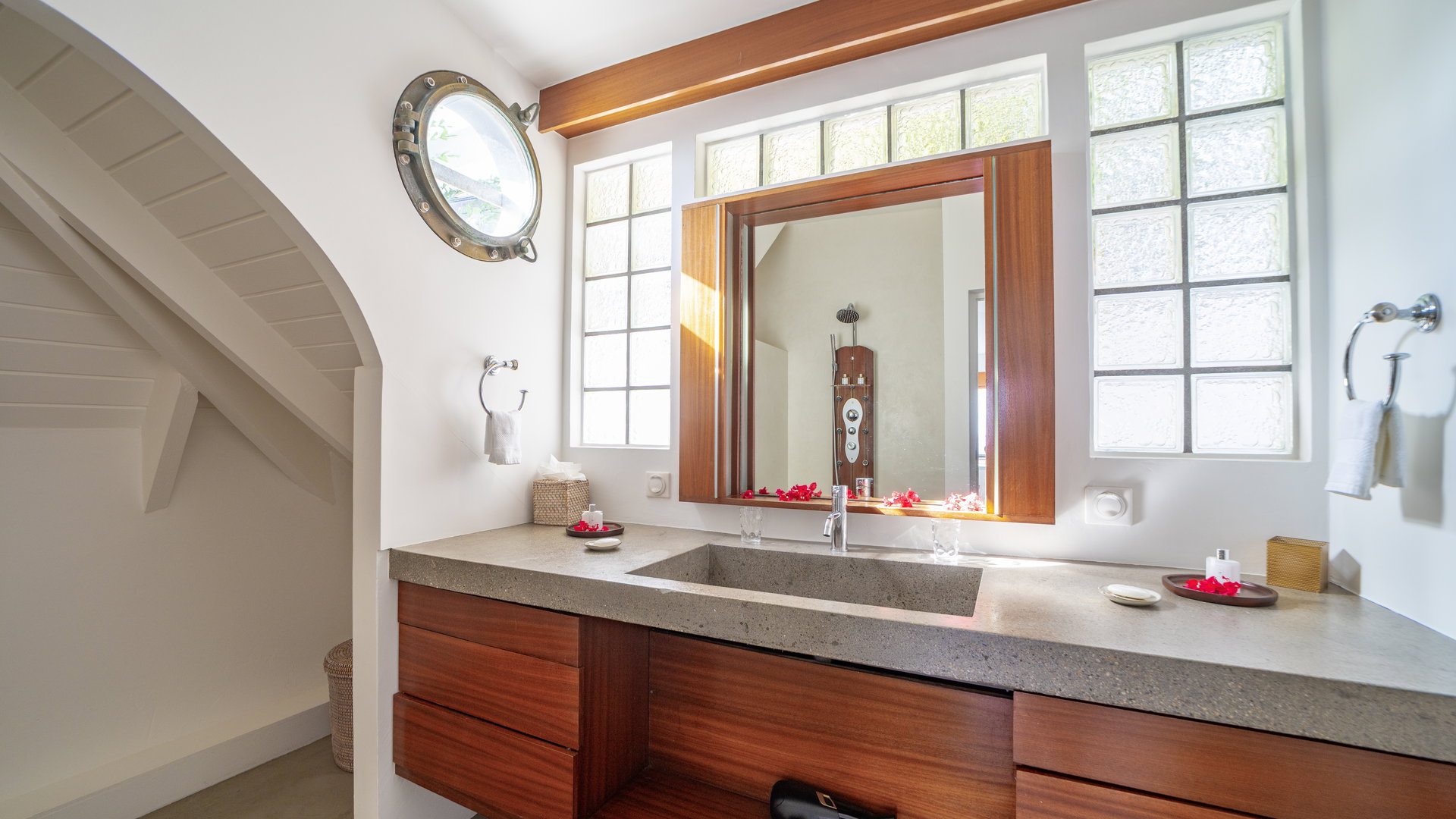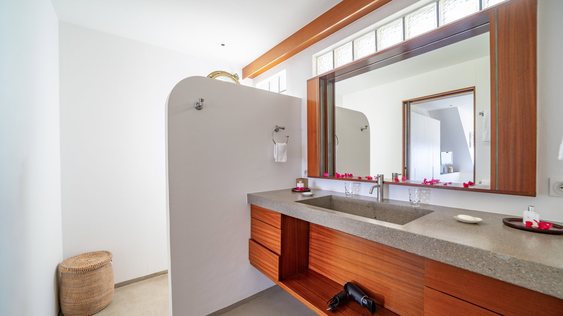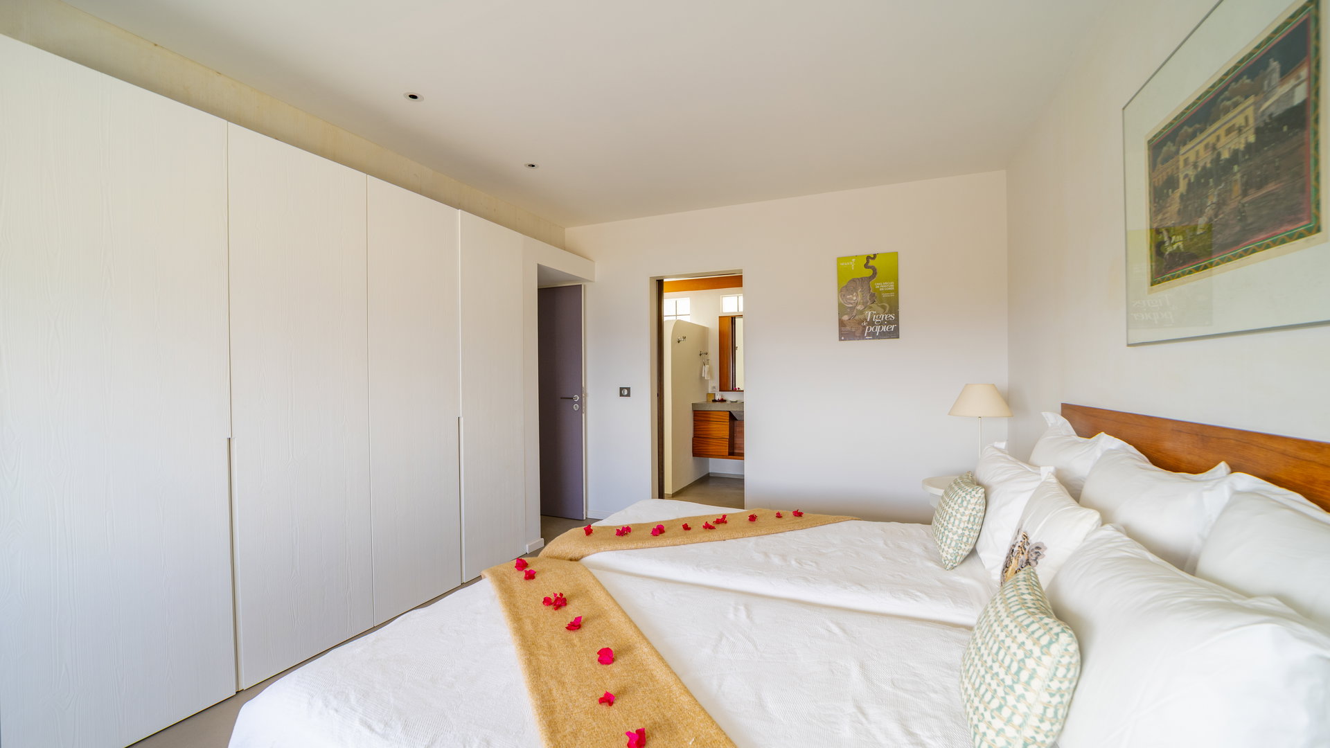 On the upper level. Twin beds, air conditioning, HD-TV with French channels, dressing room, safe. Private bathroom with bathtub, rain shower and regular shower, double sinks, hairdryer, bathrobes, towels and beach towels.