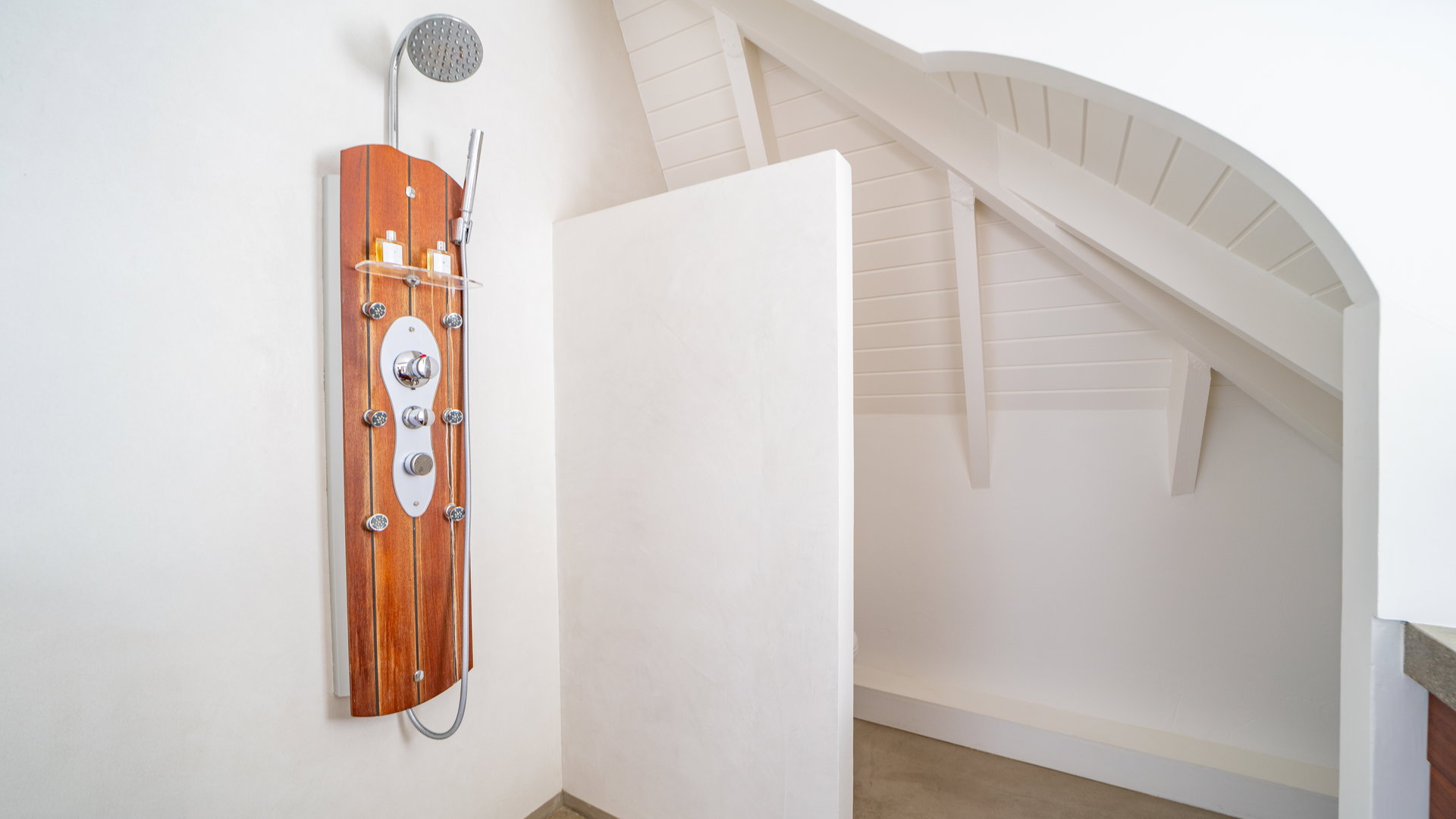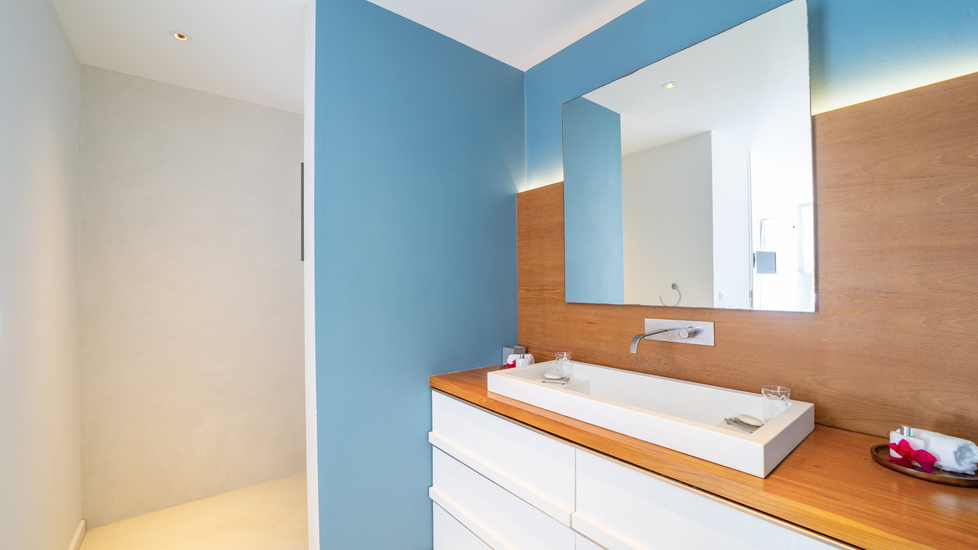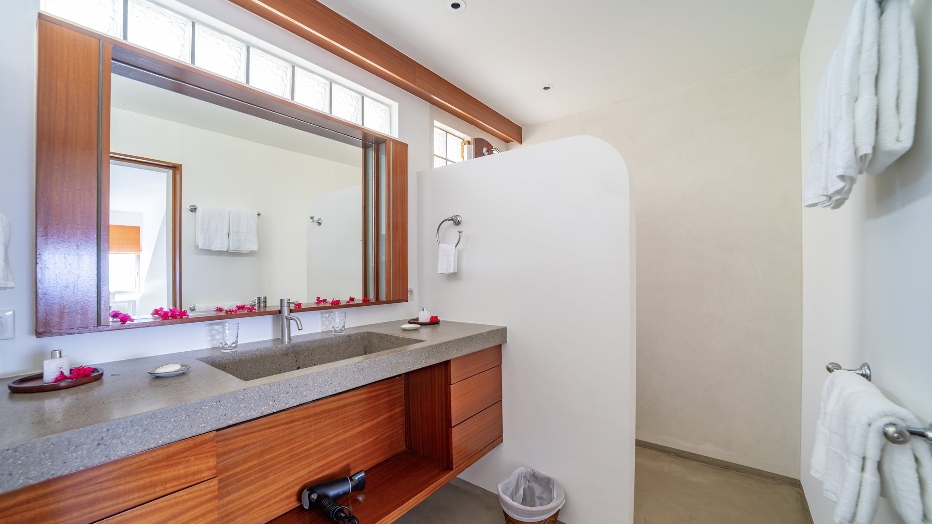 On the upper level. Twin beds, air conditioning, HD-TV with French channels, dressing room, safe. Private bathroom with bathtub, rain shower and regular shower, double sinks, hairdryer, bathrobes, towels and beach towels.