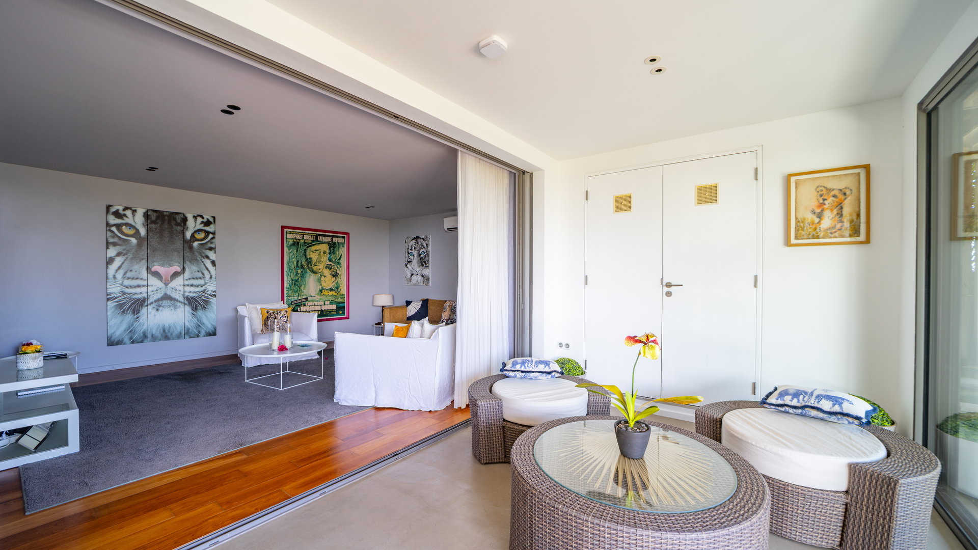 Each living room is fully air-conditioned, featuring soft sofas, colorful cushions, and a refined decor that invites relaxation 🛋️.