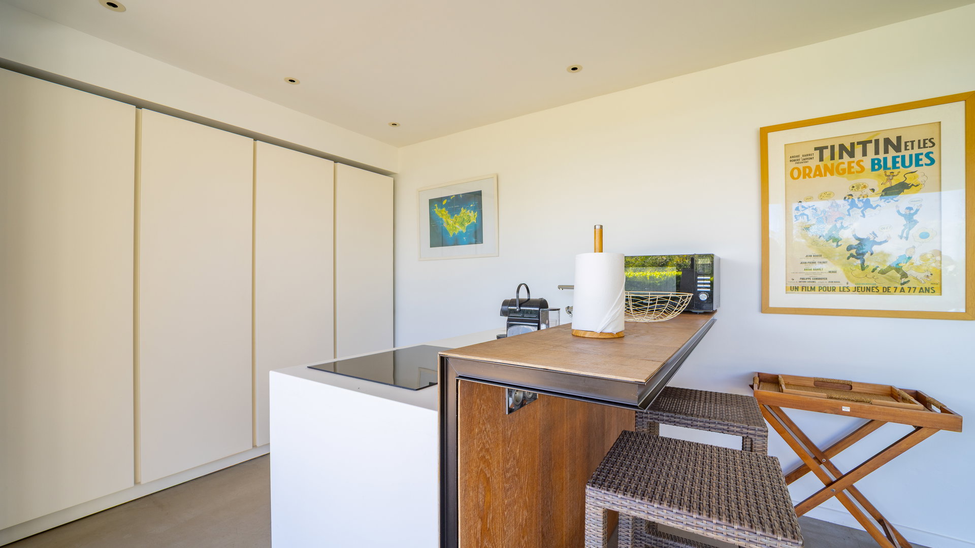 Fully equipped and air-conditioned. Breakfast bar and high stools for five guests. Refrigerator and freezer, electric oven, gas stove, microwave, dishwasher, electric coffee and Nespresso machine, toaster, blender, electric kettle.