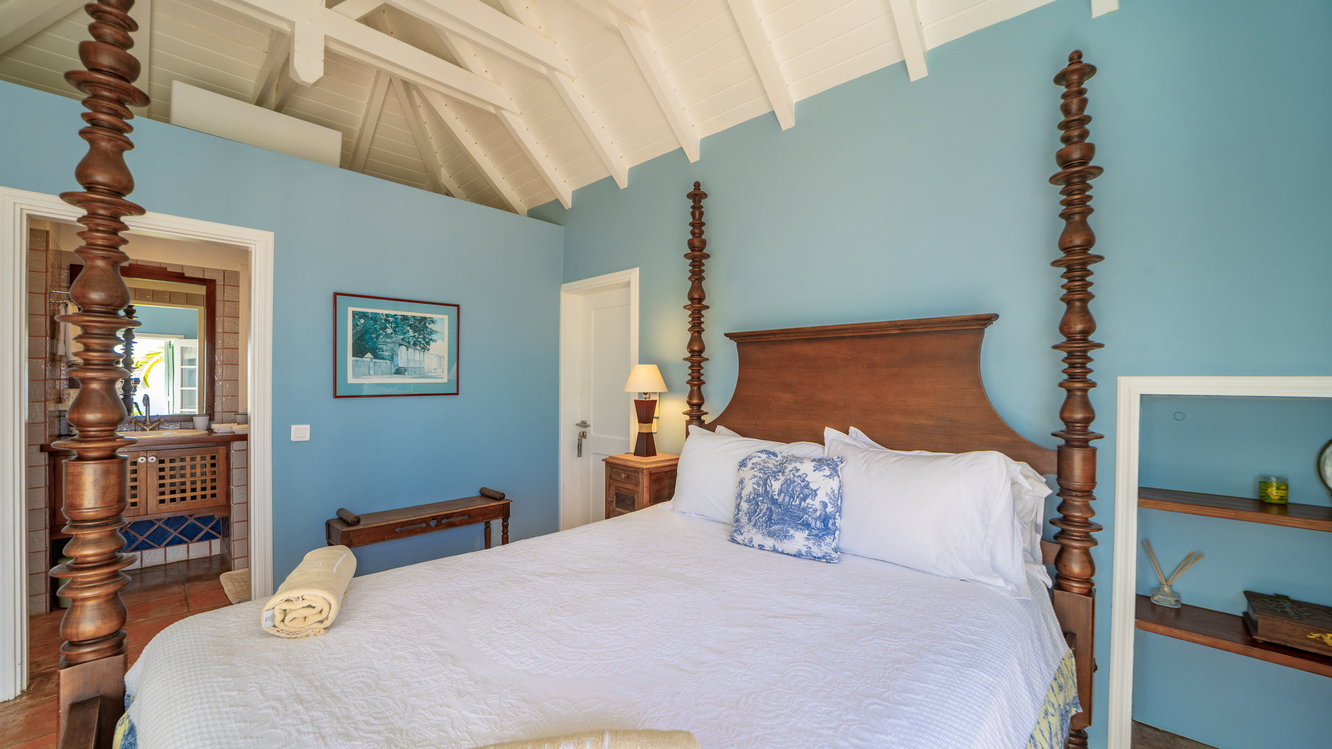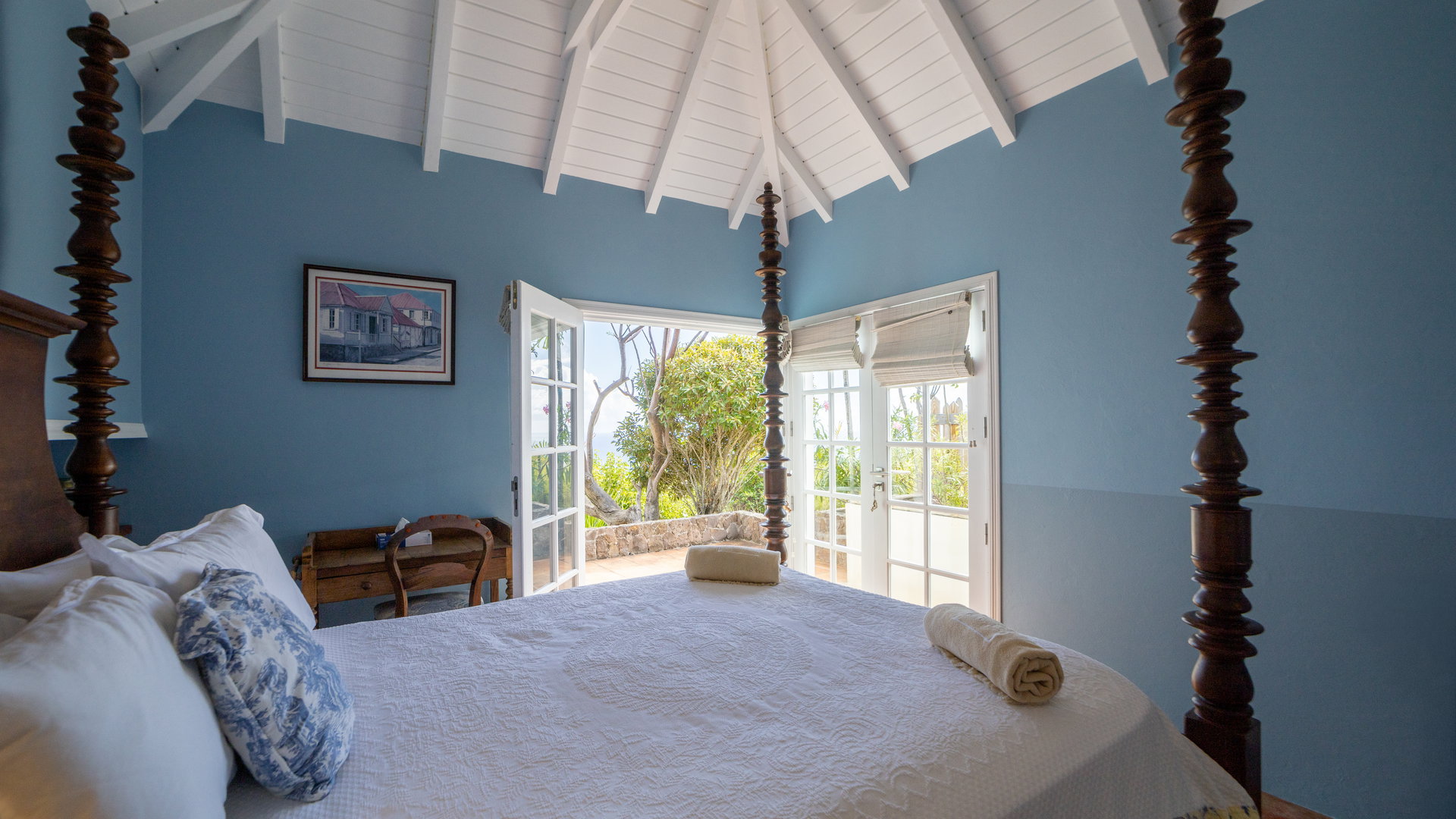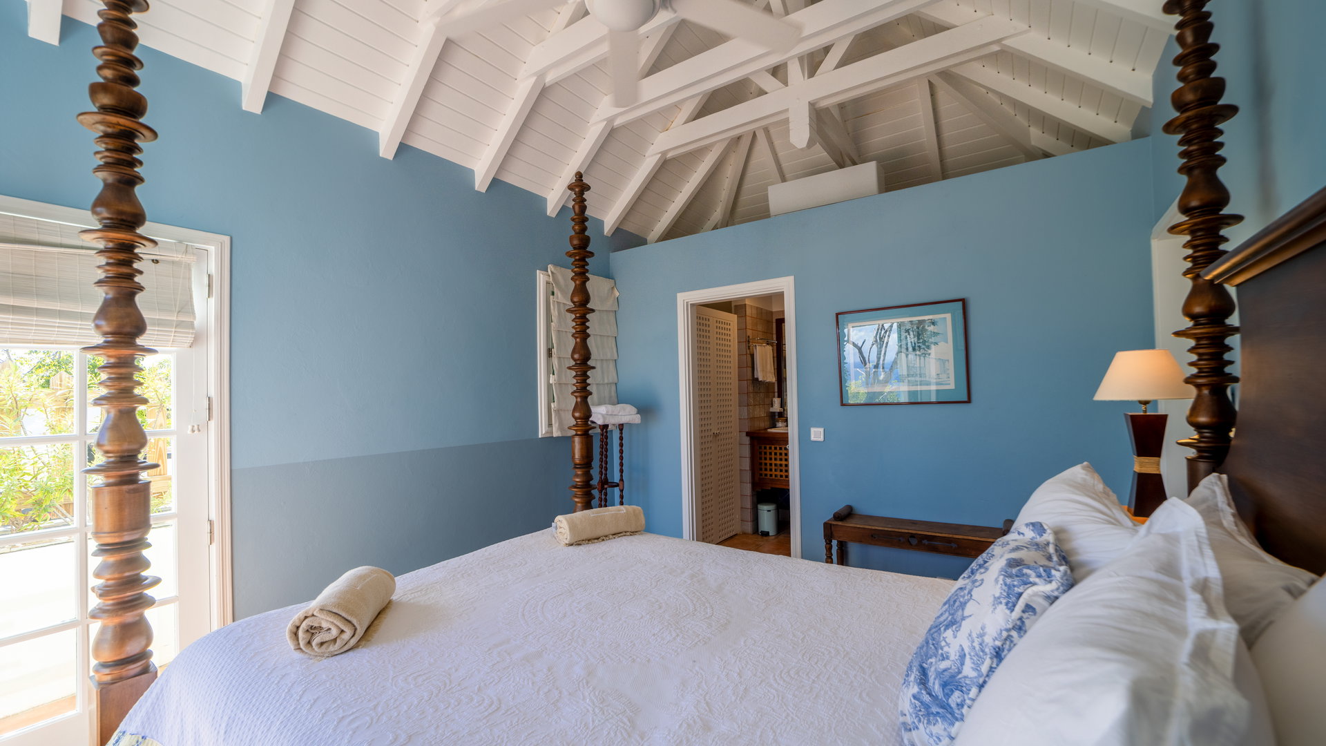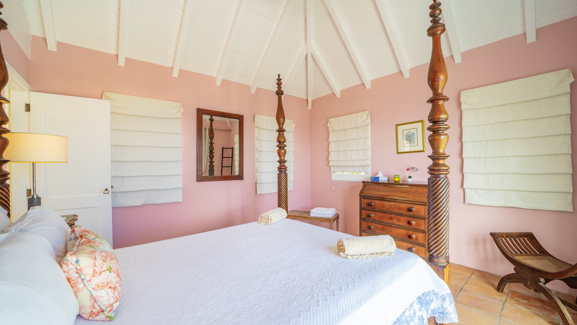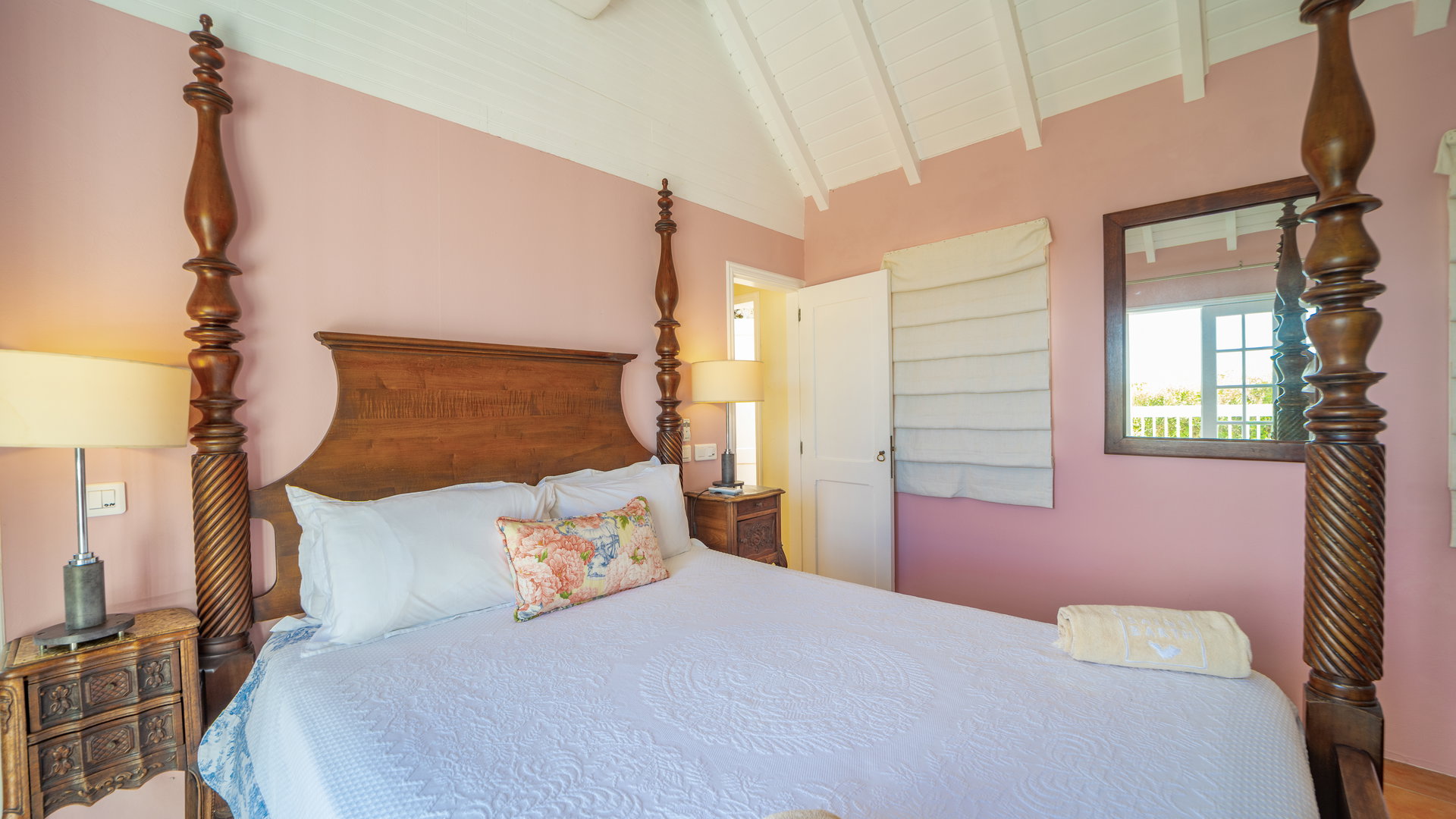 The villa features three air-conditioned bedrooms, each with a private ensuite bathroom. All are furnished with romantic king-size canopy beds draped in light fabrics, and each enjoys a stunning ocean view. The décor blends soft pastel blues and pinks, creating a refined, soothing atmosphere for restful nights by the sea.