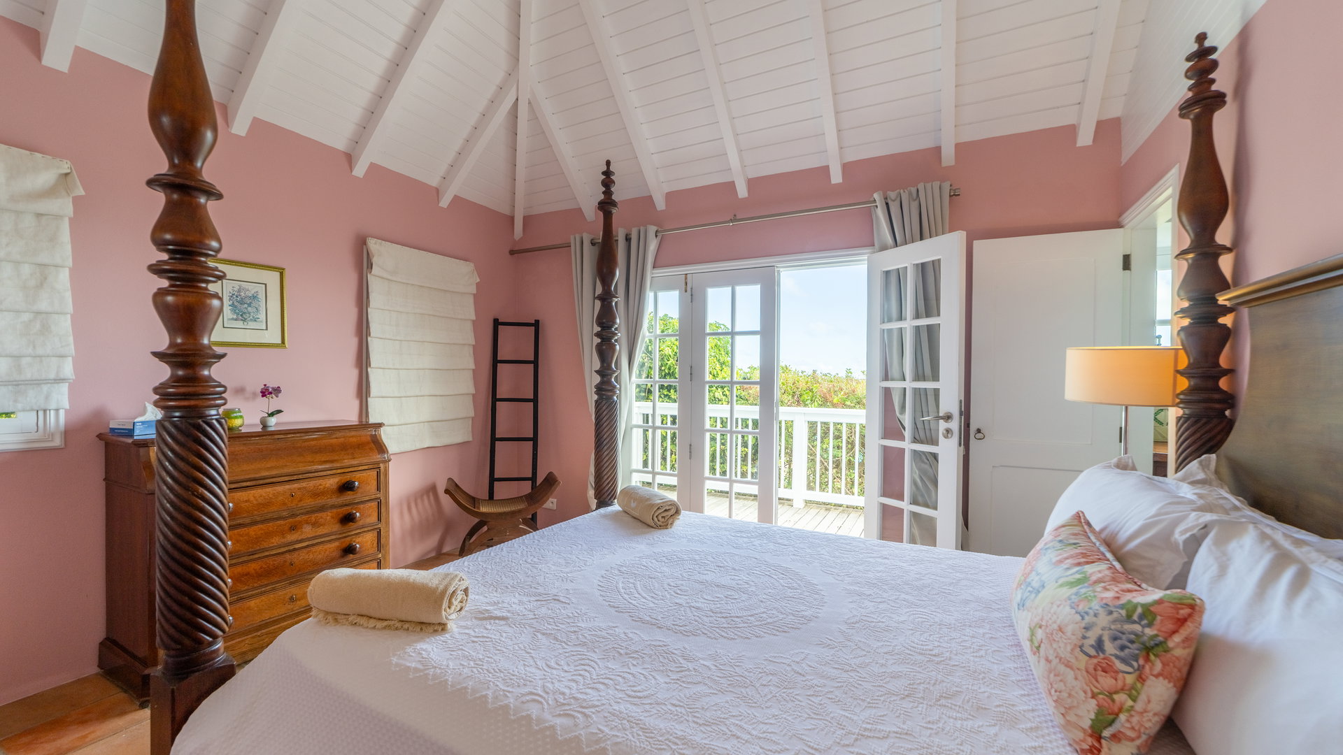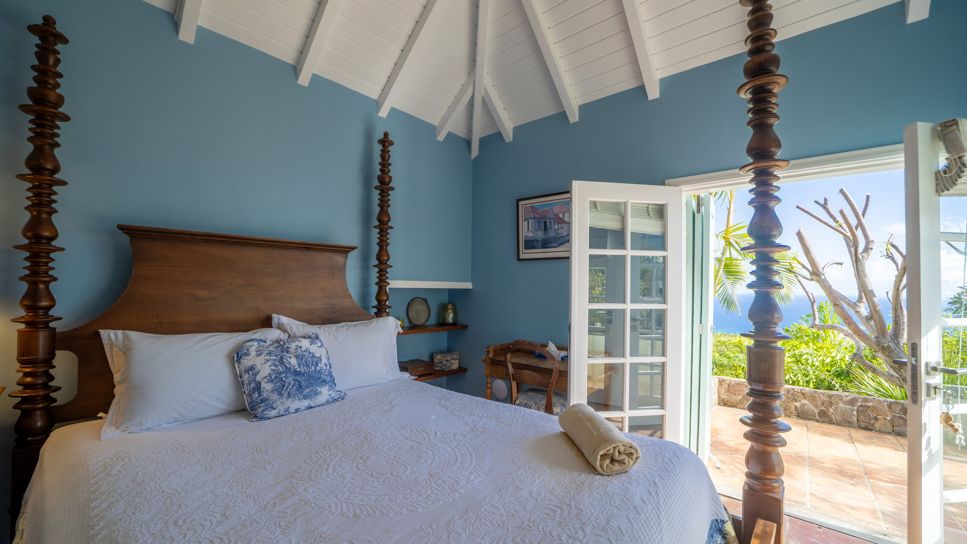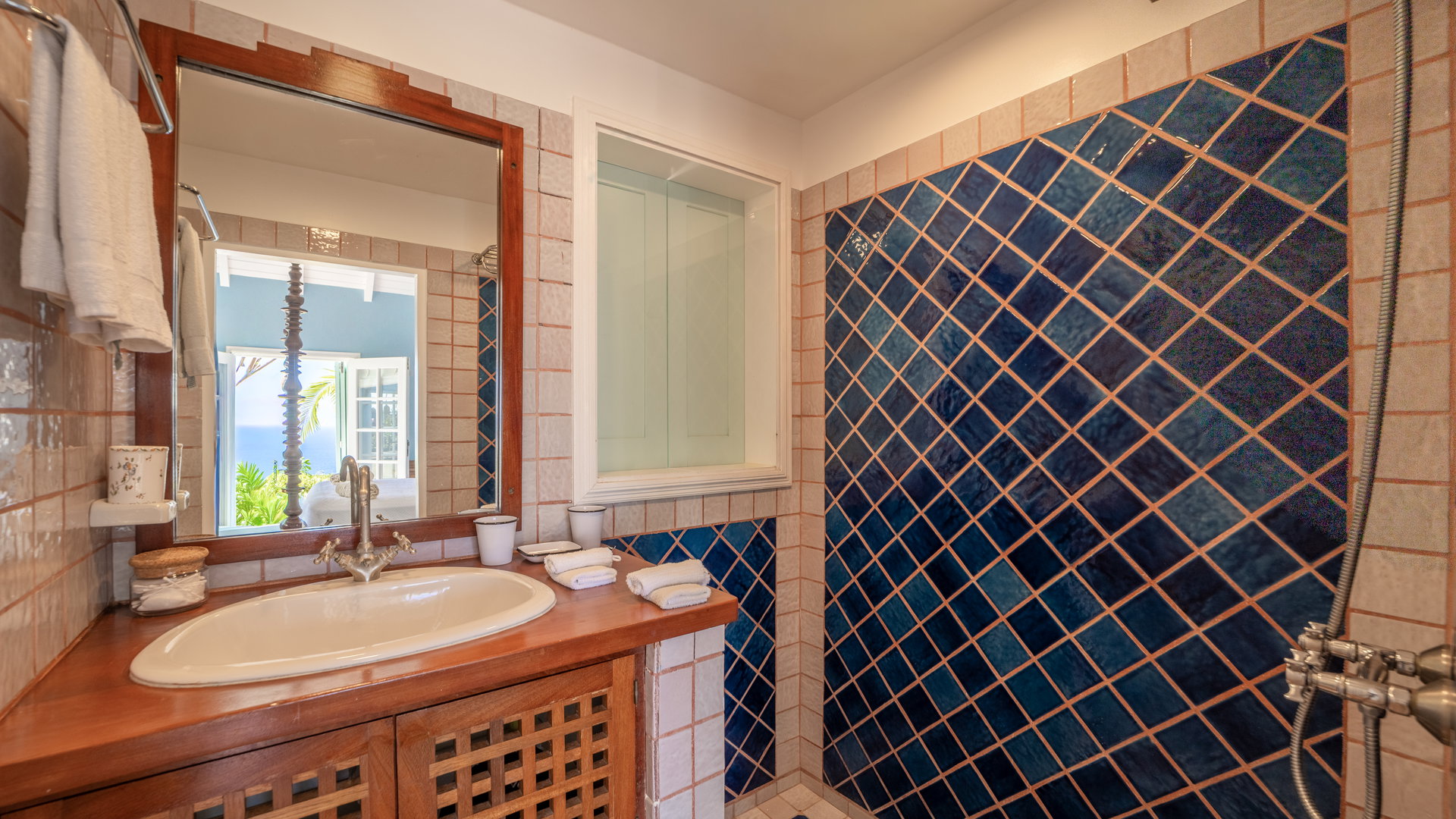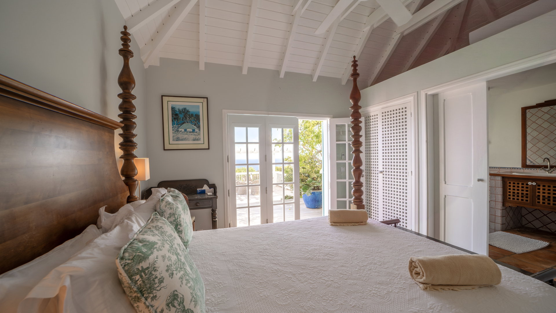 The villa features three air-conditioned bedrooms, each with a private ensuite bathroom. All are furnished with romantic king-size canopy beds draped in light fabrics, and each enjoys a stunning ocean view. The décor blends soft pastel blues and pinks, creating a refined, soothing atmosphere for restful nights by the sea.