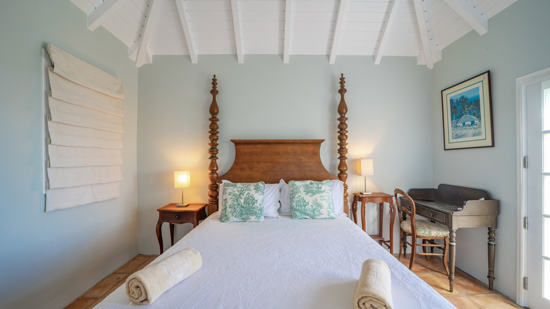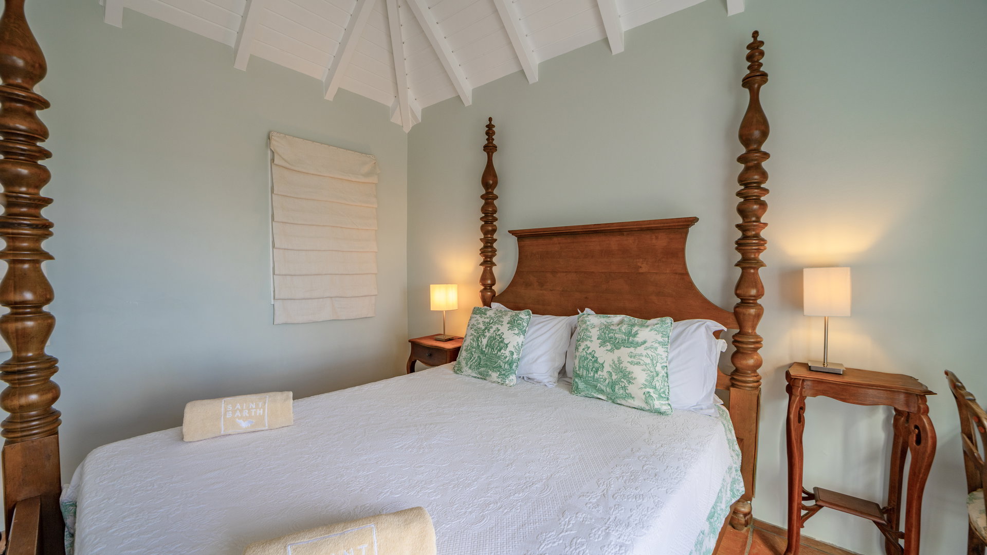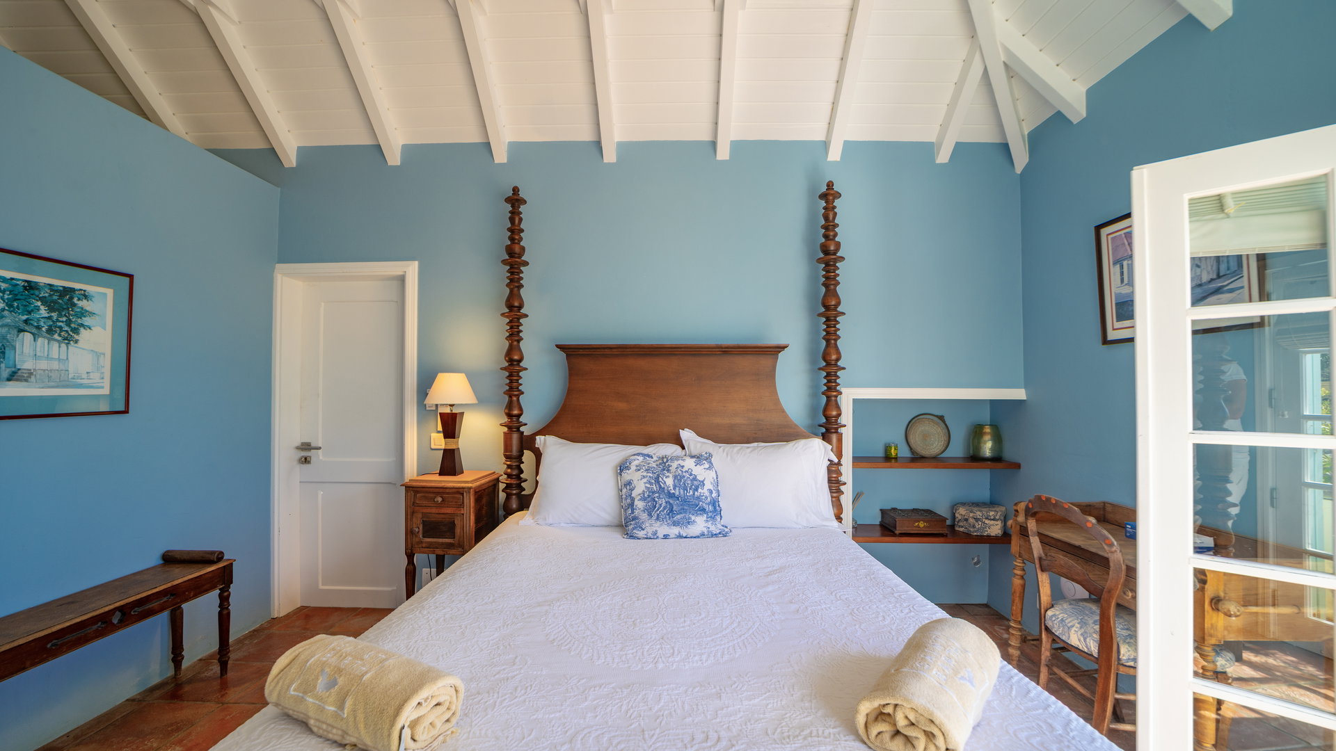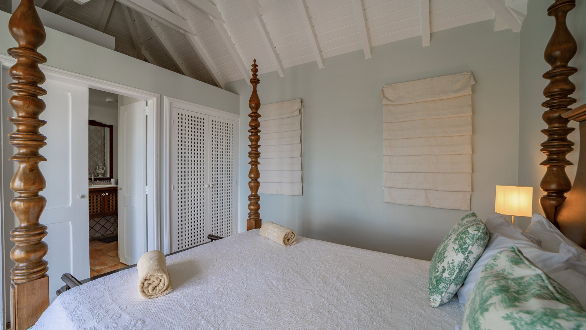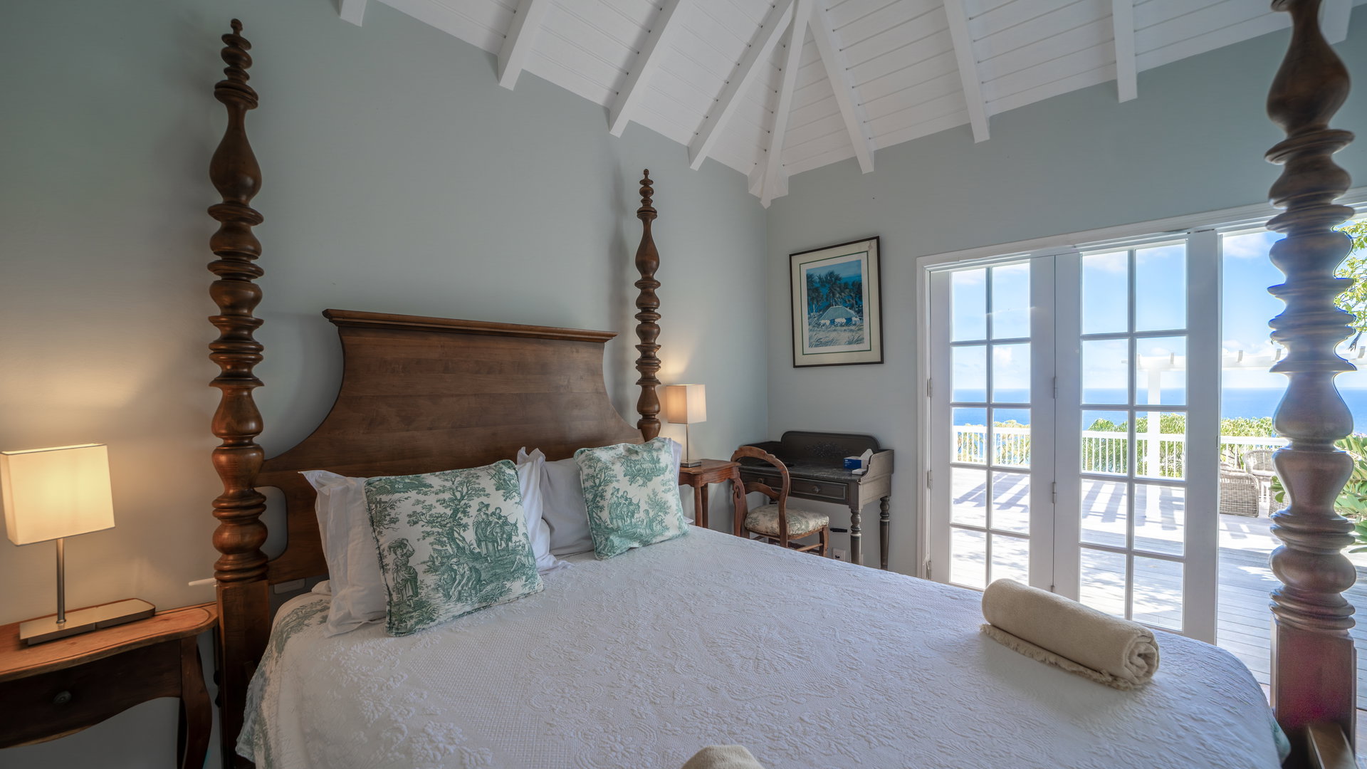 The villa features three air-conditioned bedrooms, each with a private ensuite bathroom. All are furnished with romantic king-size canopy beds draped in light fabrics, and each enjoys a stunning ocean view. The décor blends soft pastel blues and pinks, creating a refined, soothing atmosphere for restful nights by the sea.