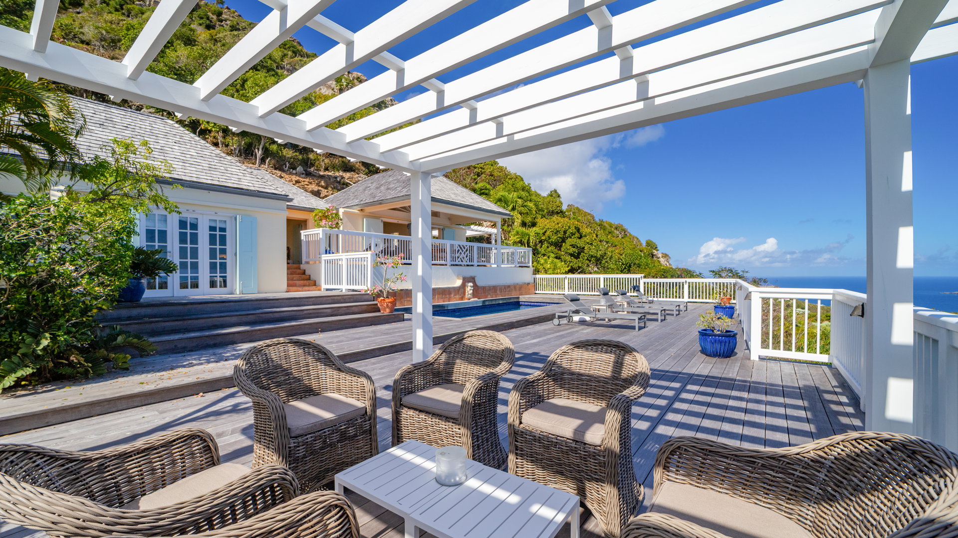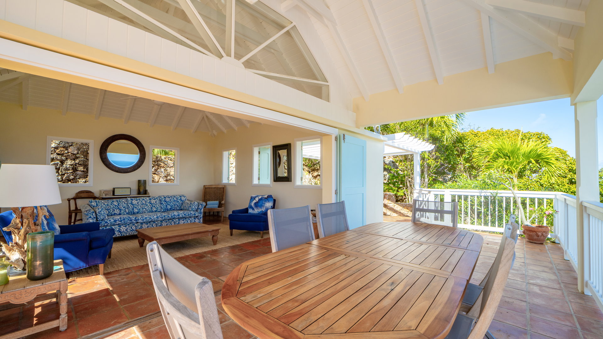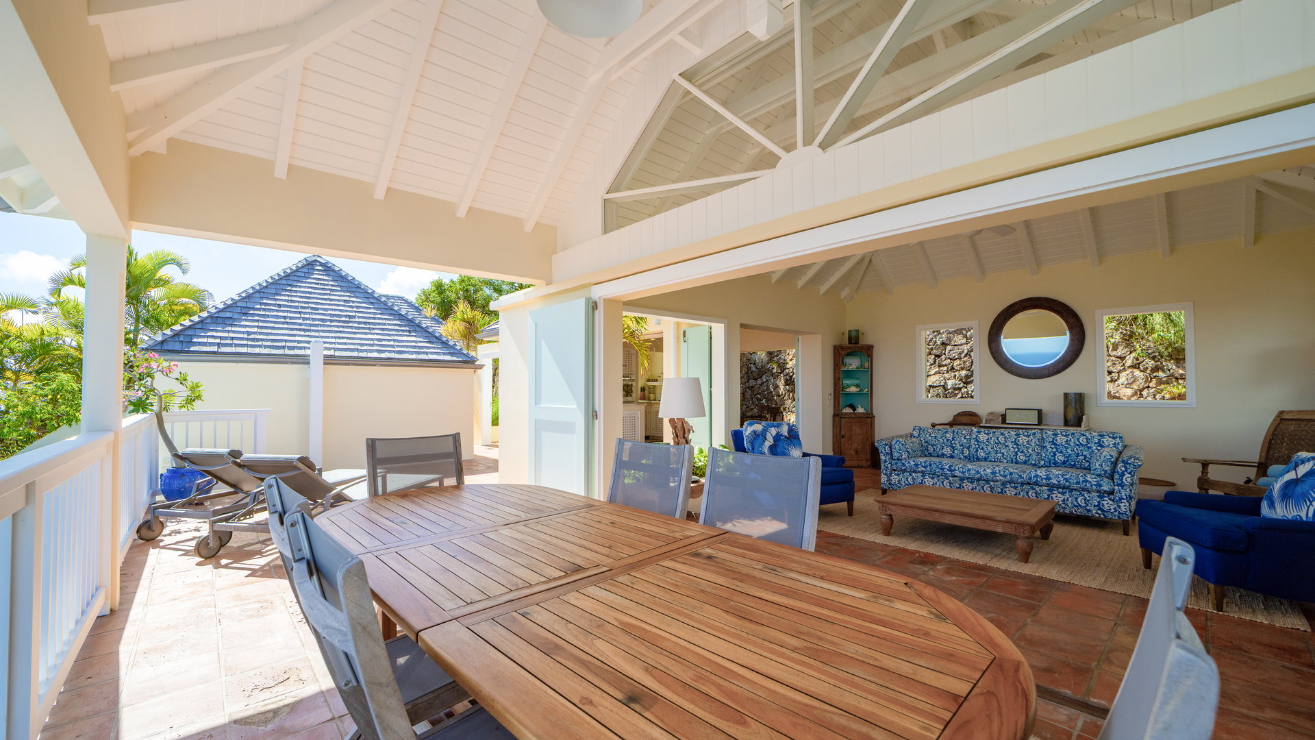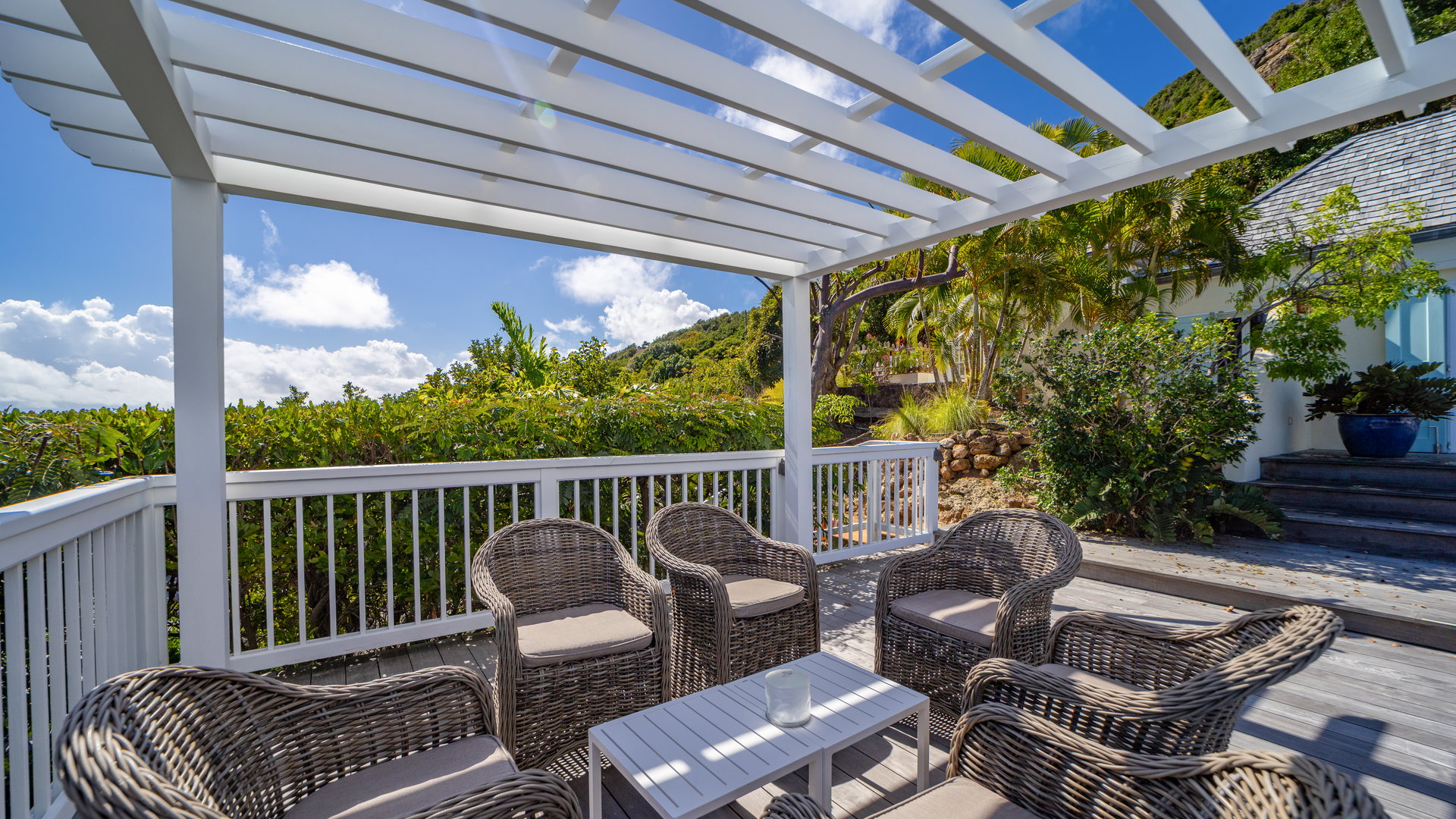The spacious terrace is home to a shimmering pool overlooking the sea, surrounded by sun loungers perfect for reading or sunbathing. A covered pergola shelters an alfresco dining area, ideal for meals enjoyed in the island’s gentle sunlight. A second outdoor dining space, nestled in lush greenery, provides a peaceful retreat amid tropical vegetation.