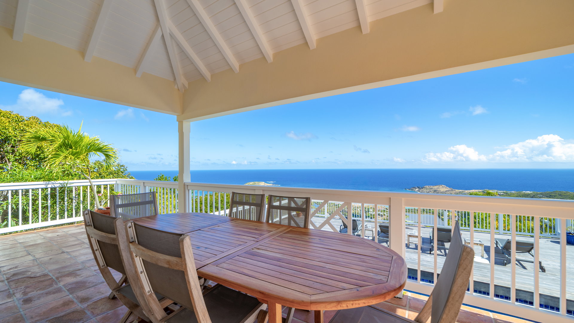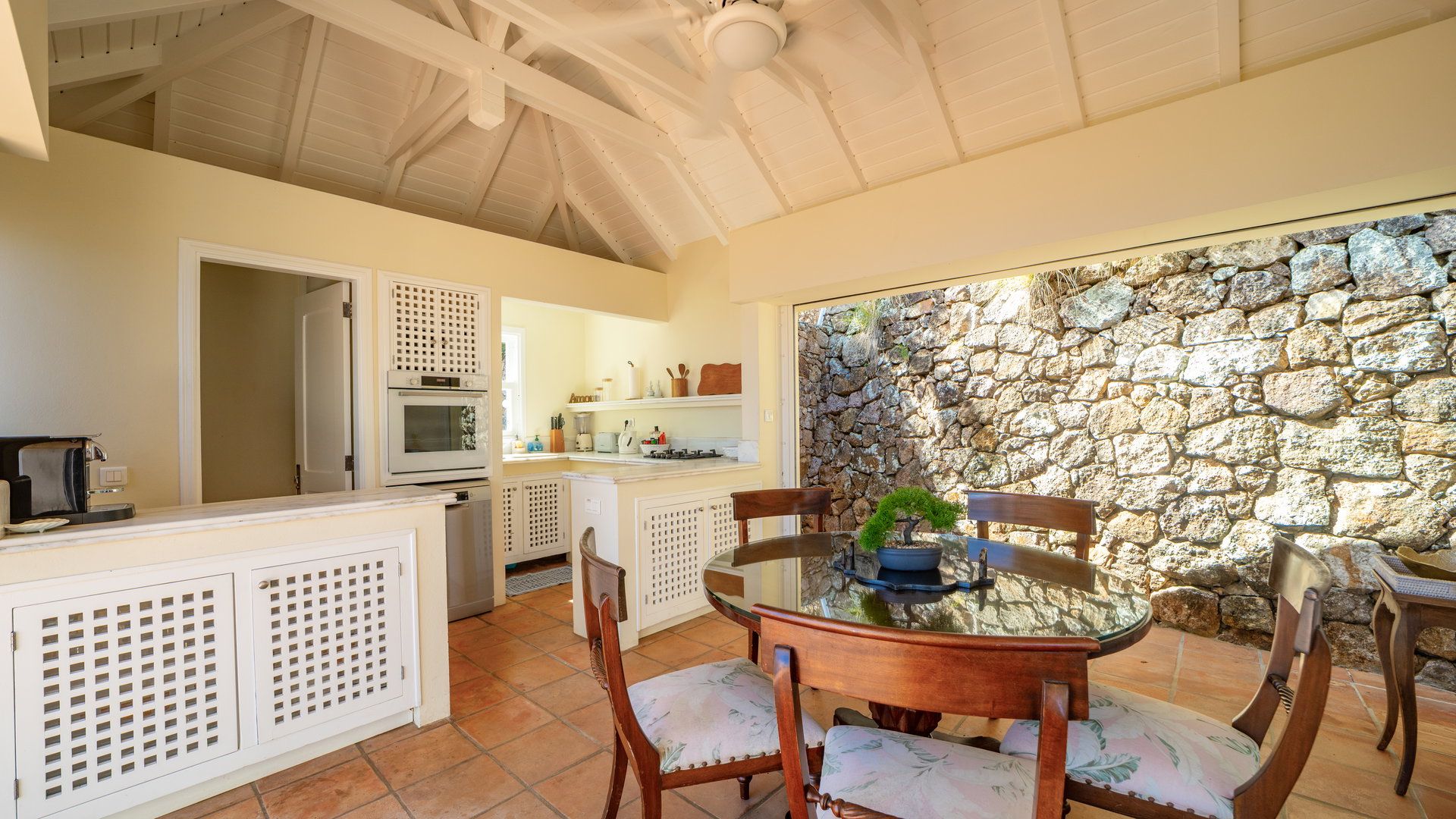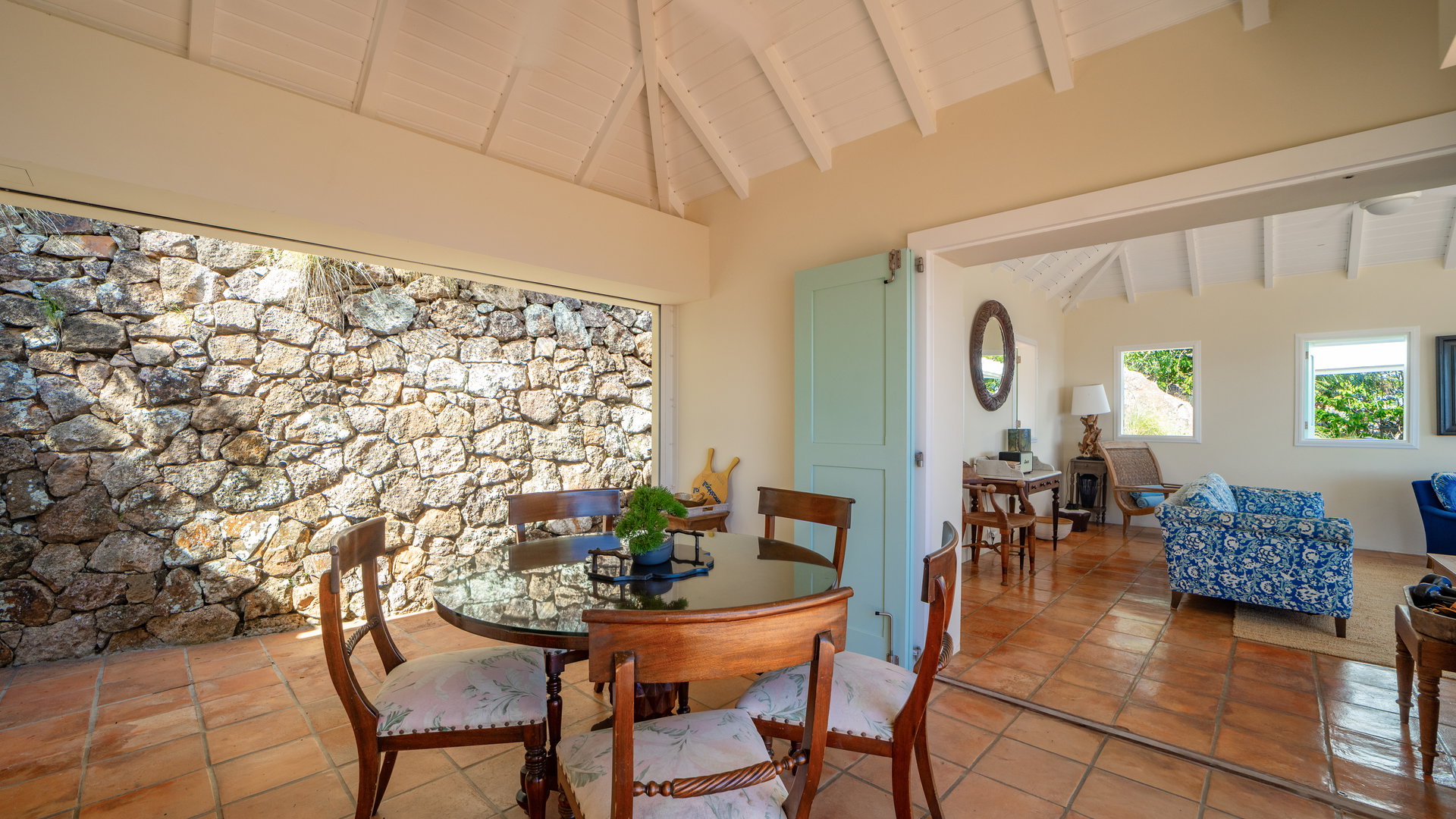 The spacious terrace is home to a shimmering pool overlooking the sea, surrounded by sun loungers perfect for reading or sunbathing. A covered pergola shelters an alfresco dining area, ideal for meals enjoyed in the island’s gentle sunlight. A second outdoor dining space, nestled in lush greenery, provides a peaceful retreat amid tropical vegetation.