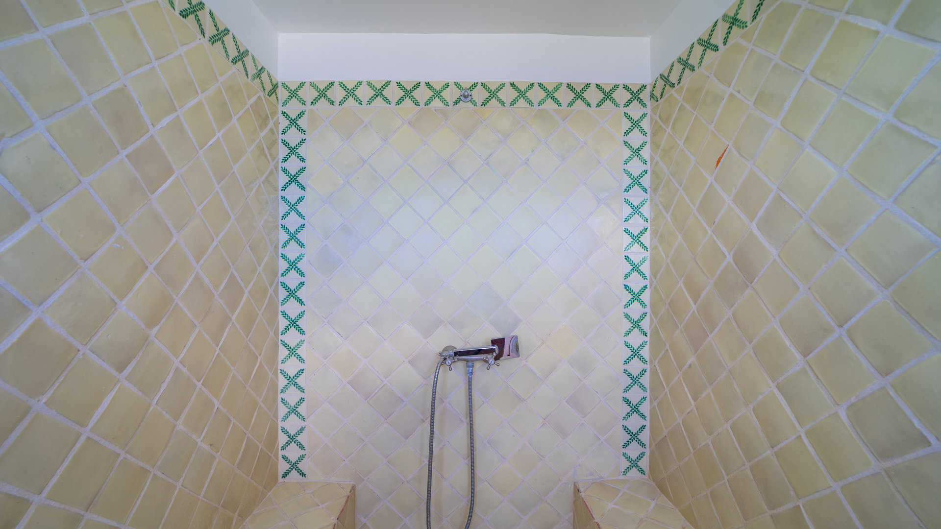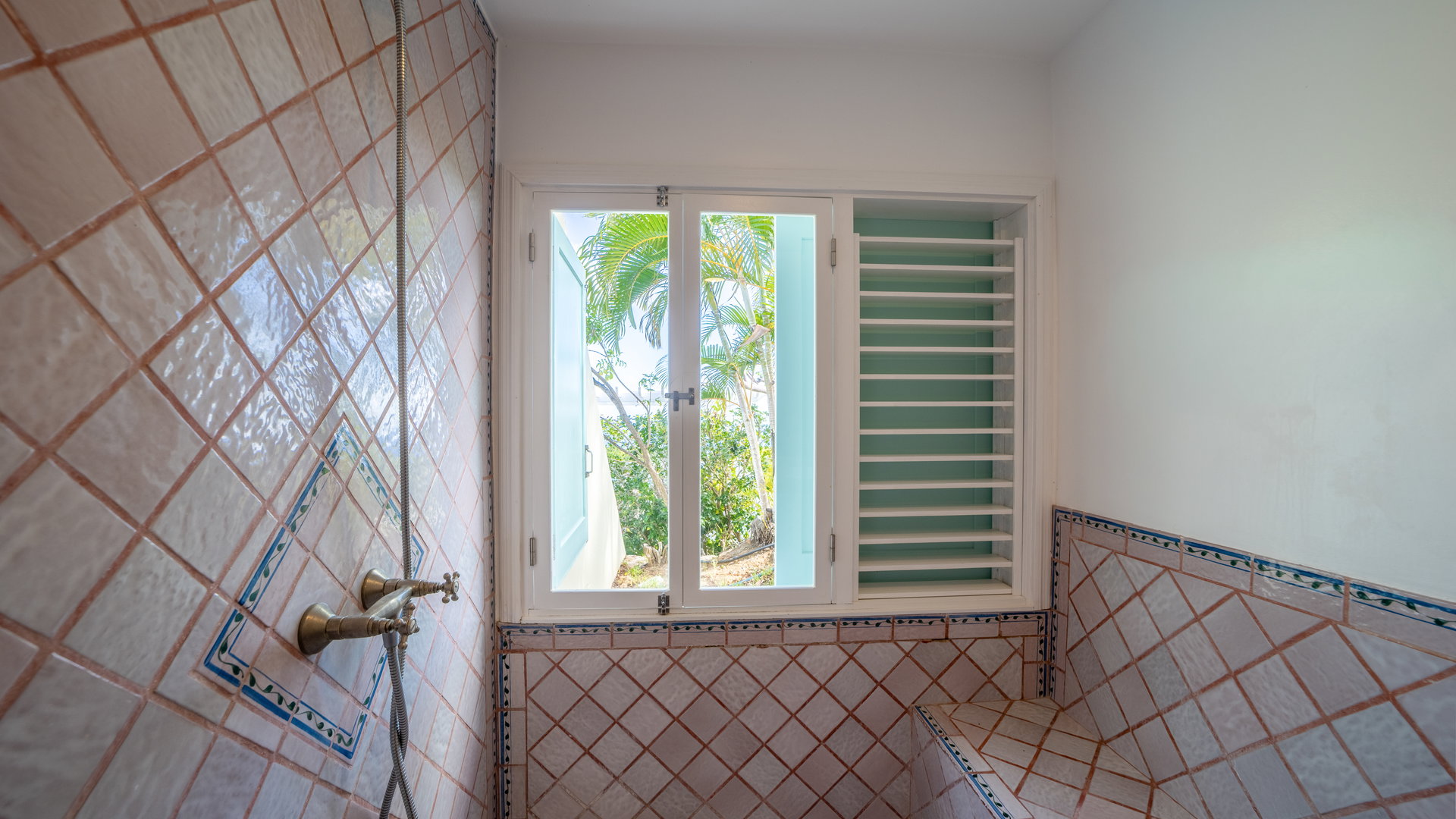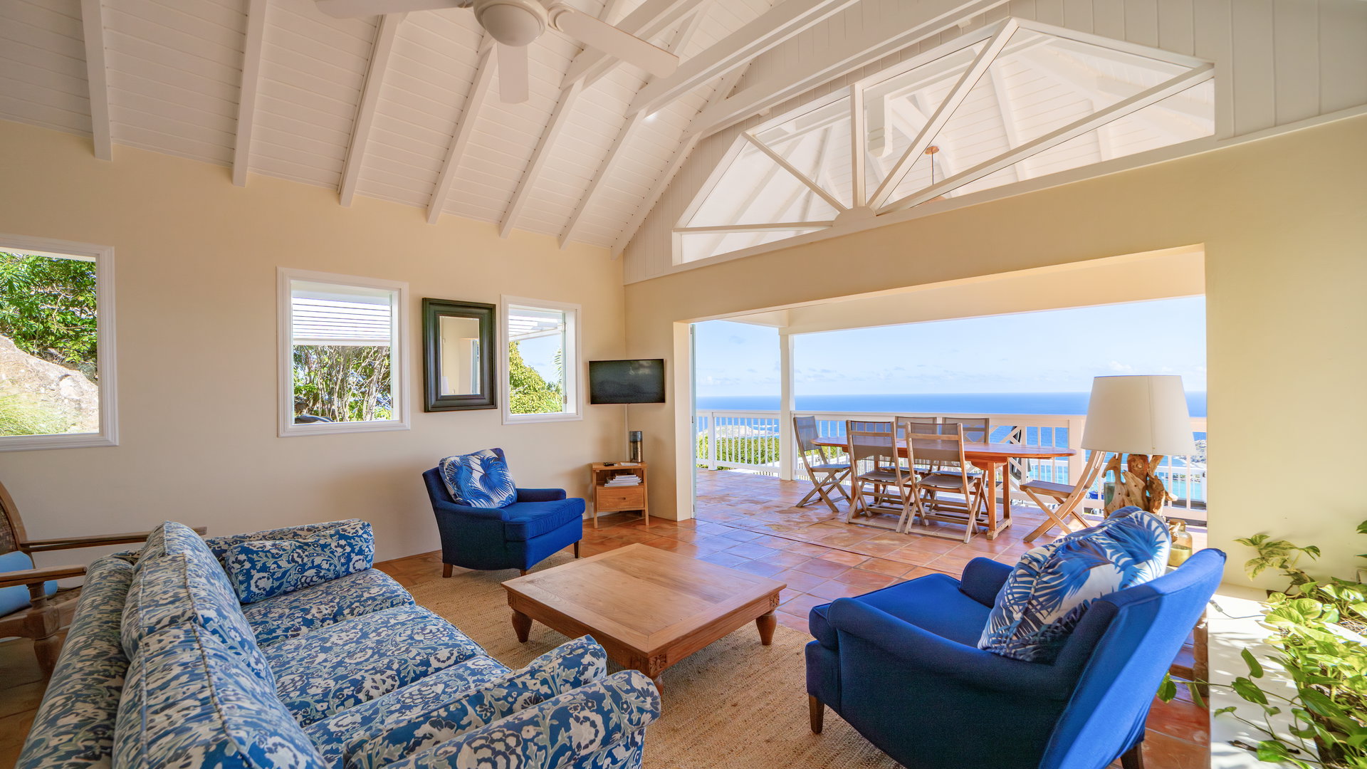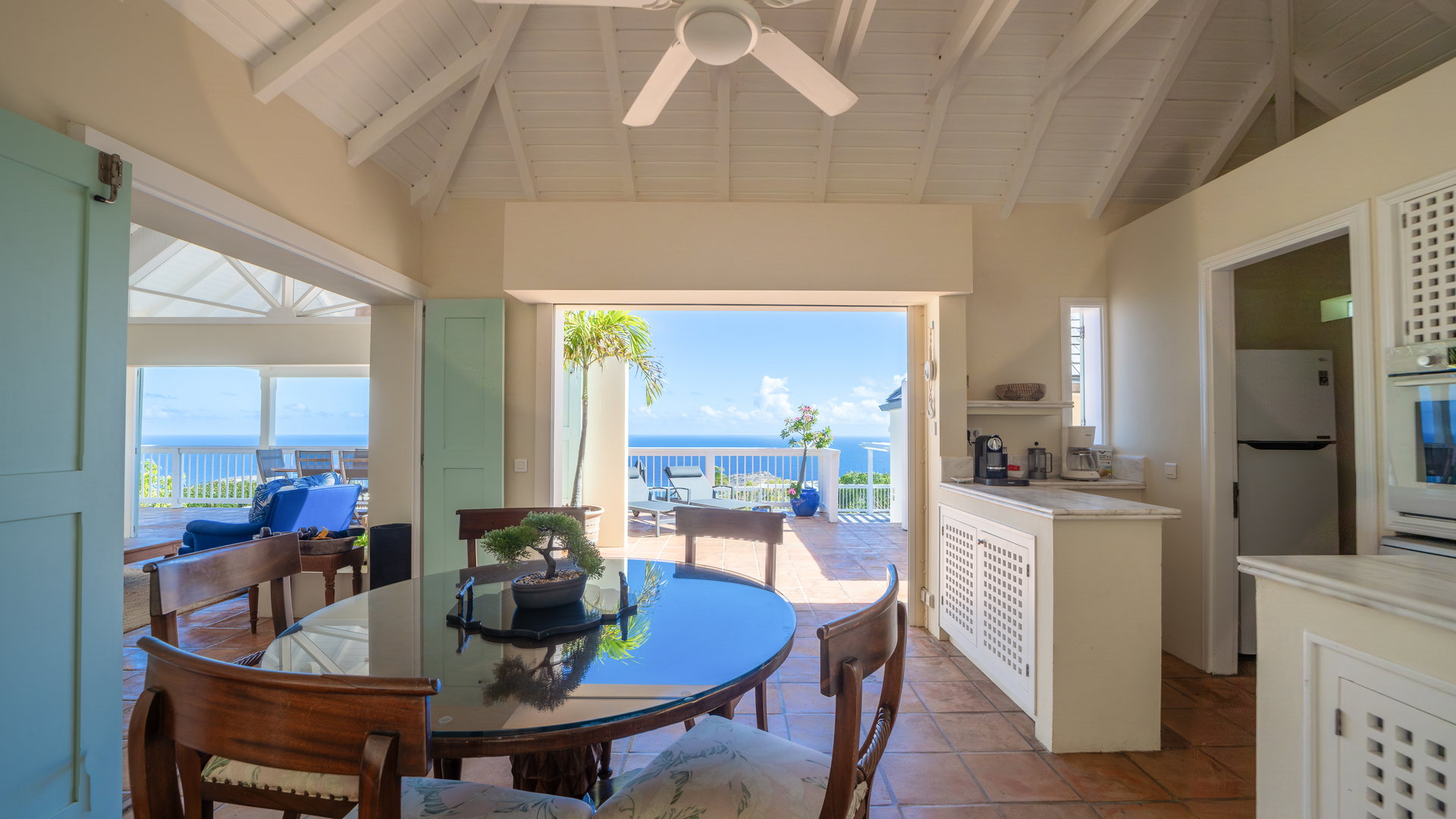 The spacious terrace is home to a shimmering pool overlooking the sea, surrounded by sun loungers perfect for reading or sunbathing. A covered pergola shelters an alfresco dining area, ideal for meals enjoyed in the island’s gentle sunlight. A second outdoor dining space, nestled in lush greenery, provides a peaceful retreat amid tropical vegetation.