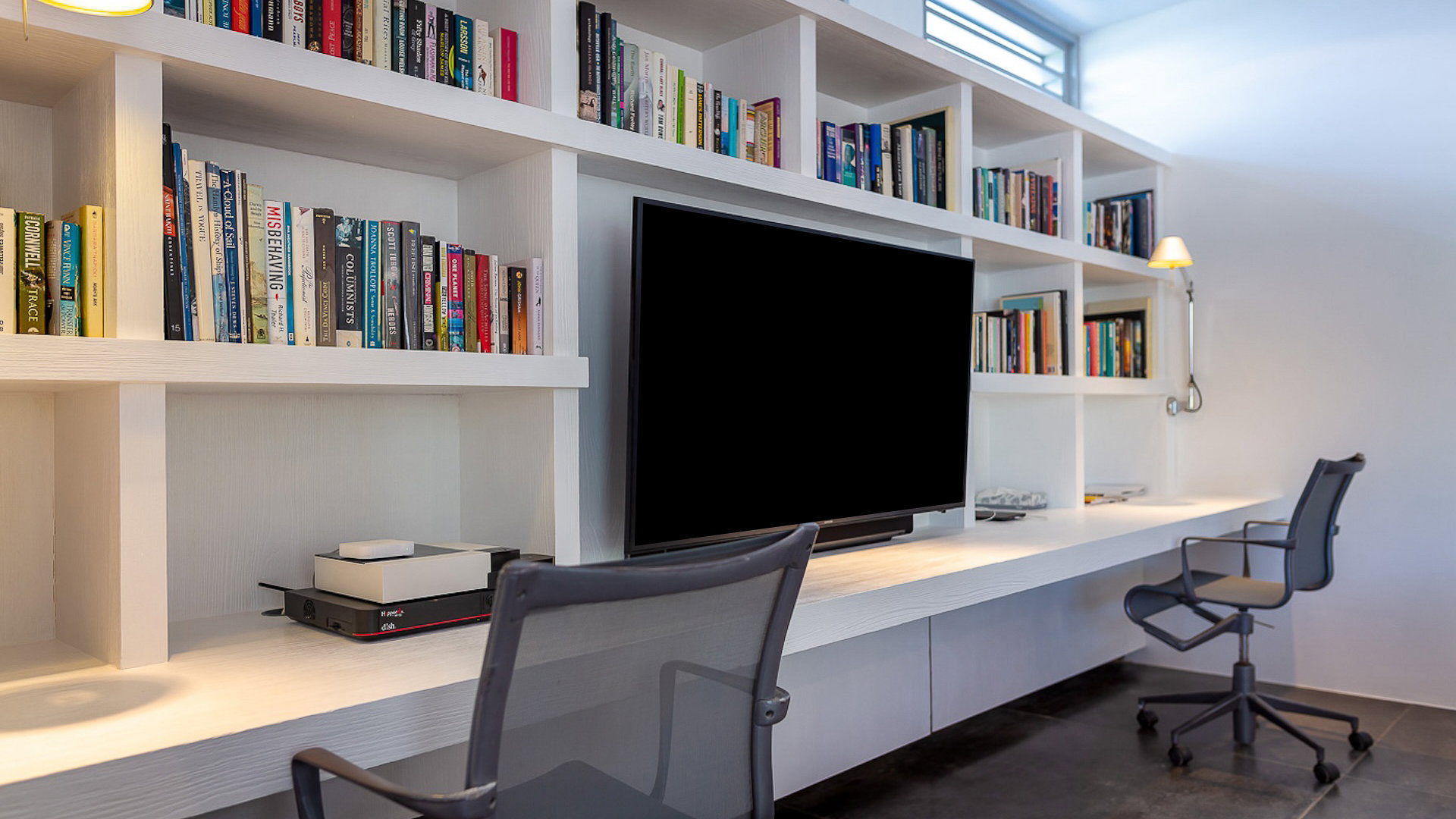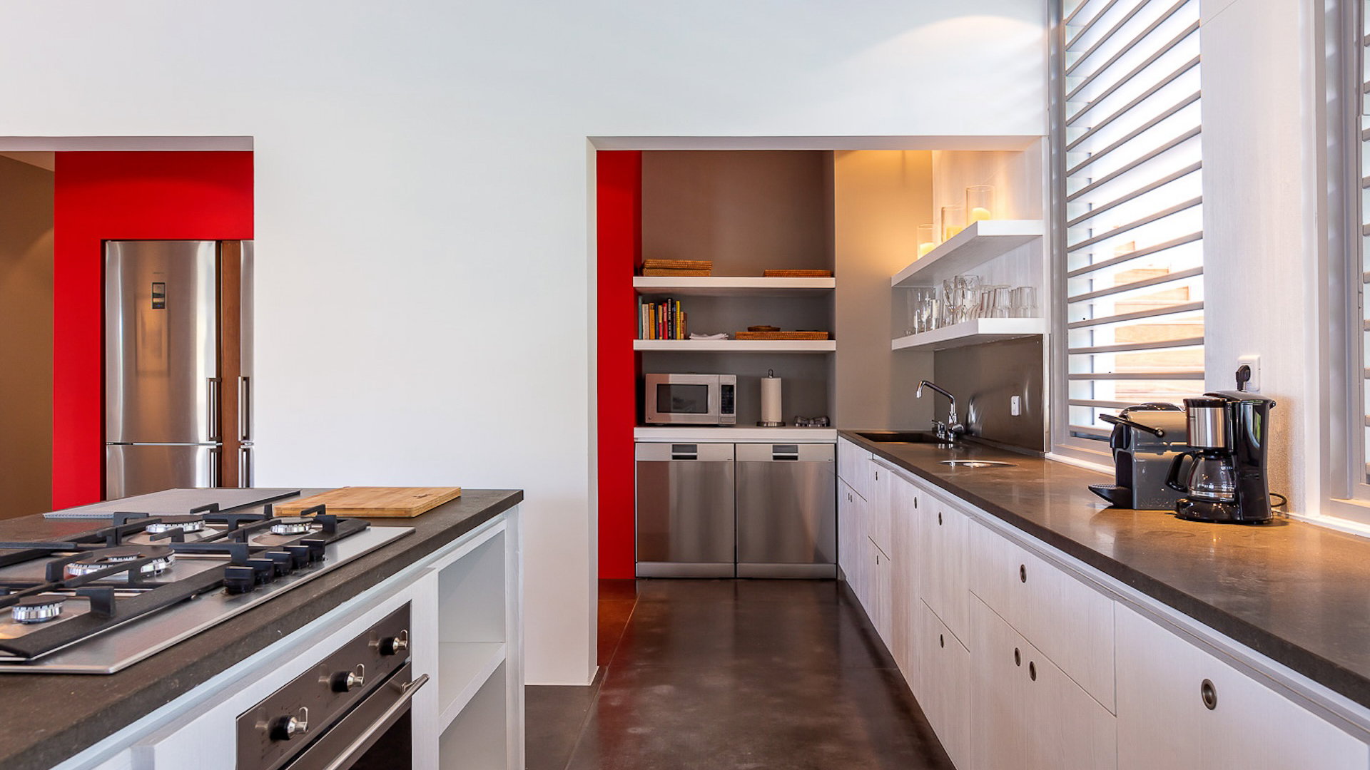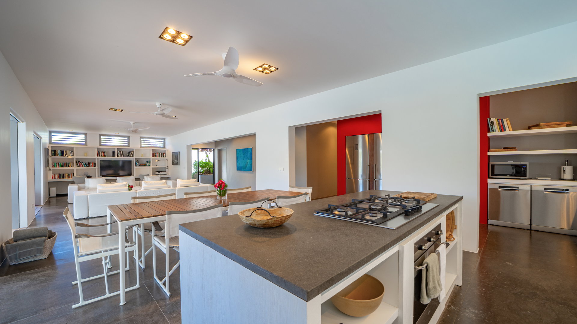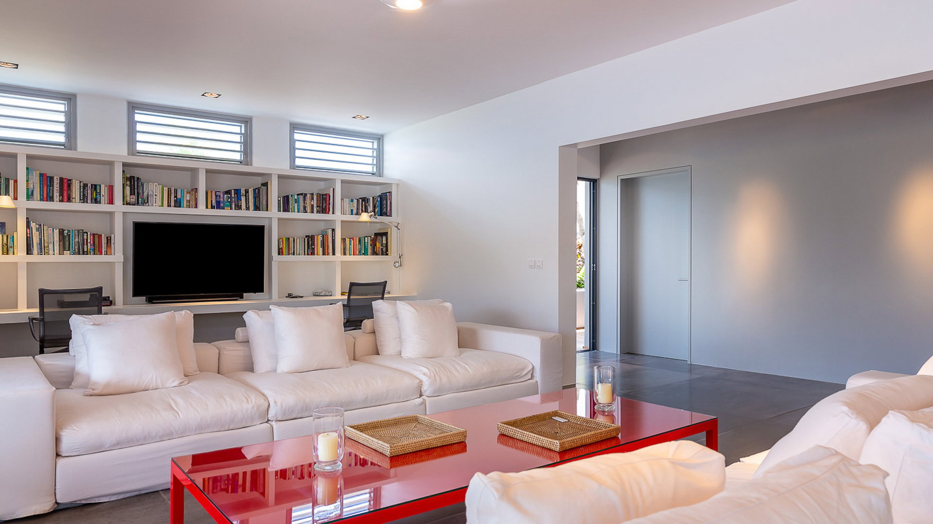 Spread over two levels, the villa combines modern design with a soft, refined atmosphere. The spacious living room features comfortable sofas, a flat-screen TV, and a well-stocked library, creating a cozy and inviting environment. The fully equipped kitchen, in a chic shade of red, adds warmth and personality to the villa’s contemporary style. Large windows open onto the covered terrace, where natural light and the shimmering sea blend harmoniously.