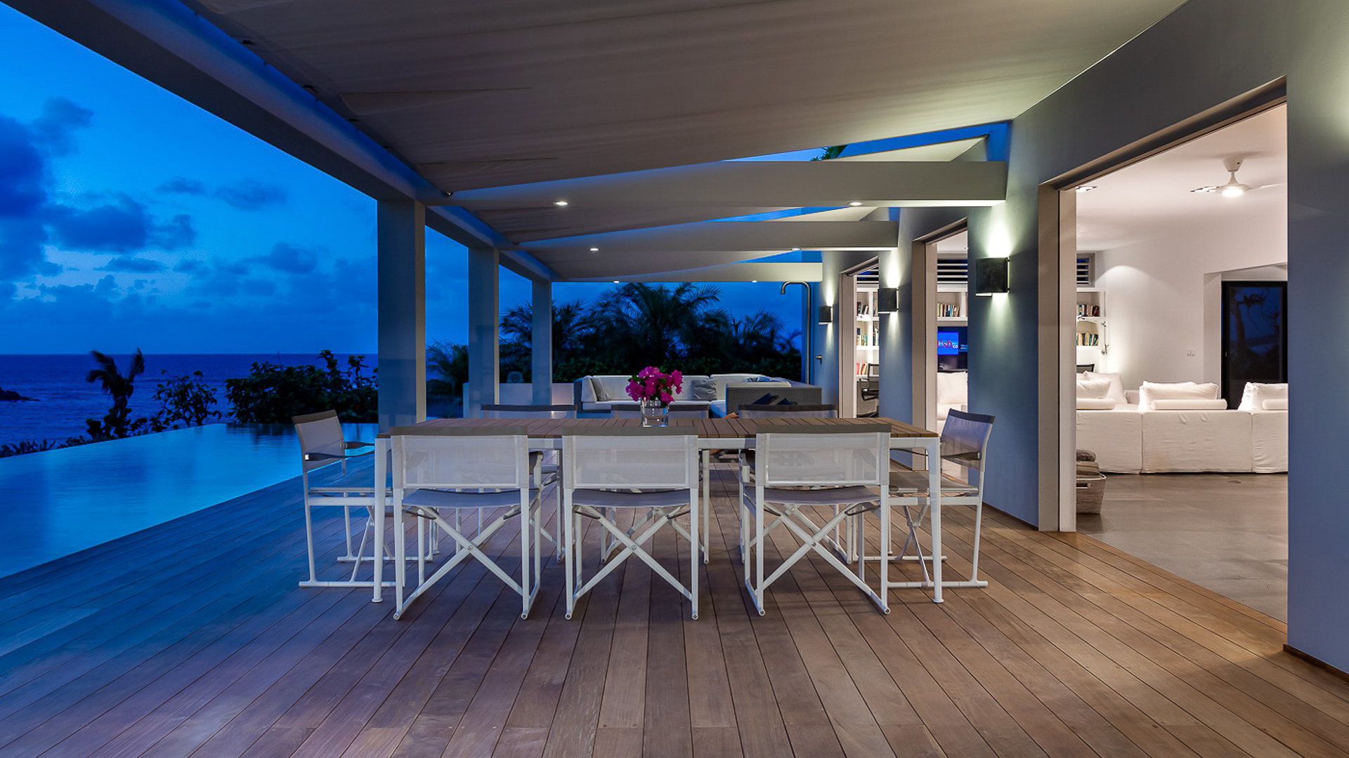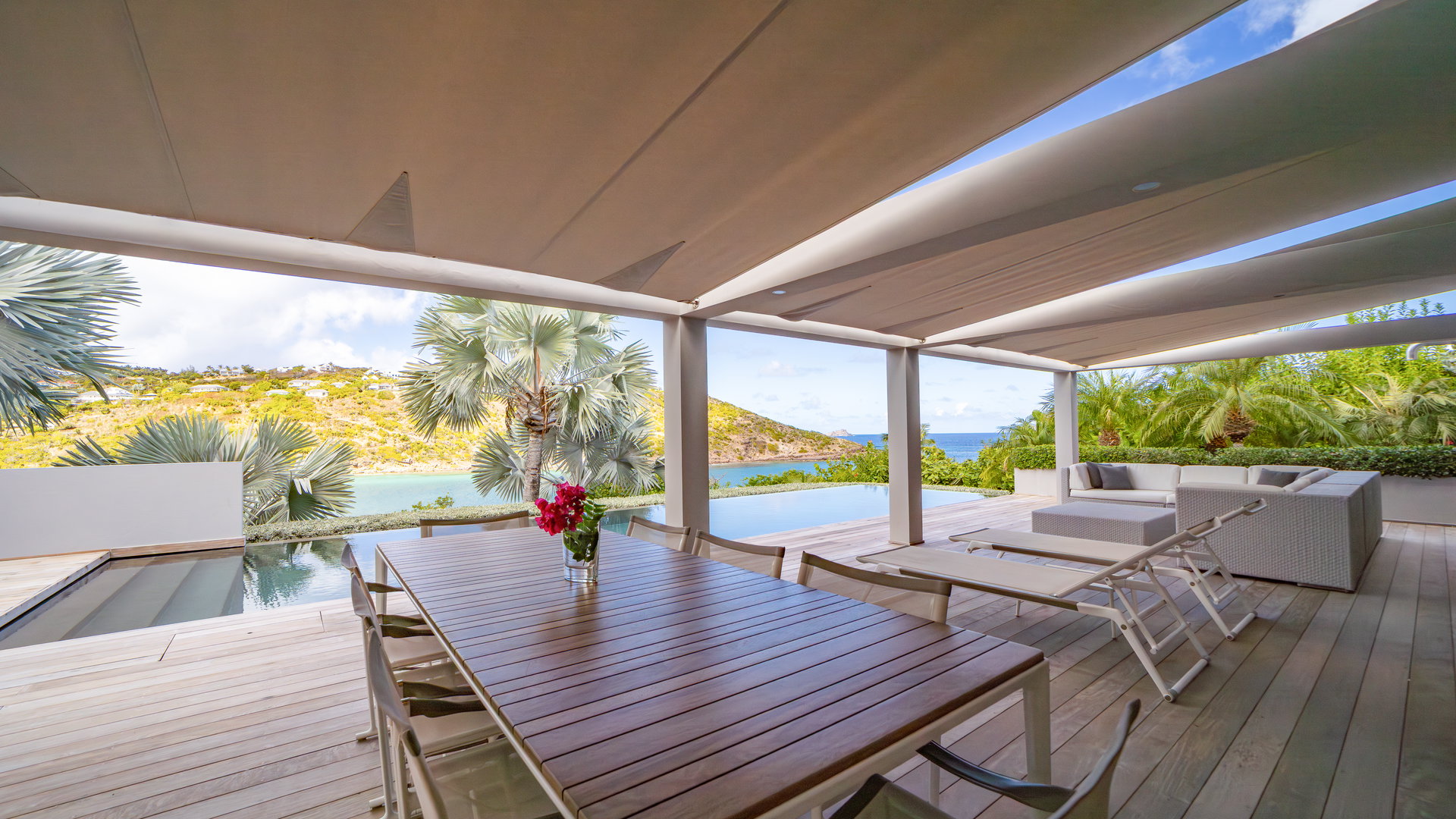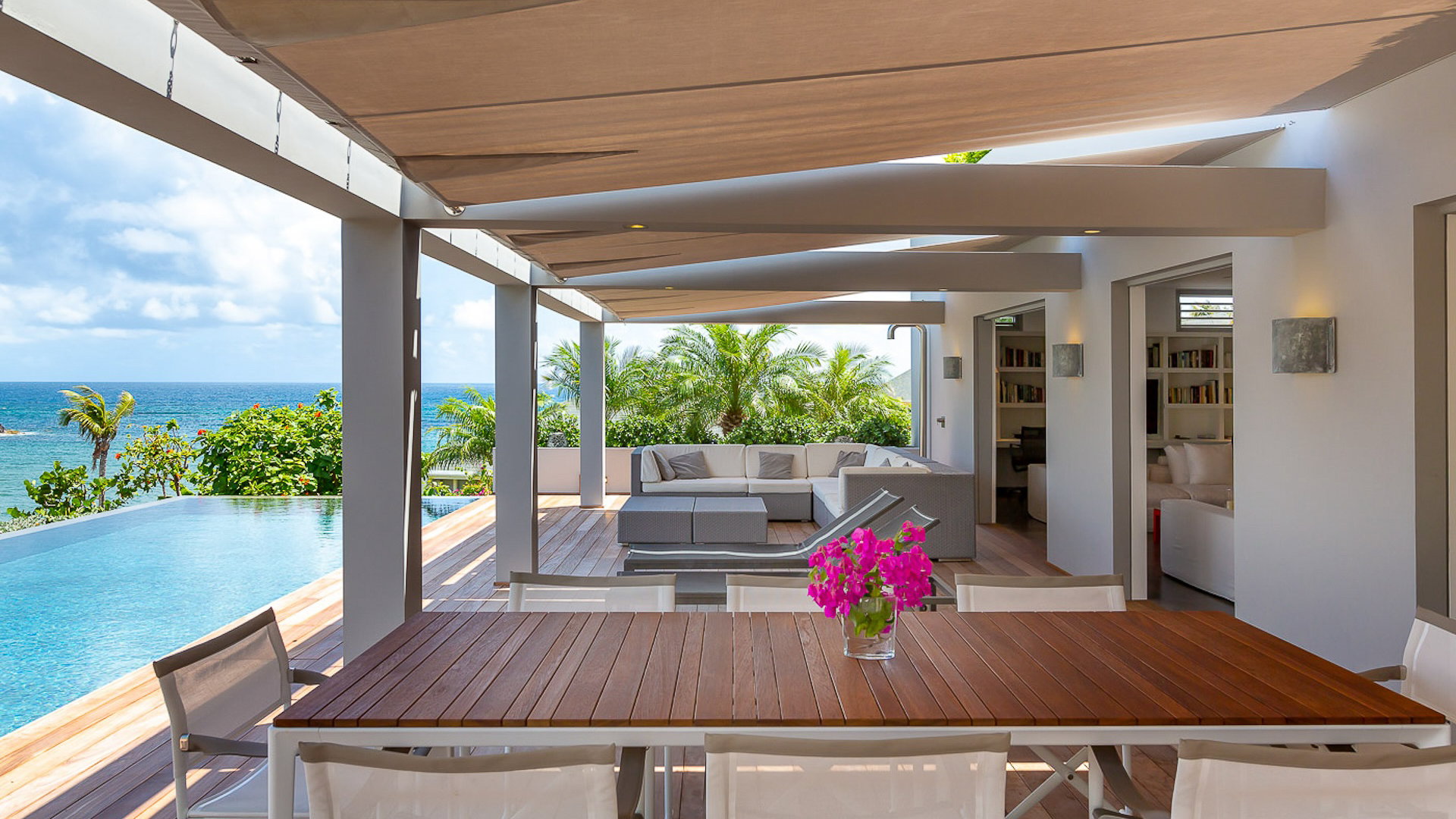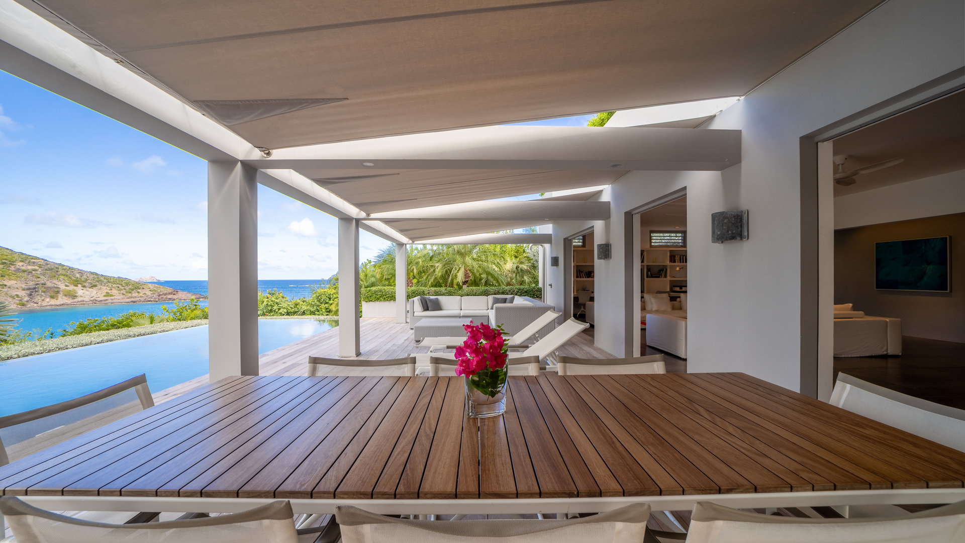 The main terrace unfolds around the infinity pool overlooking the bay. Under shade sails, the al fresco dining area provides a perfect setting for sunset dinners, while a softly furnished outdoor lounge invites relaxation. On the sunny wooden deck, elegant loungers await for moments of pure tranquility. A private path leads down to a small dock, where you can take a swim or simply enjoy the Caribbean’s gentle rhythm.
