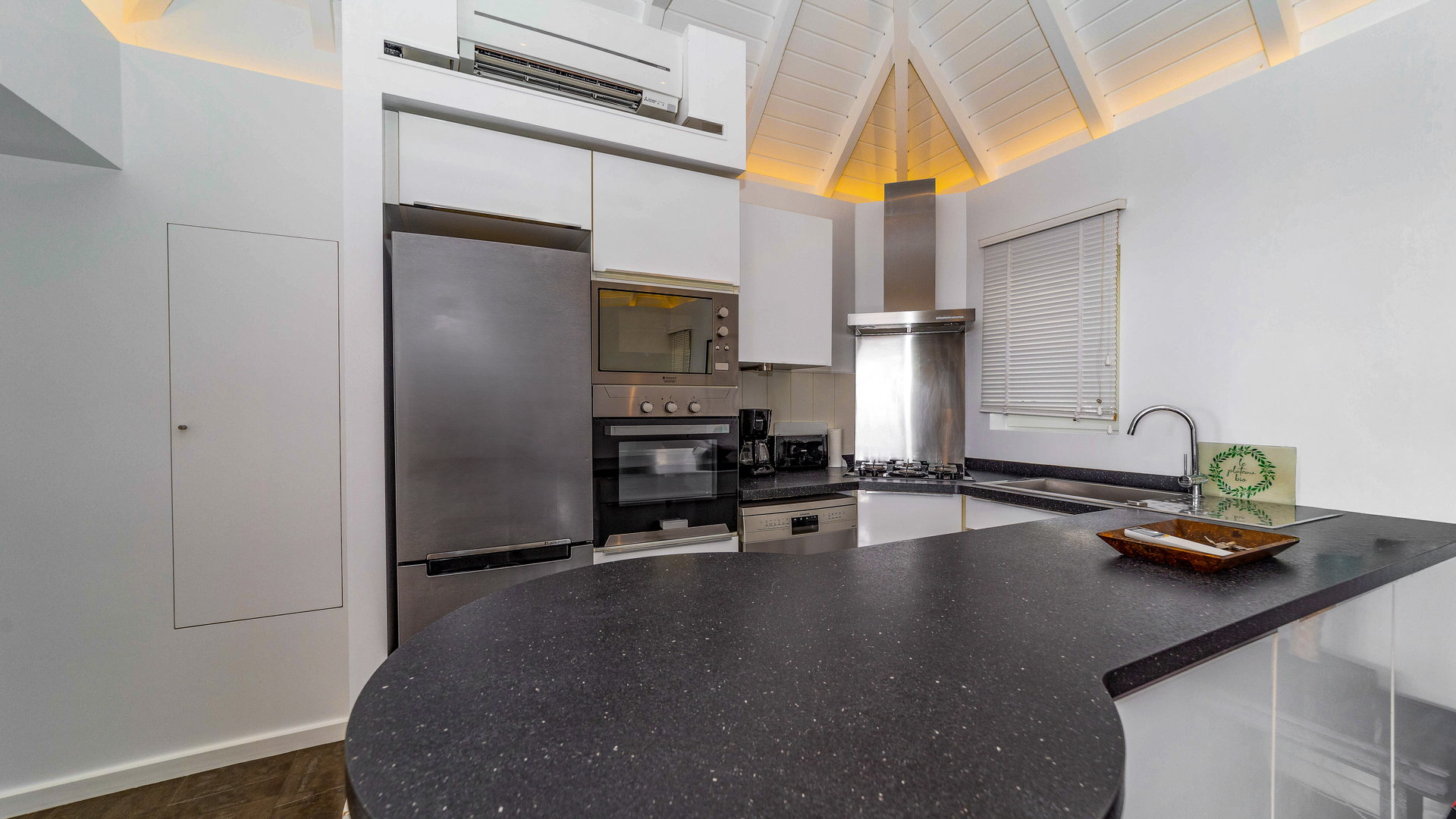 A breakfast bar for two invites you to enjoy peaceful mornings watching the ocean shimmer in the Caribbean light.