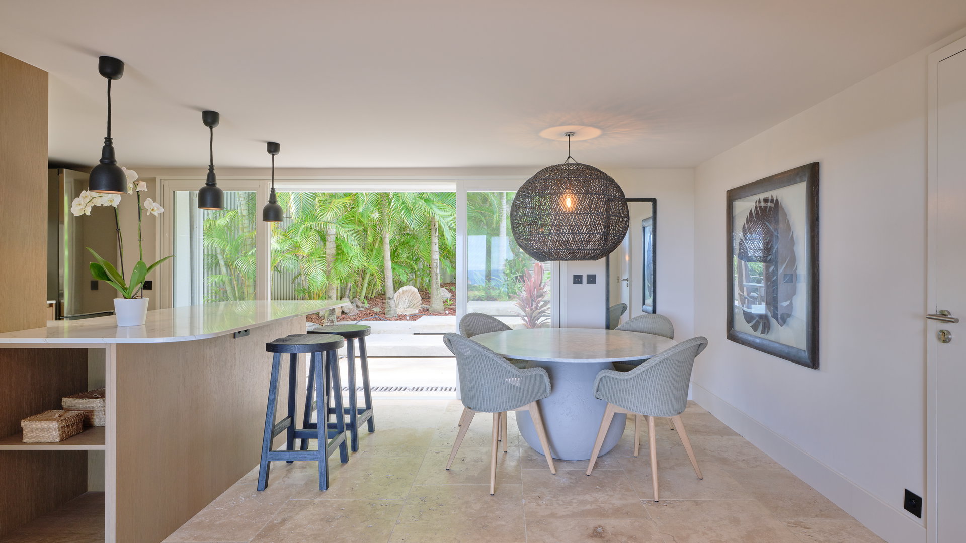 The living rooms and fully equipped kitchens are ideal for gourmet dinners prepared by guests or a private chef, with spectacular views over the shimmering sea.