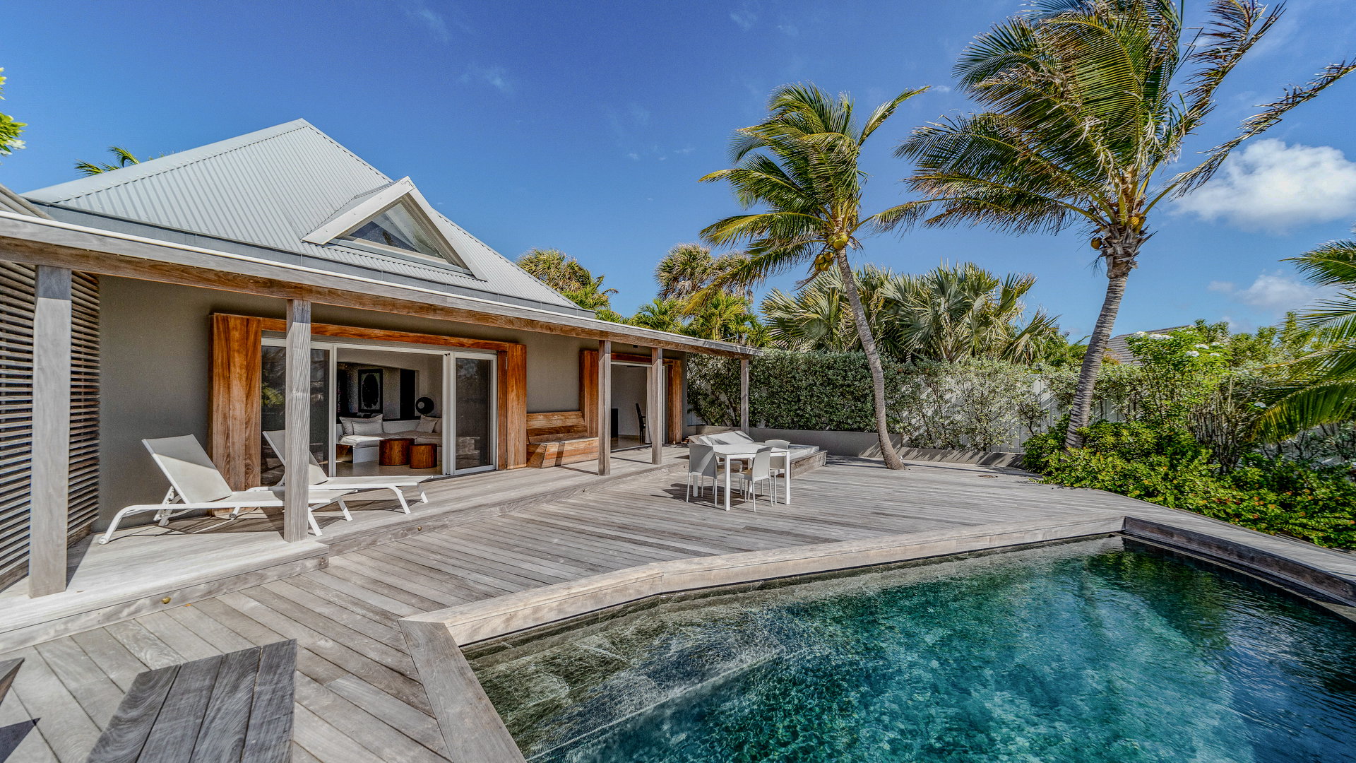 Each villa boasts its own private heated pool, surrounded by sun loungers, daybeds, and lounge areas — the perfect setting for sunbathing or sipping a cocktail.