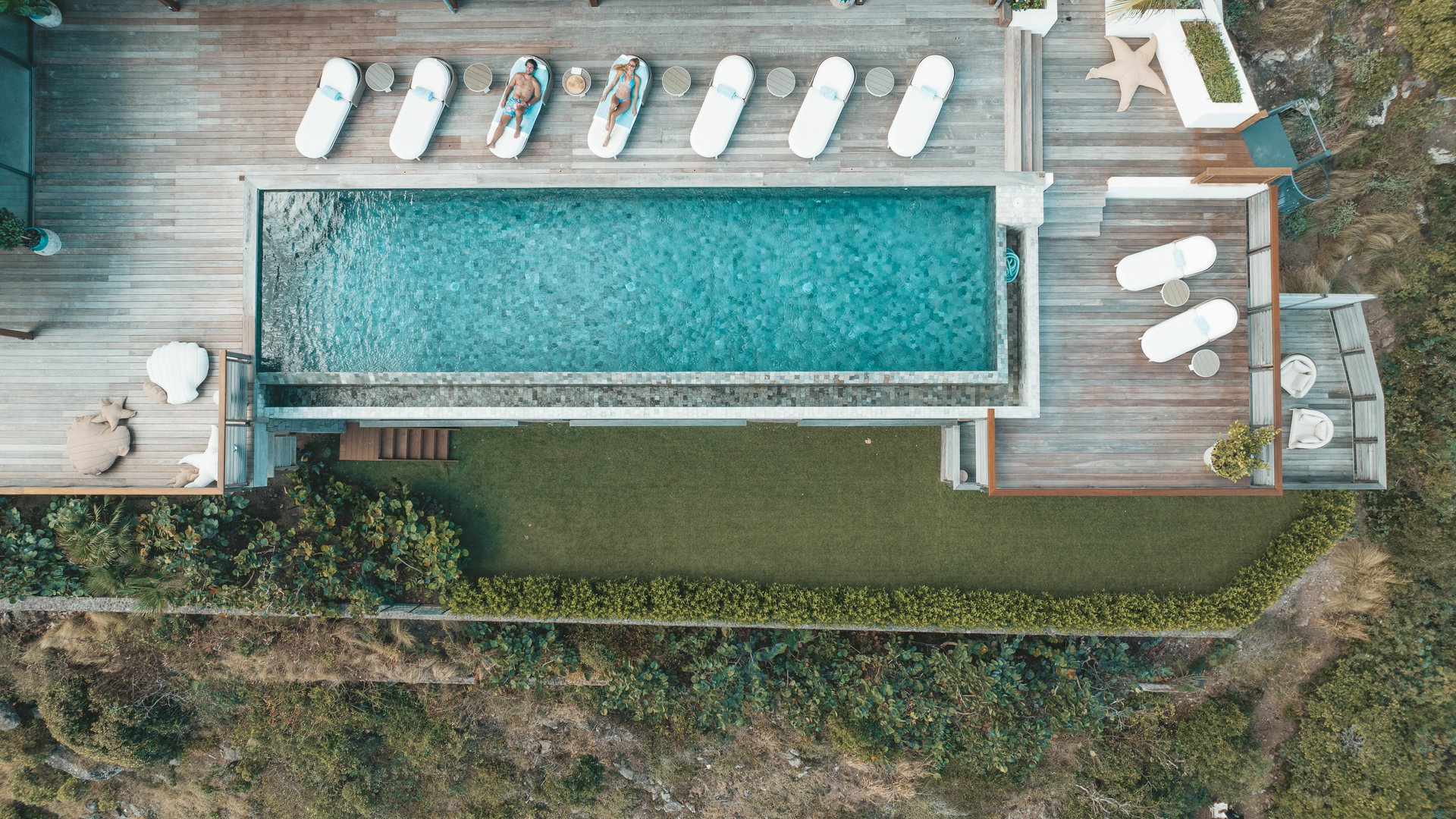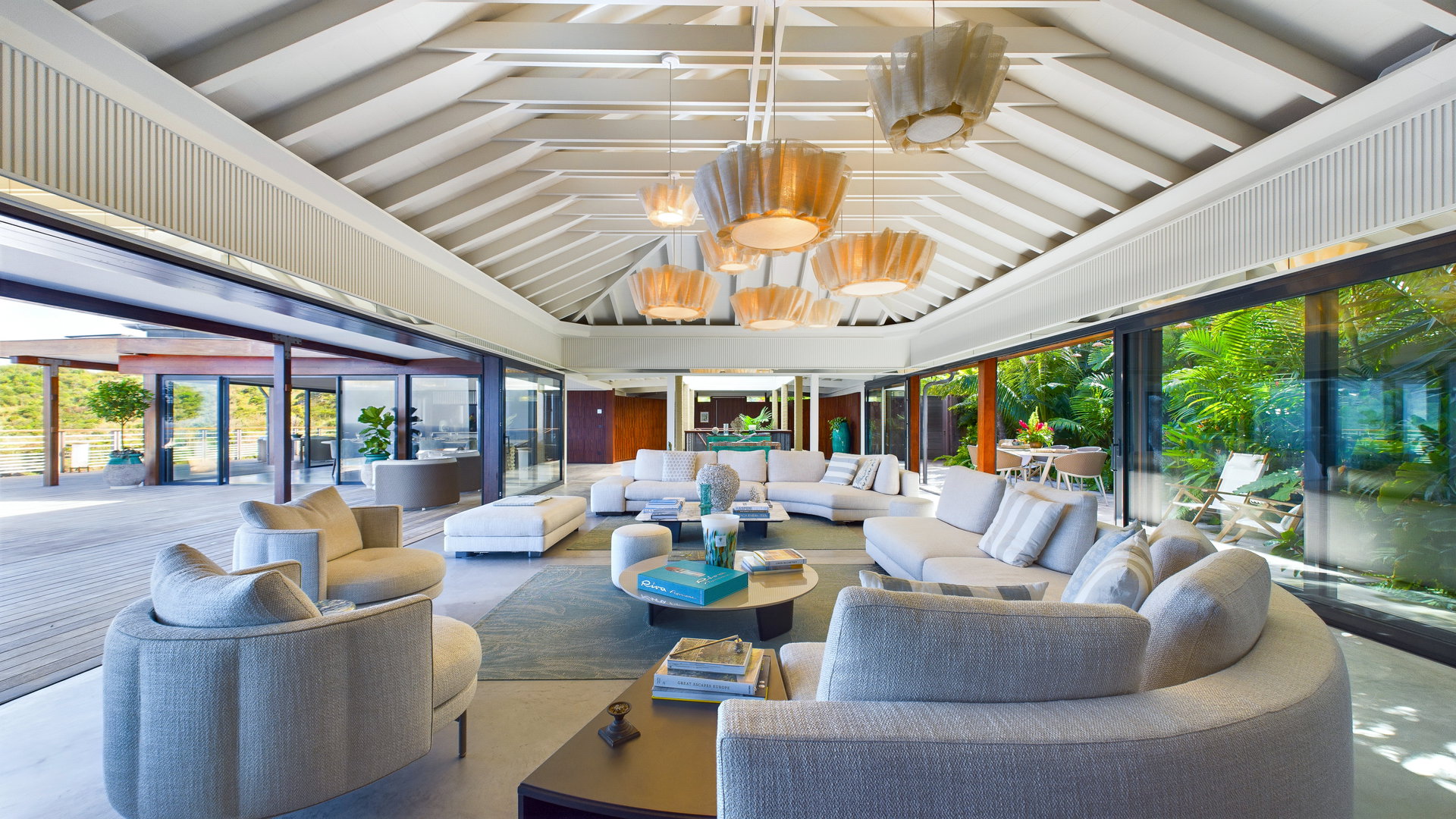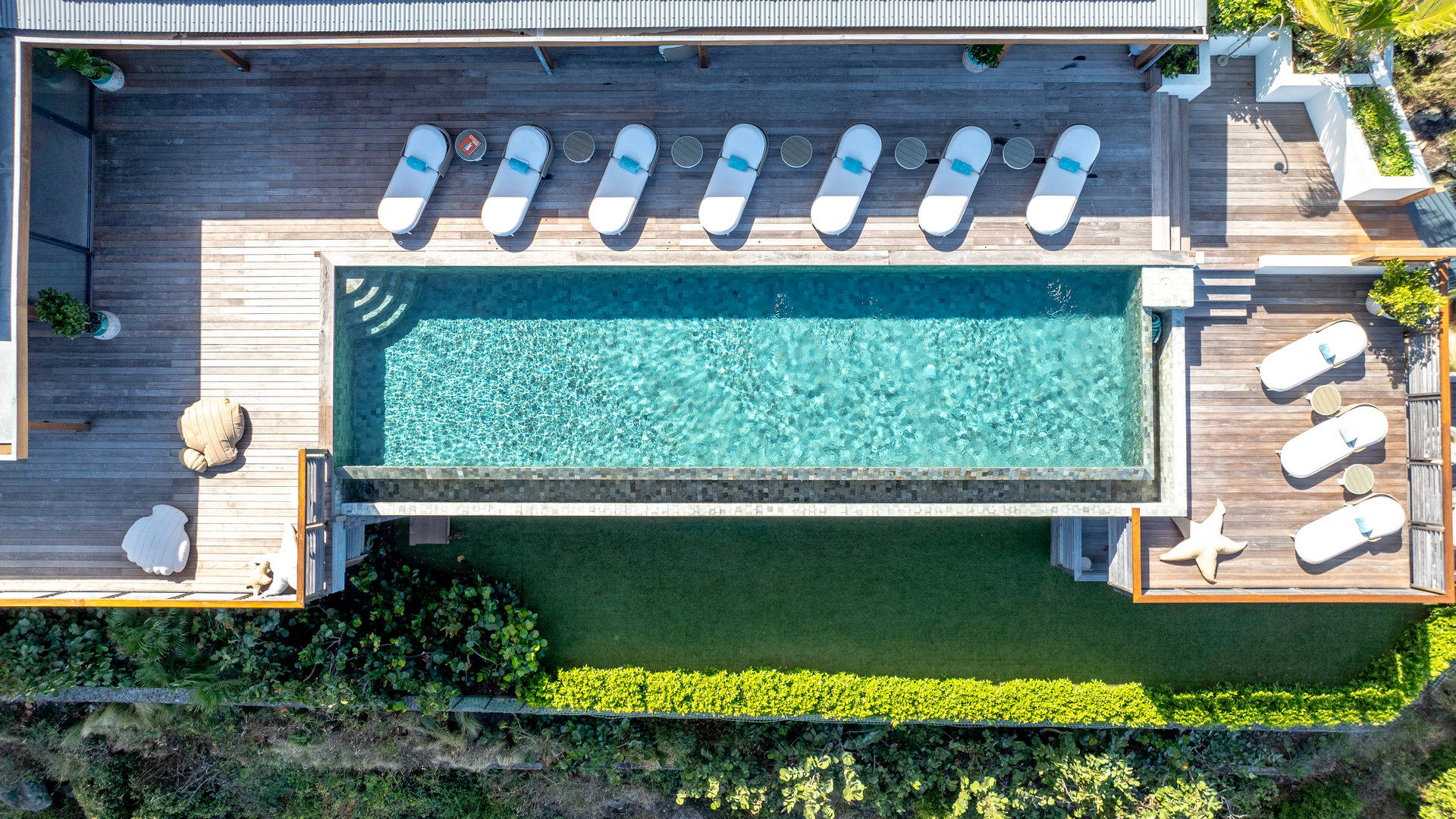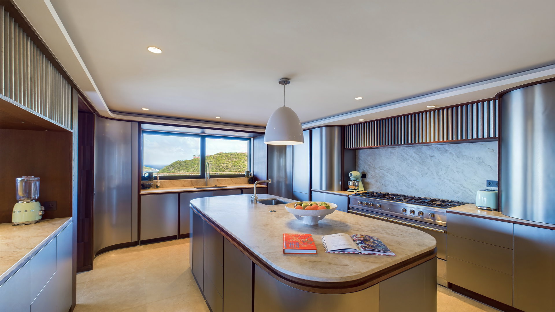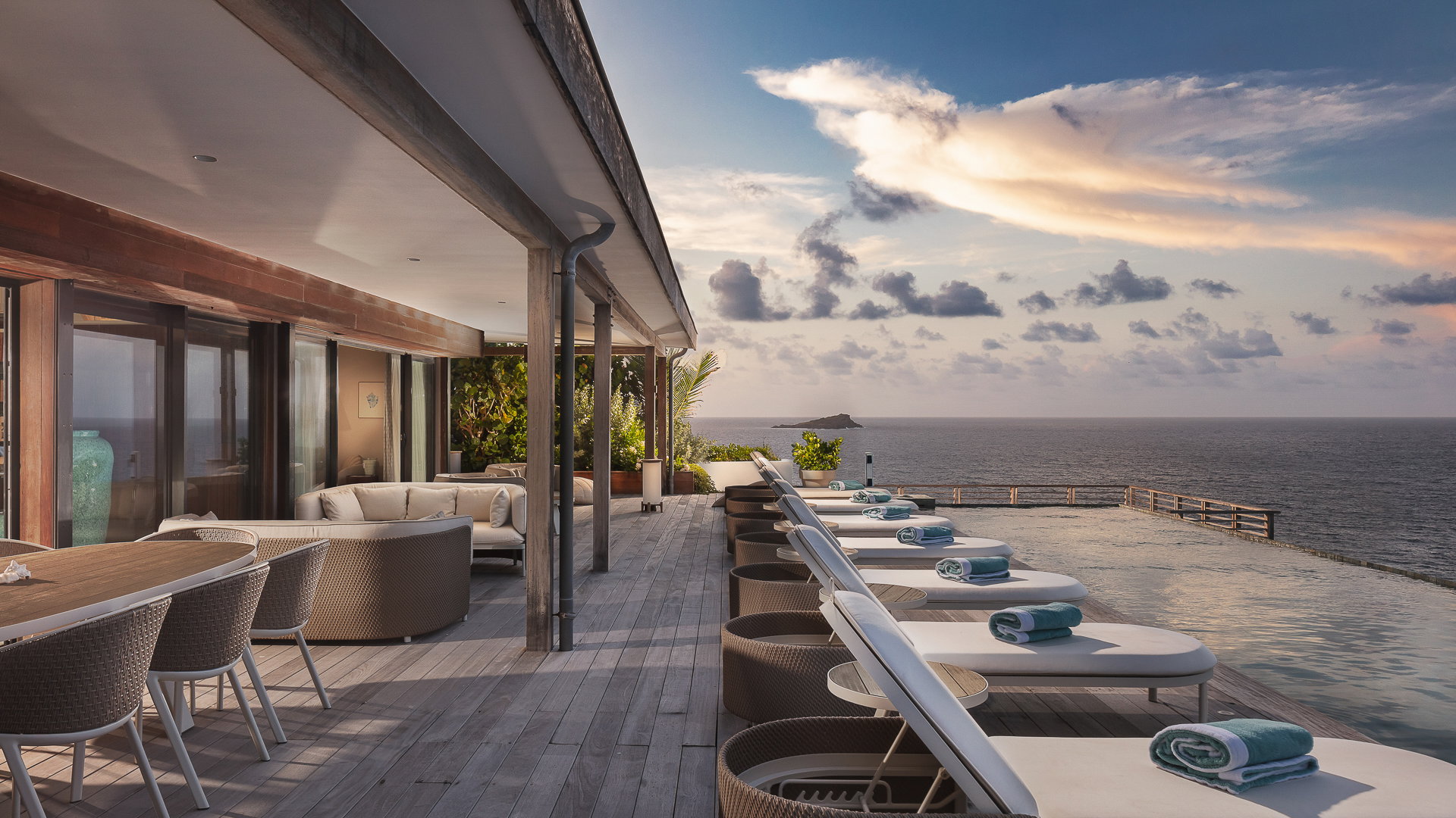 The front terrace showcases a luxurious design, highlighted by an infinity pool that melts into the island’s shimmering waters. A row of loungers lines the pool, perfect for sunbathing or relaxed conversation under the blue sky. Some lounge tables complete the refined outdoor layout, perfect for sipping a cocktail or admiring the beach below, which can be reached by carefully walking down the hillside. A TV room, massage area, and fitness room are also available throughout your stay.