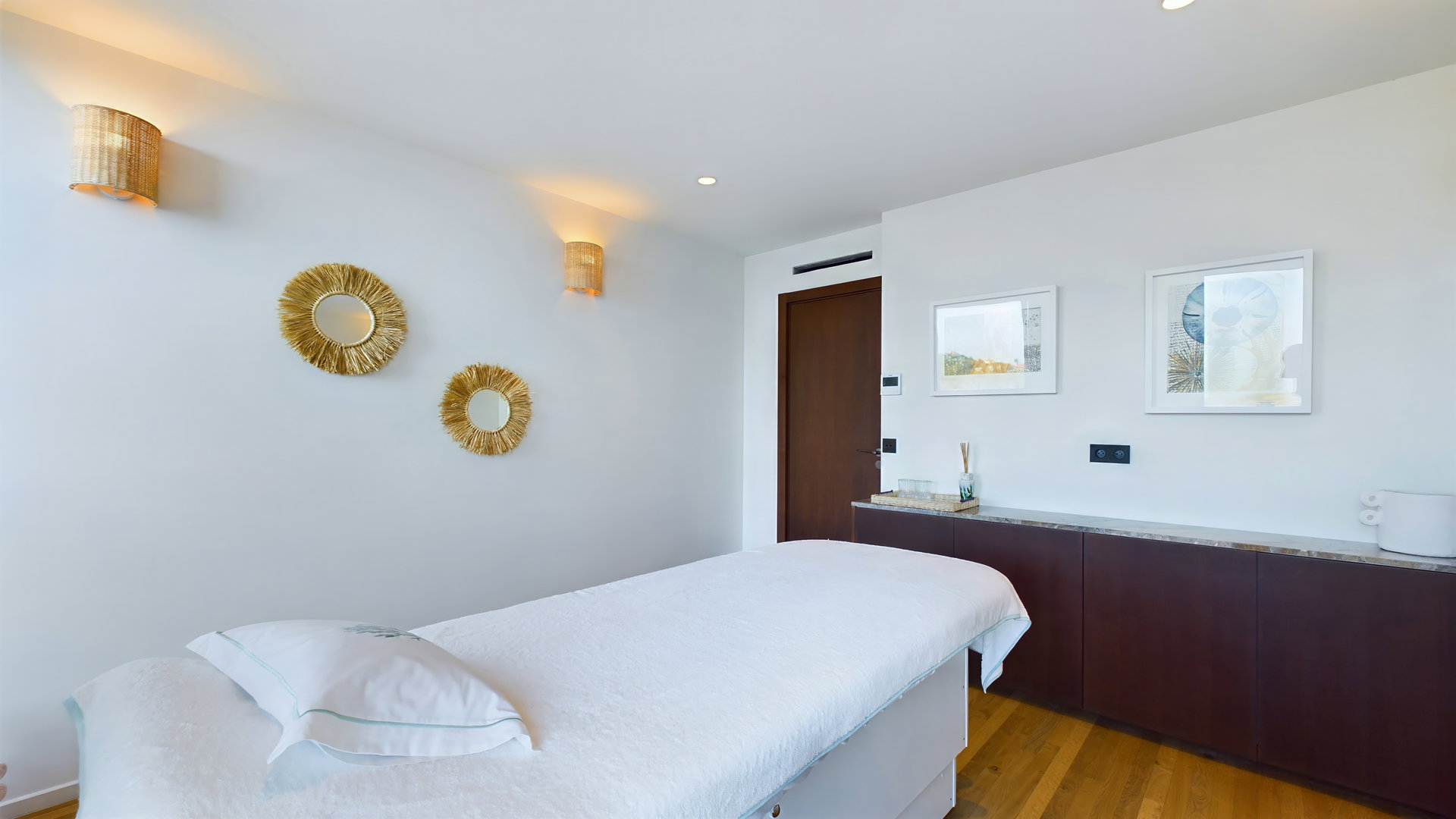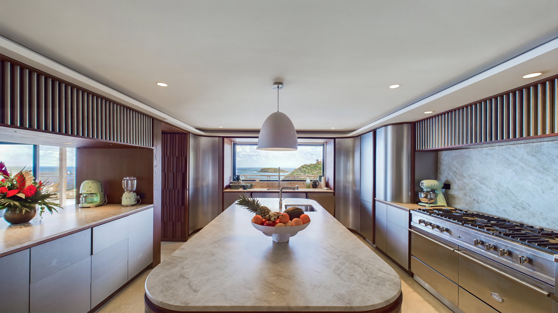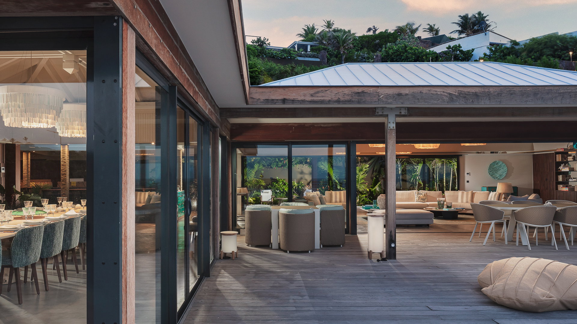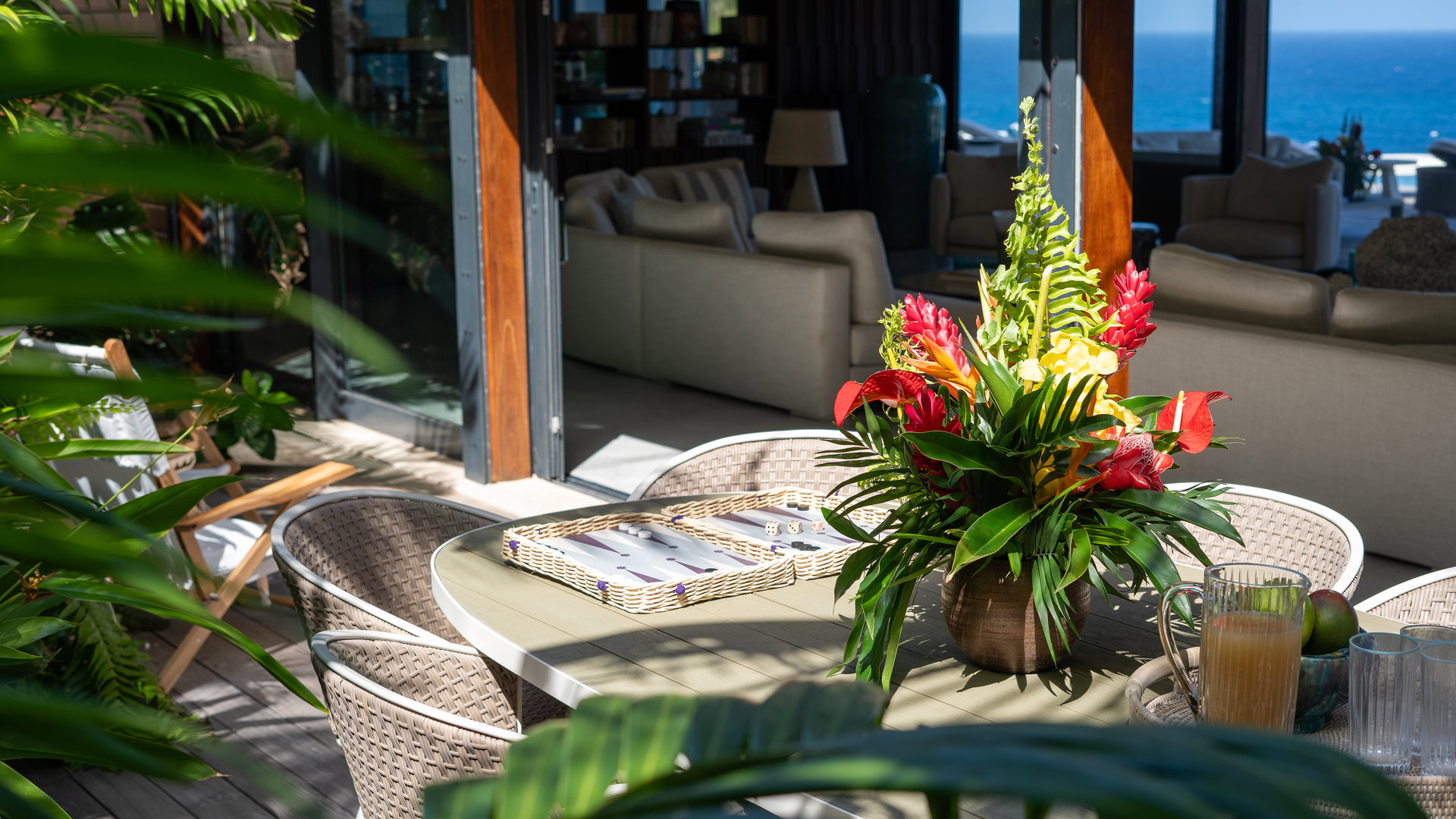 The front terrace showcases a luxurious design, highlighted by an infinity pool that melts into the island’s shimmering waters. A row of loungers lines the pool, perfect for sunbathing or relaxed conversation under the blue sky. Some lounge tables complete the refined outdoor layout, perfect for sipping a cocktail or admiring the beach below, which can be reached by carefully walking down the hillside. A TV room, massage area, and fitness room are also available throughout your stay.