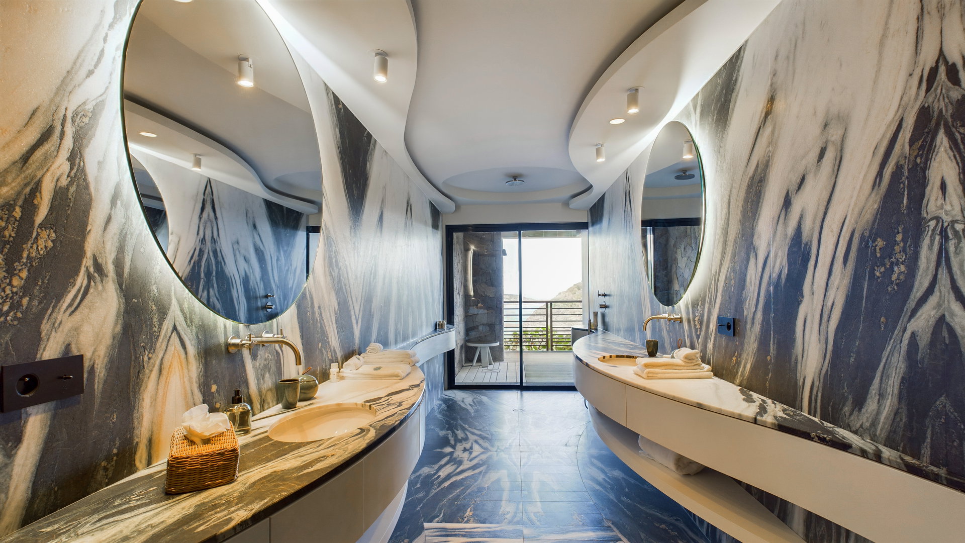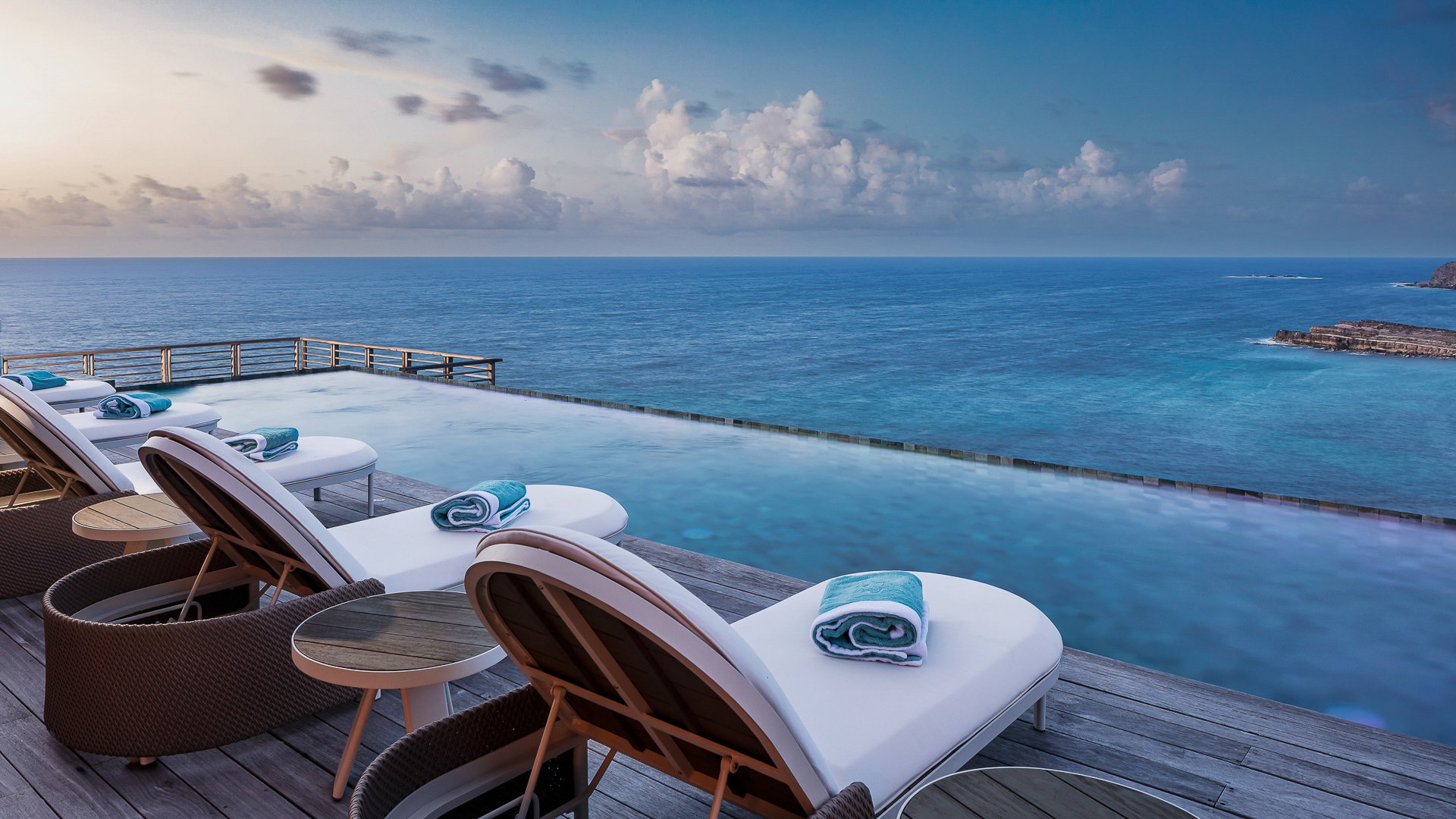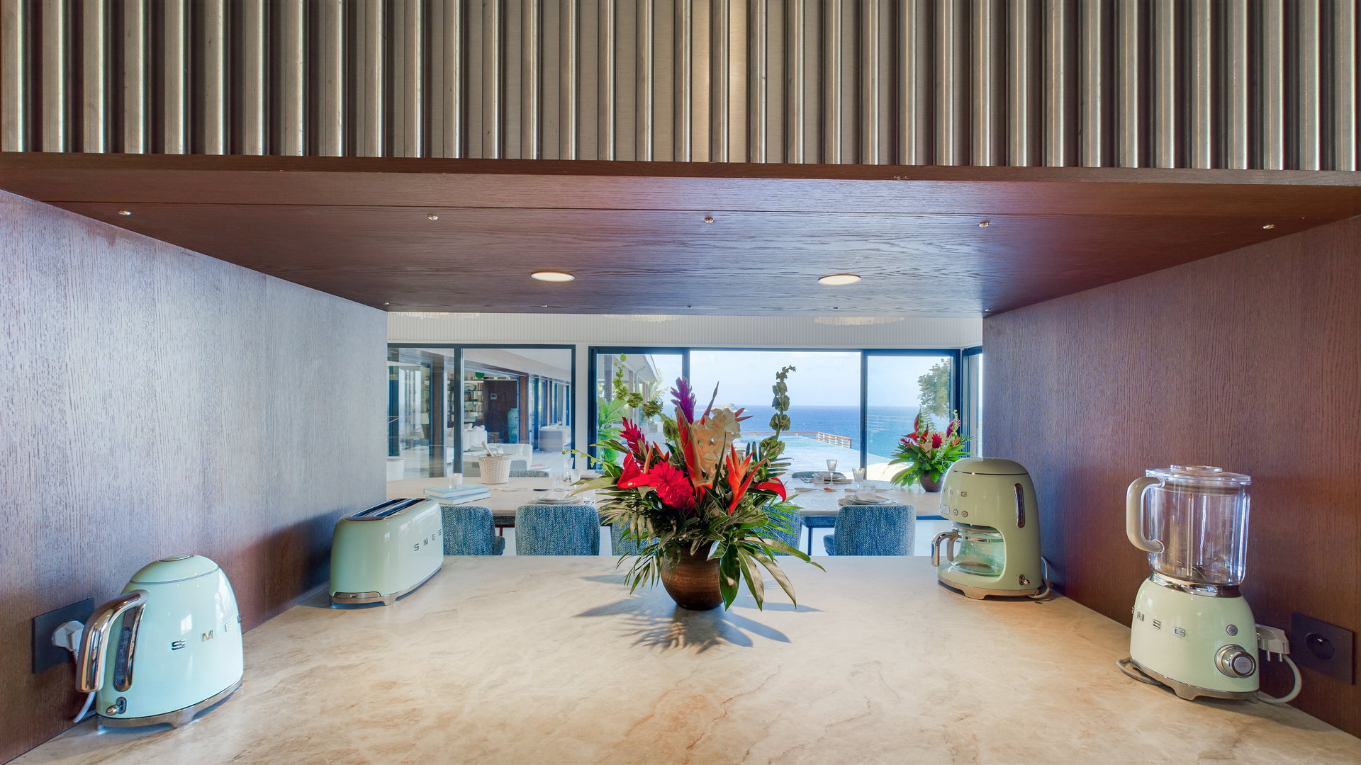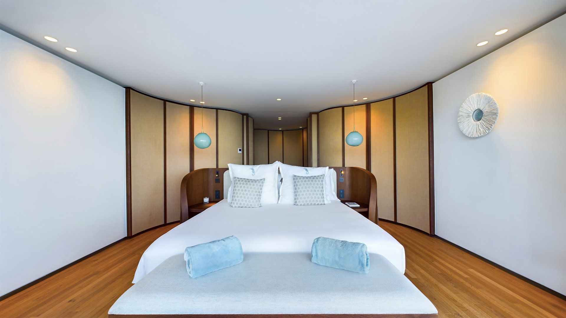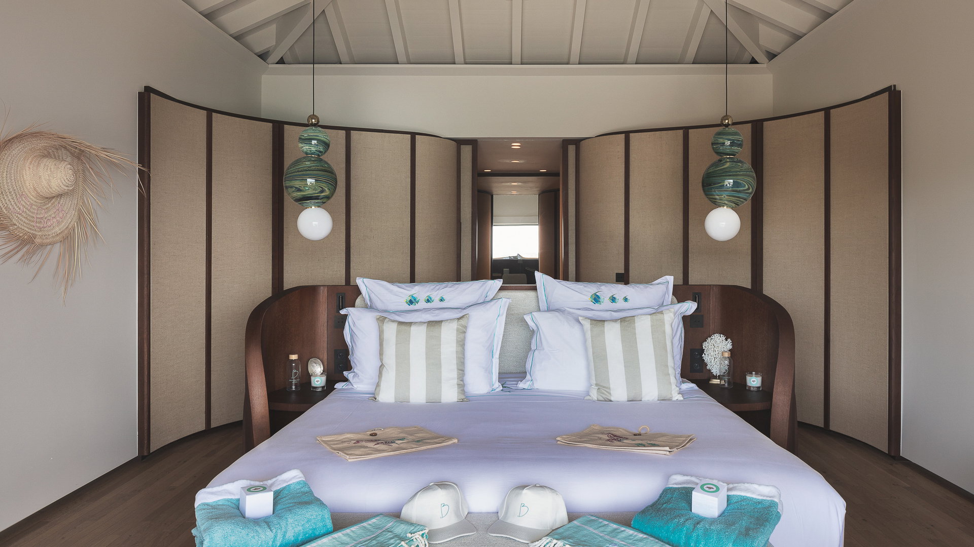 The front terrace showcases a luxurious design, highlighted by an infinity pool that melts into the island’s shimmering waters. A row of loungers lines the pool, perfect for sunbathing or relaxed conversation under the blue sky. Some lounge tables complete the refined outdoor layout, perfect for sipping a cocktail or admiring the beach below, which can be reached by carefully walking down the hillside. A TV room, massage area, and fitness room are also available throughout your stay.