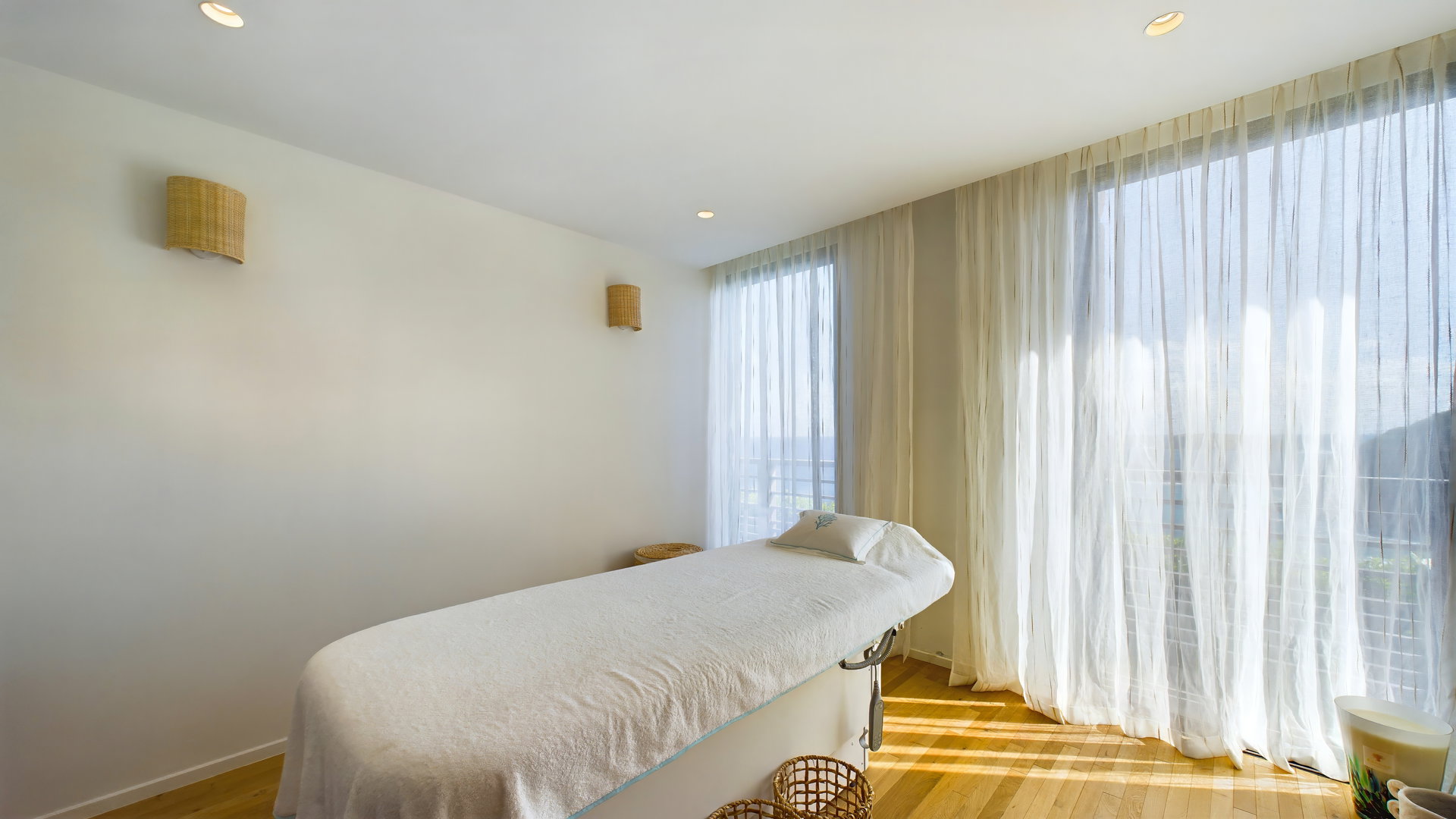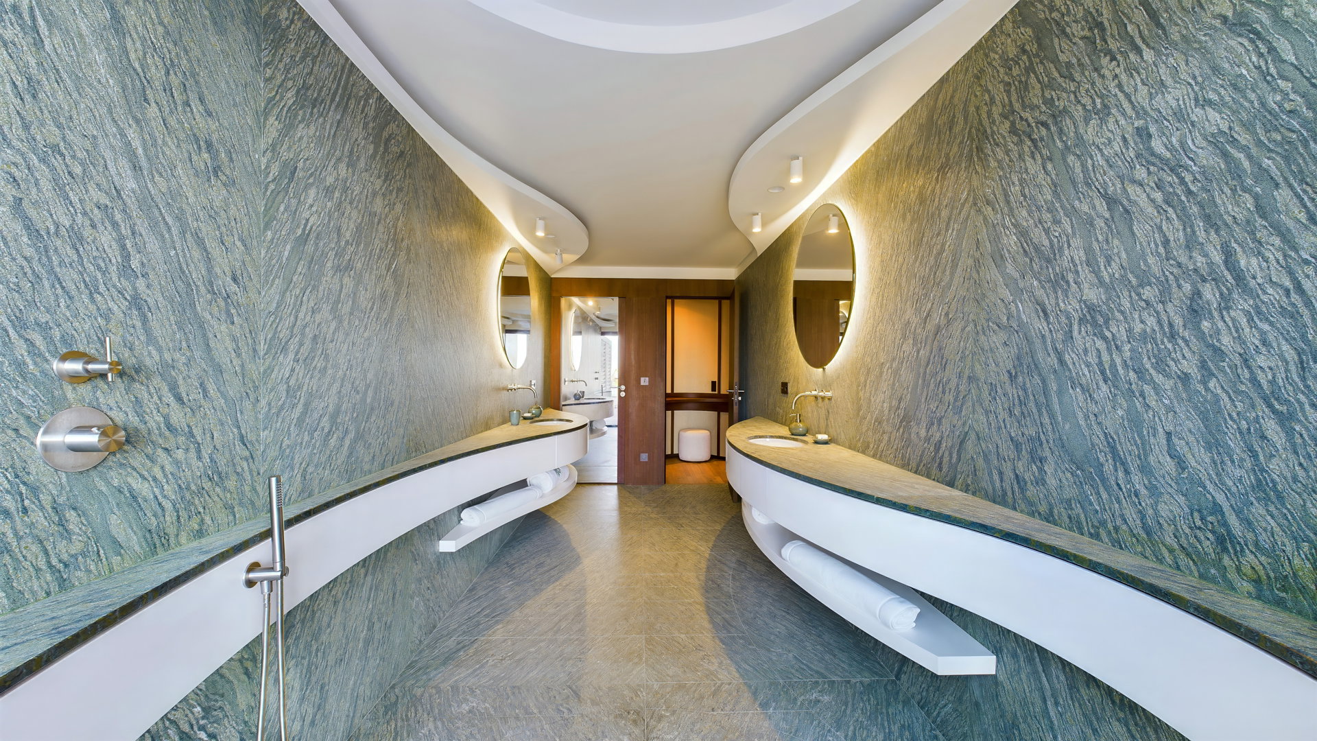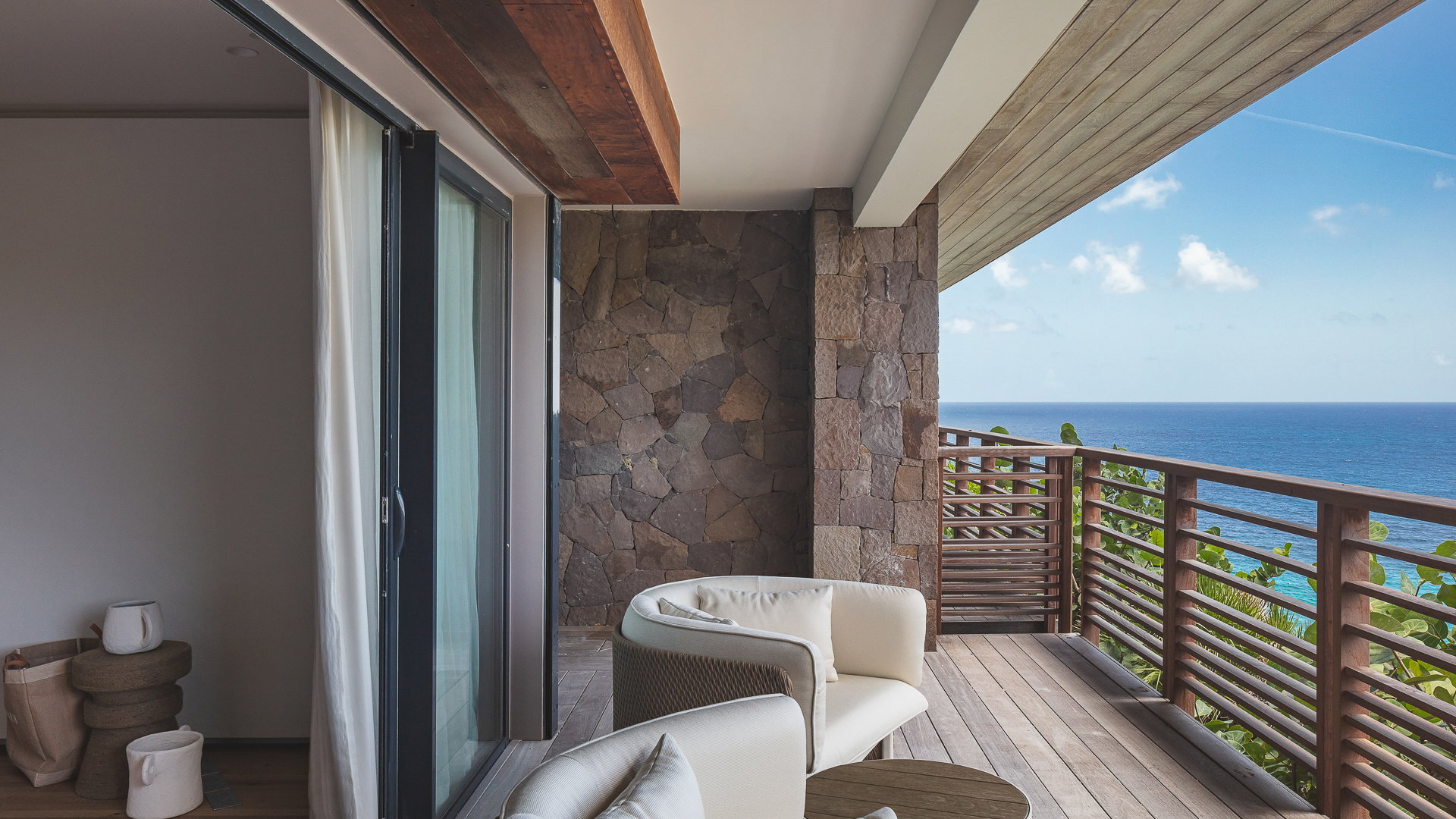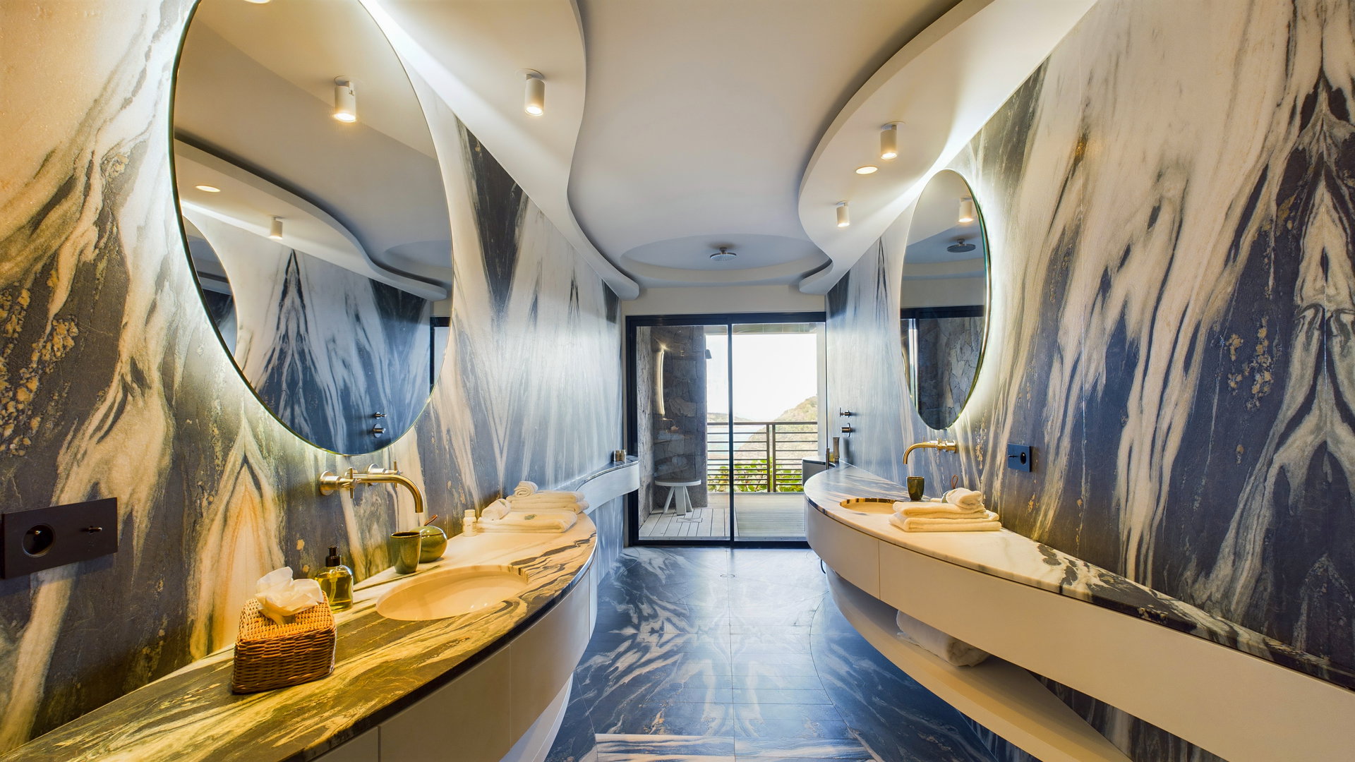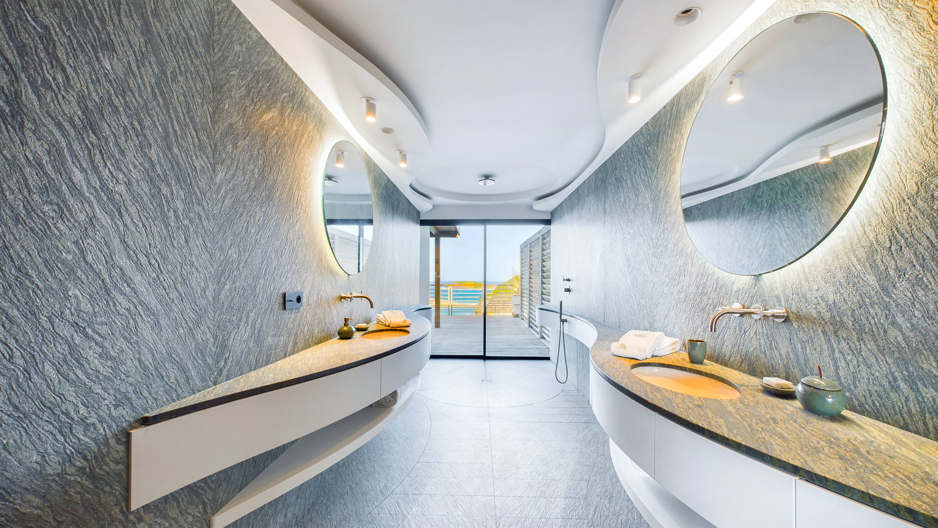 The front terrace showcases a luxurious design, highlighted by an infinity pool that melts into the island’s shimmering waters. A row of loungers lines the pool, perfect for sunbathing or relaxed conversation under the blue sky. Some lounge tables complete the refined outdoor layout, perfect for sipping a cocktail or admiring the beach below, which can be reached by carefully walking down the hillside. A TV room, massage area, and fitness room are also available throughout your stay.