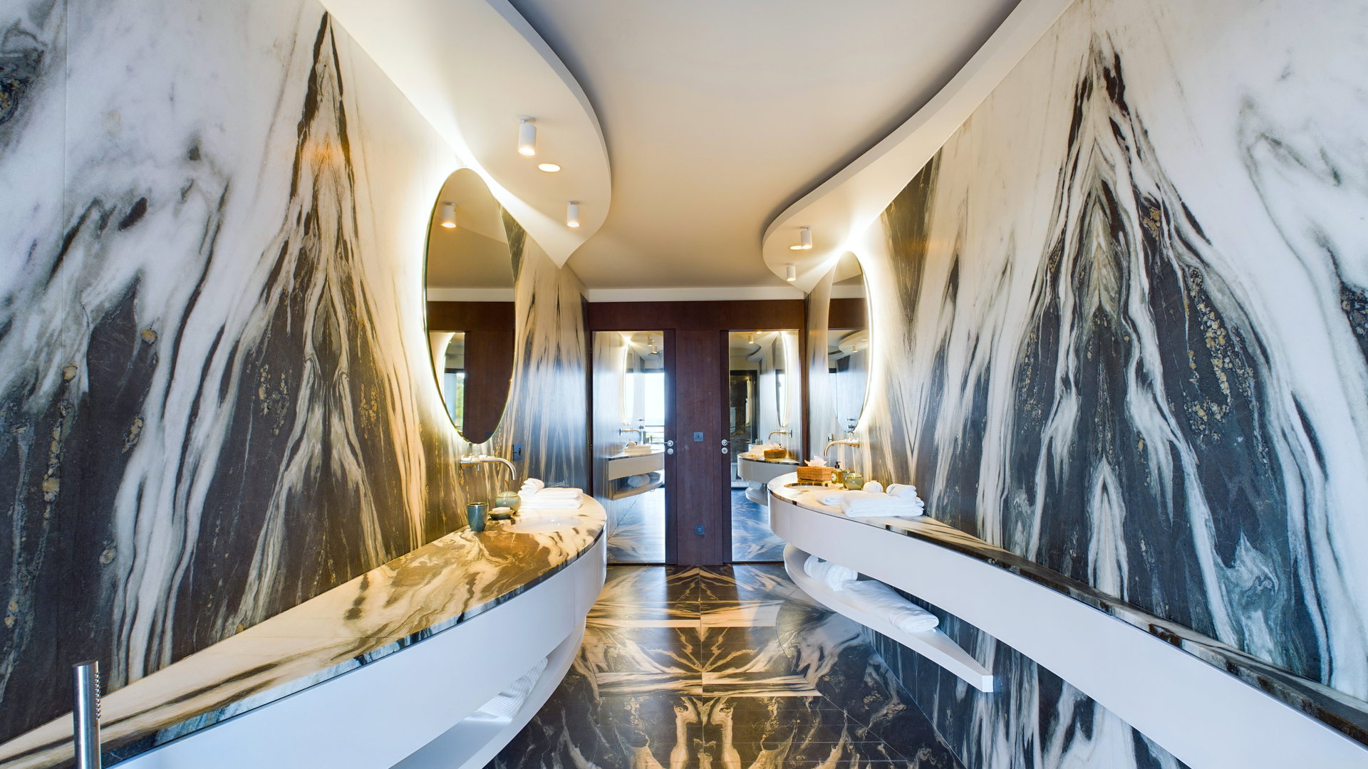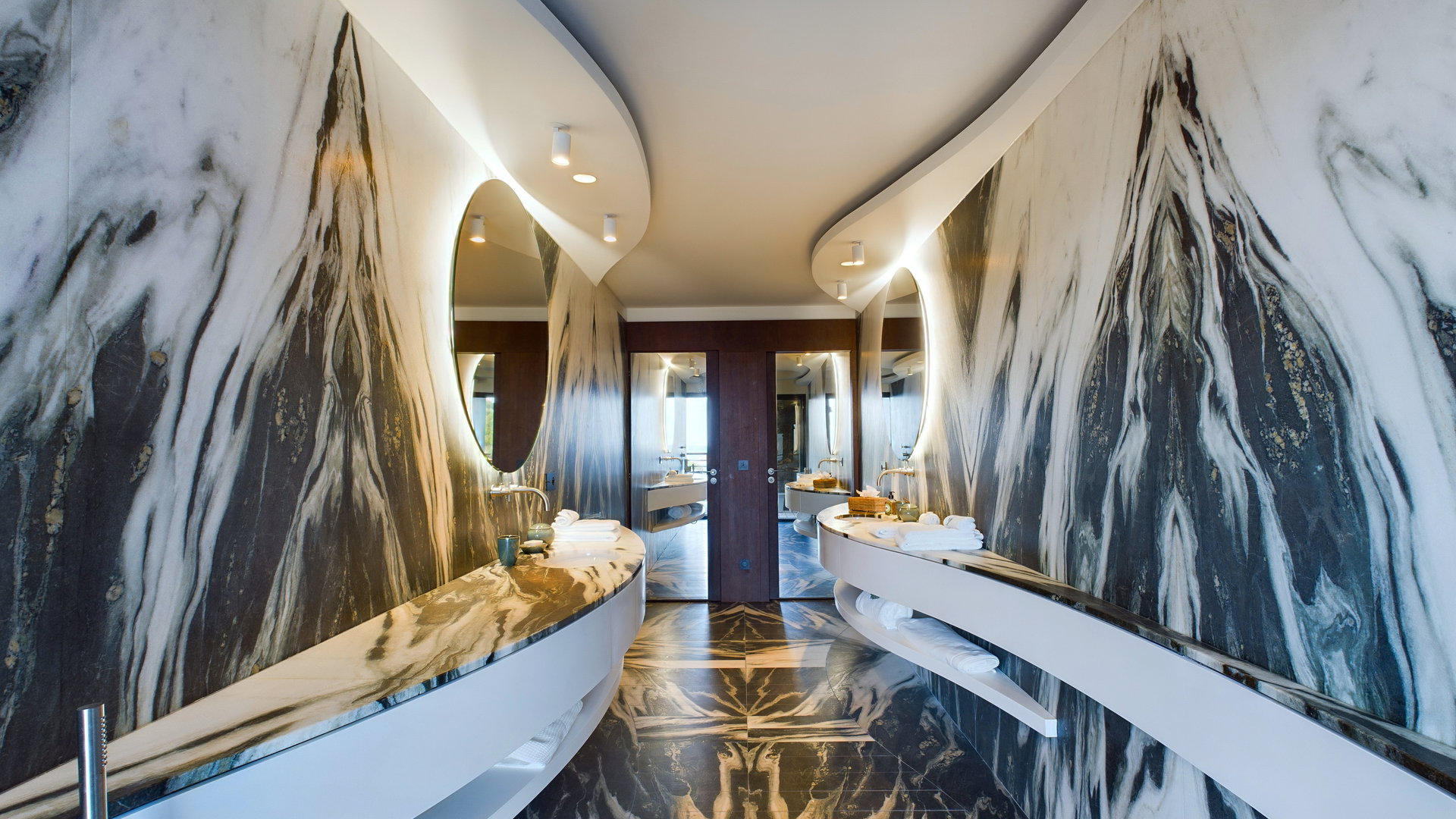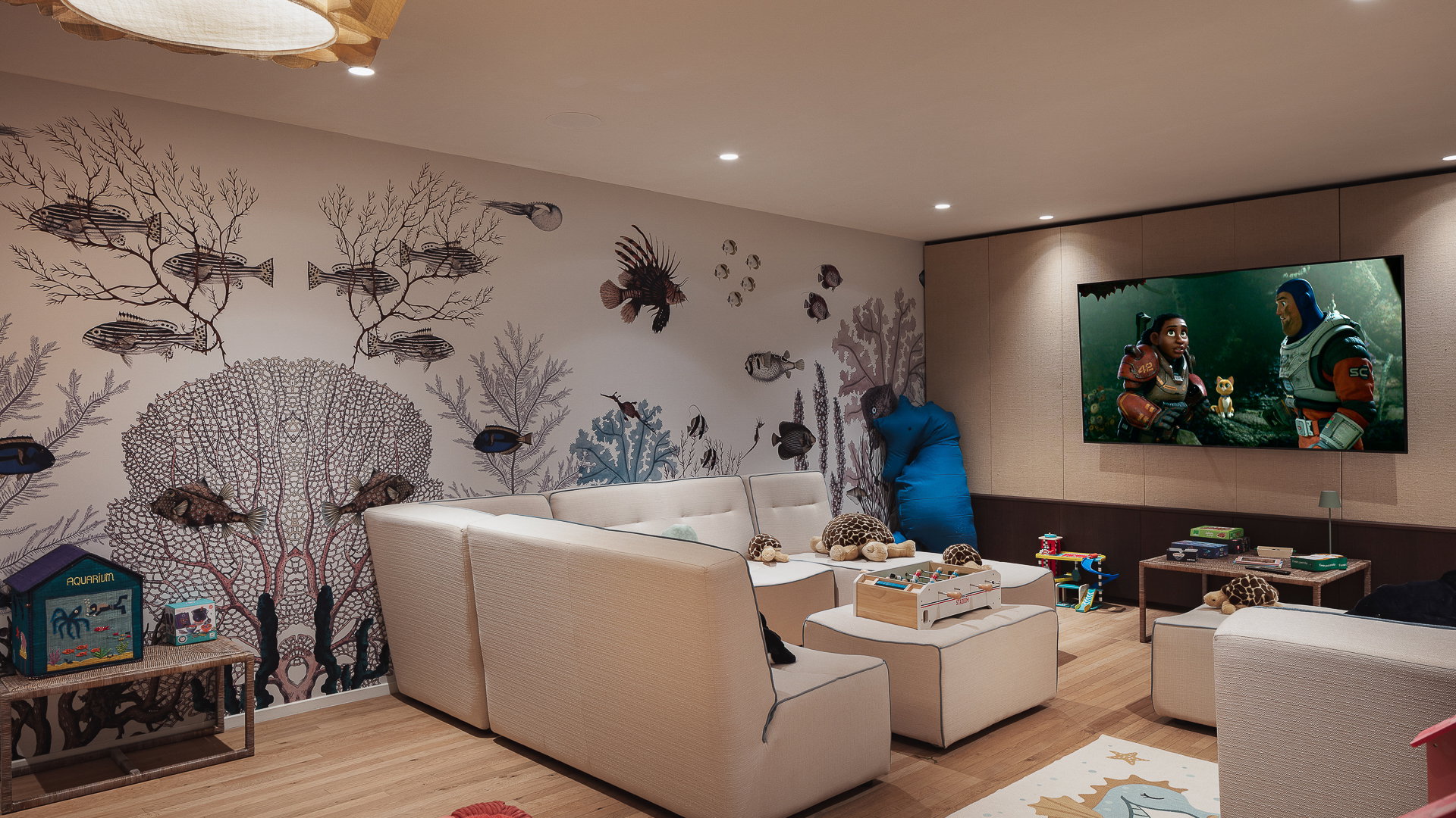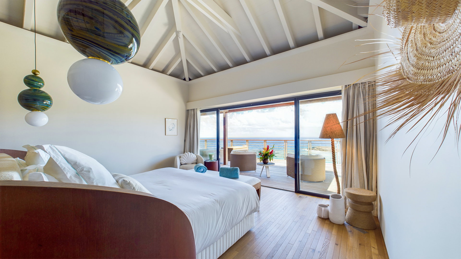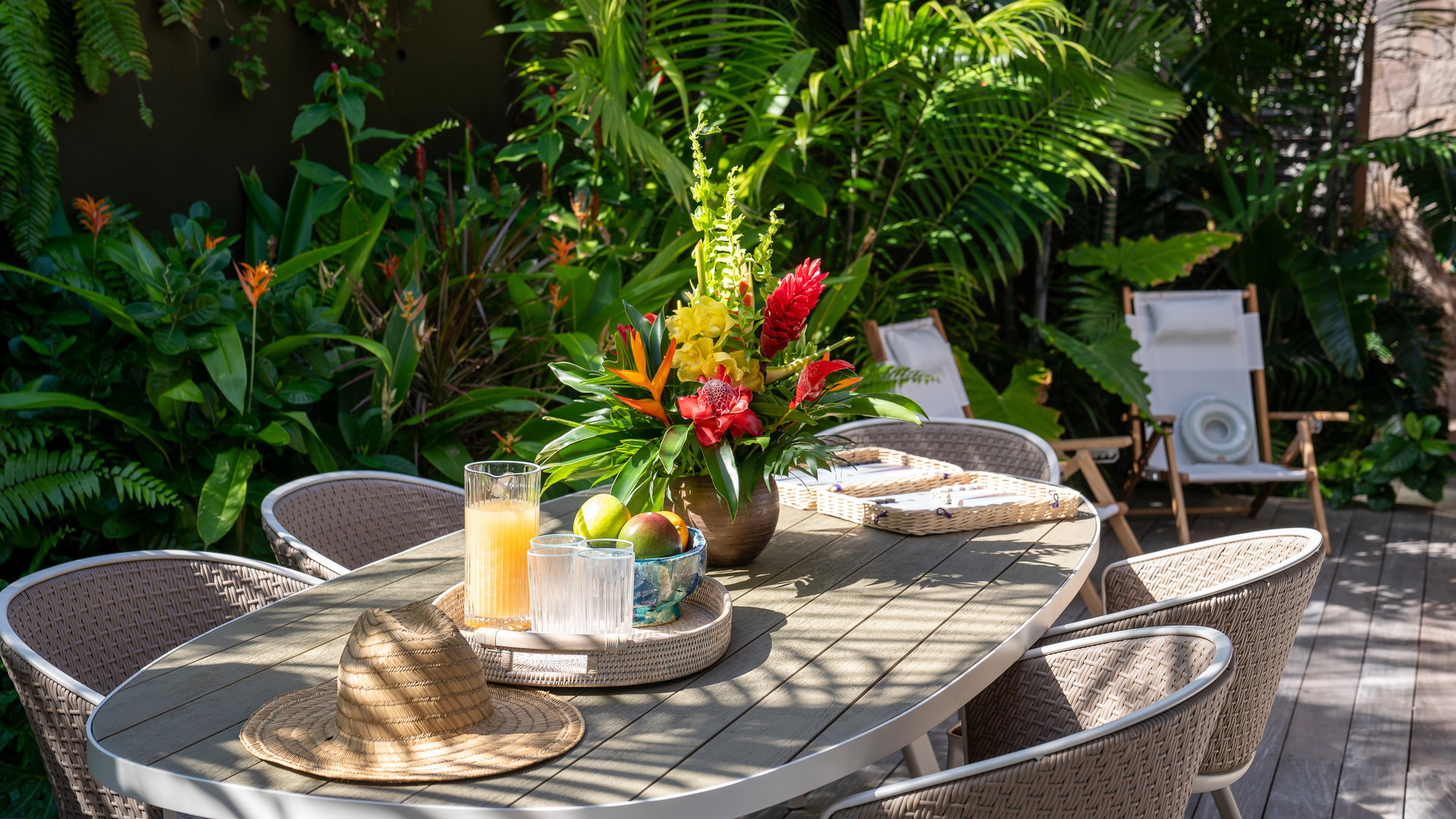 The front terrace showcases a luxurious design, highlighted by an infinity pool that melts into the island’s shimmering waters. A row of loungers lines the pool, perfect for sunbathing or relaxed conversation under the blue sky. Some lounge tables complete the refined outdoor layout, perfect for sipping a cocktail or admiring the beach below, which can be reached by carefully walking down the hillside. A TV room, massage area, and fitness room are also available throughout your stay.
