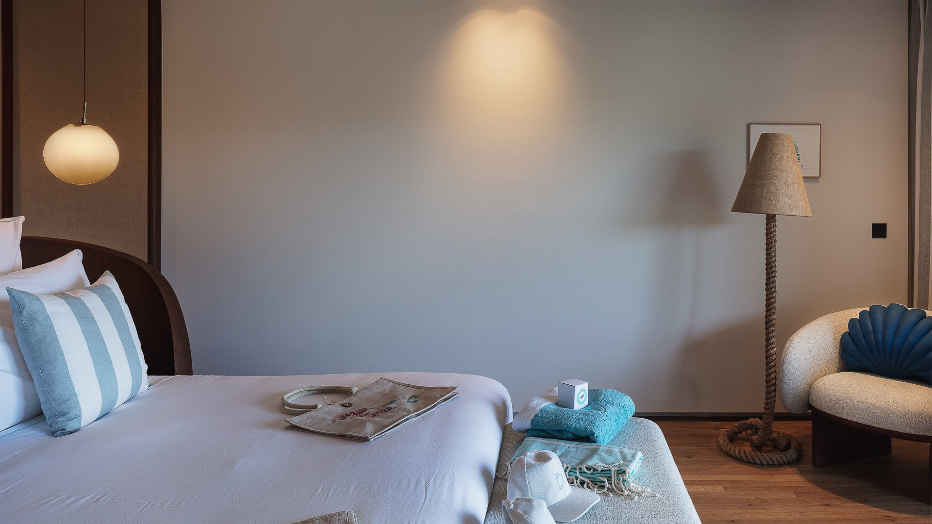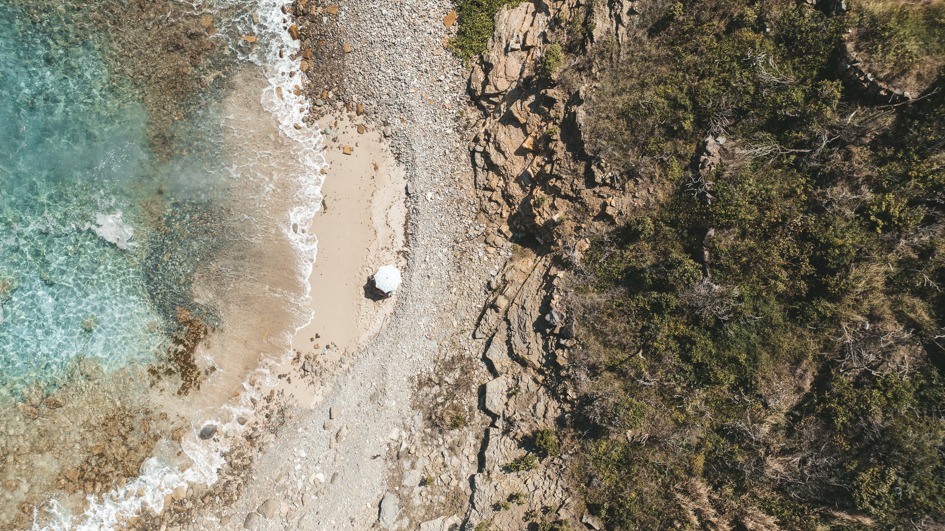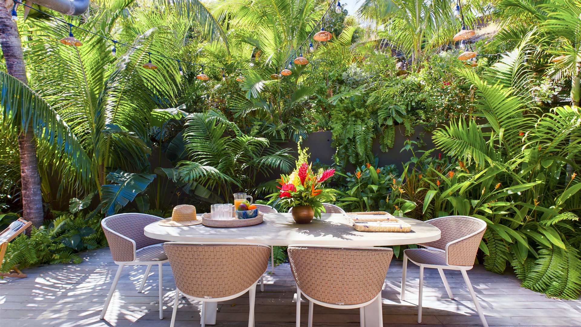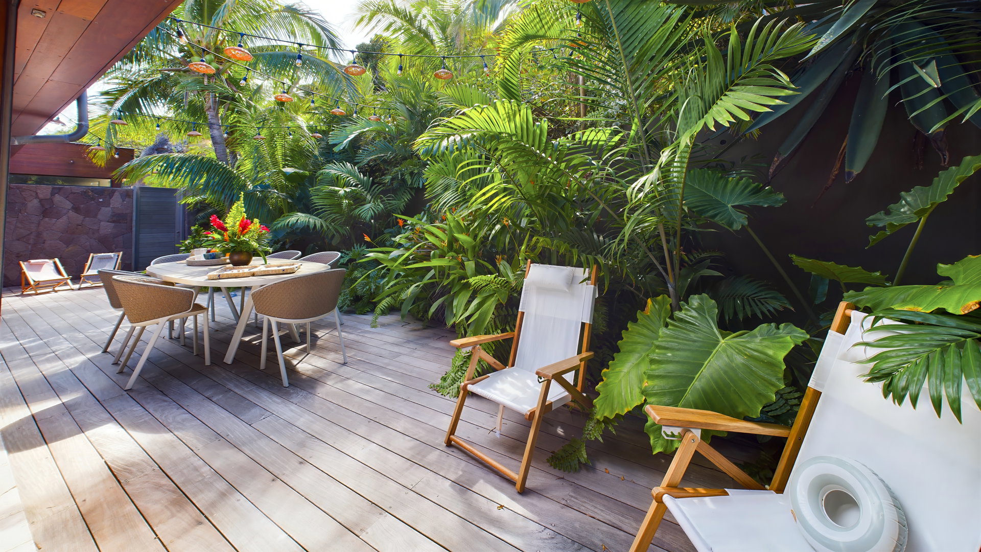 The front terrace showcases a luxurious design, highlighted by an infinity pool that melts into the island’s shimmering waters. A row of loungers lines the pool, perfect for sunbathing or relaxed conversation under the blue sky. Some lounge tables complete the refined outdoor layout, perfect for sipping a cocktail or admiring the beach below, which can be reached by carefully walking down the hillside. A TV room, massage area, and fitness room are also available throughout your stay.