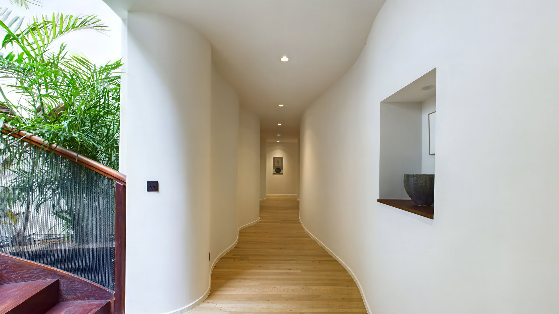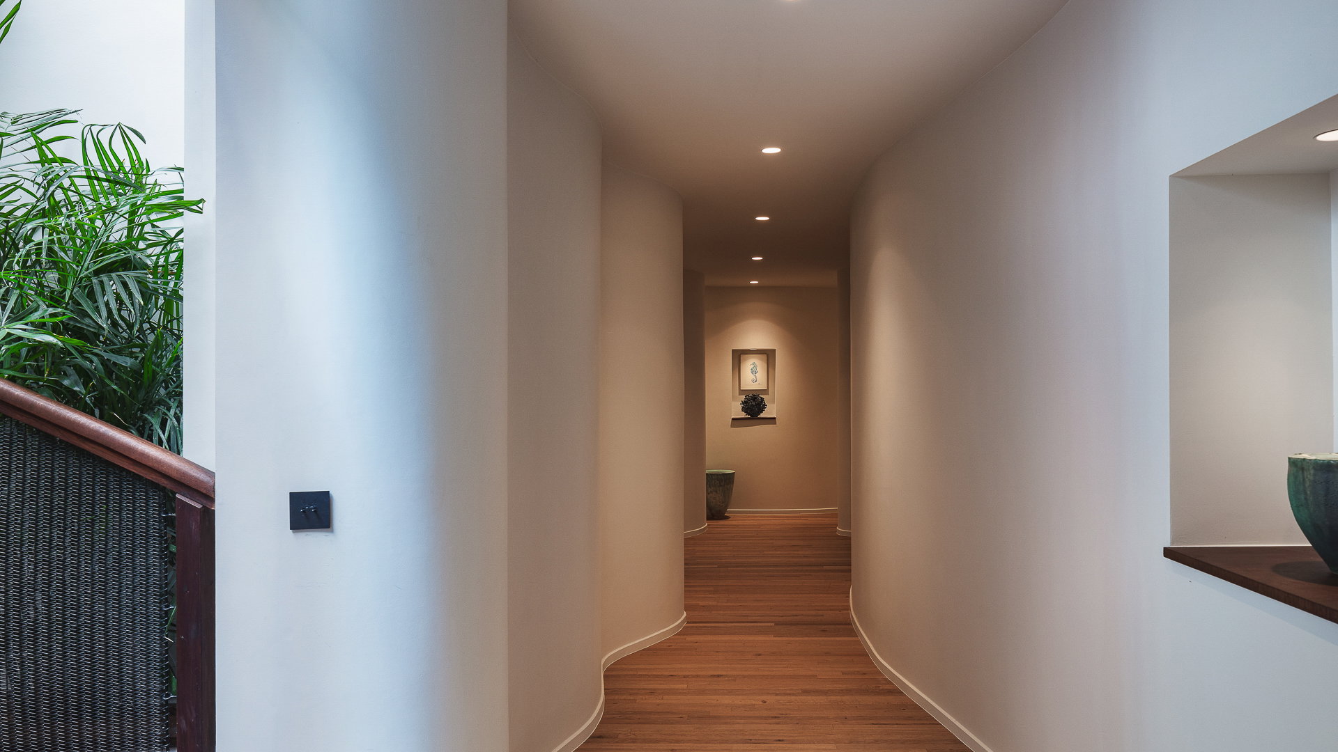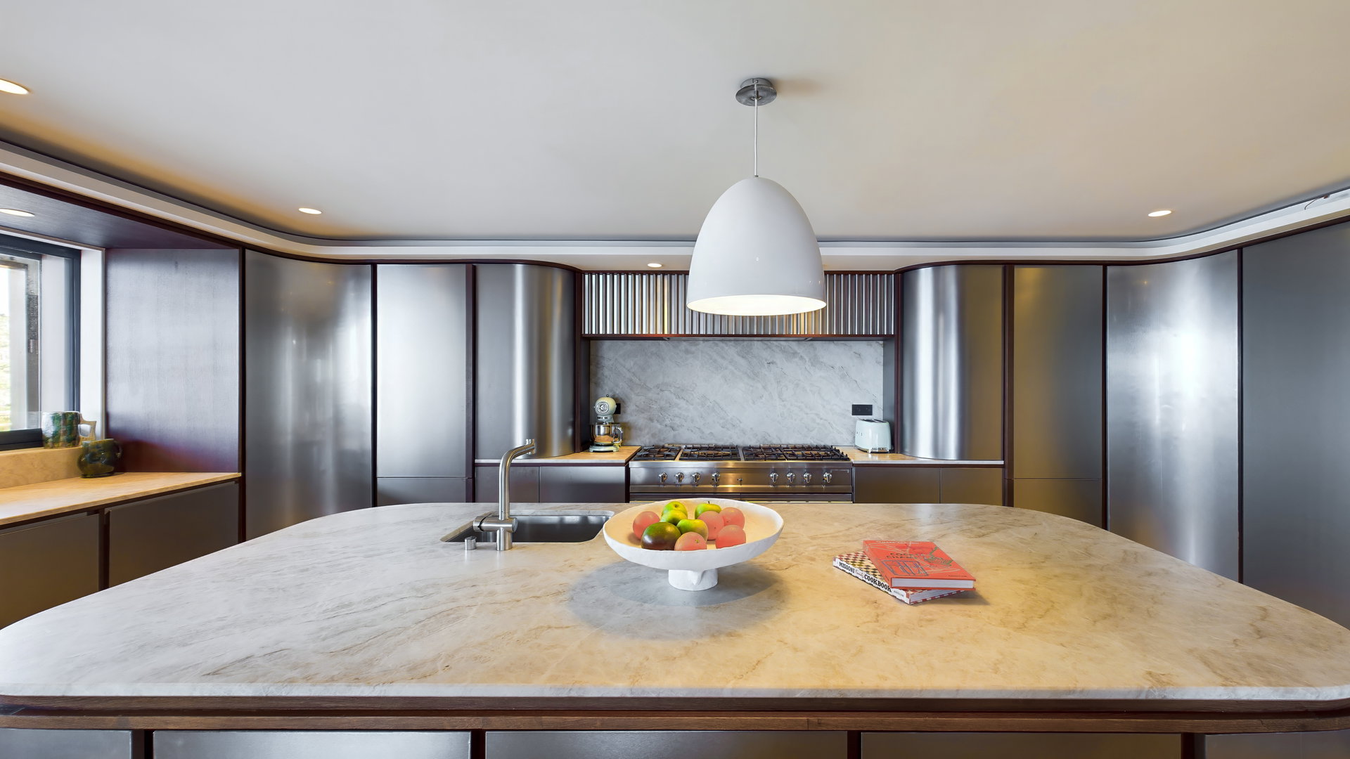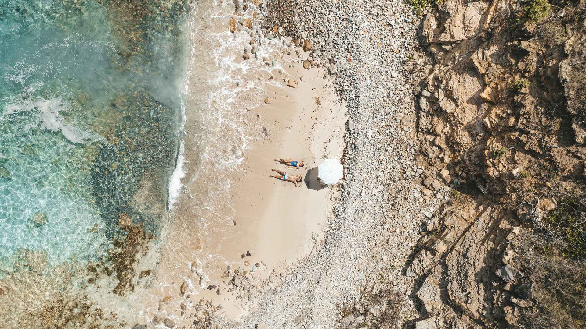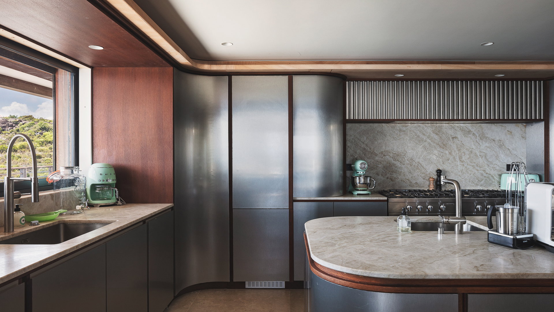 The front terrace showcases a luxurious design, highlighted by an infinity pool that melts into the island’s shimmering waters. A row of loungers lines the pool, perfect for sunbathing or relaxed conversation under the blue sky. Some lounge tables complete the refined outdoor layout, perfect for sipping a cocktail or admiring the beach below, which can be reached by carefully walking down the hillside. A TV room, massage area, and fitness room are also available throughout your stay.