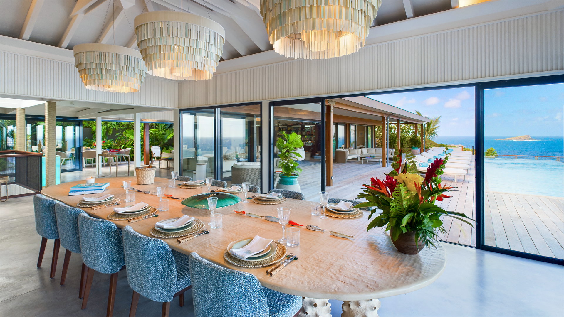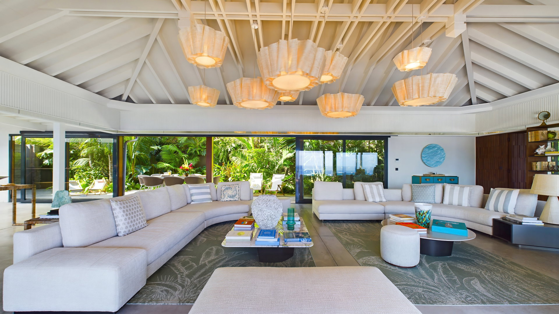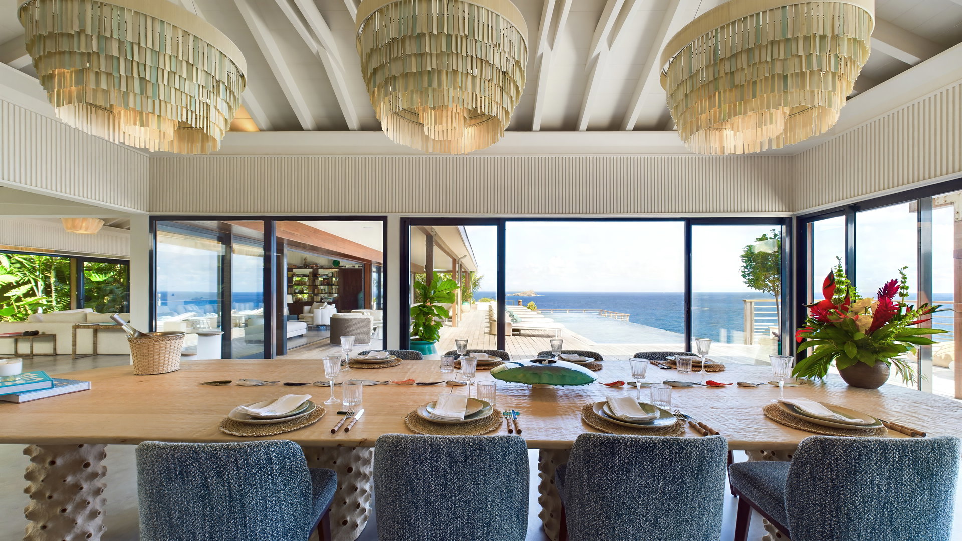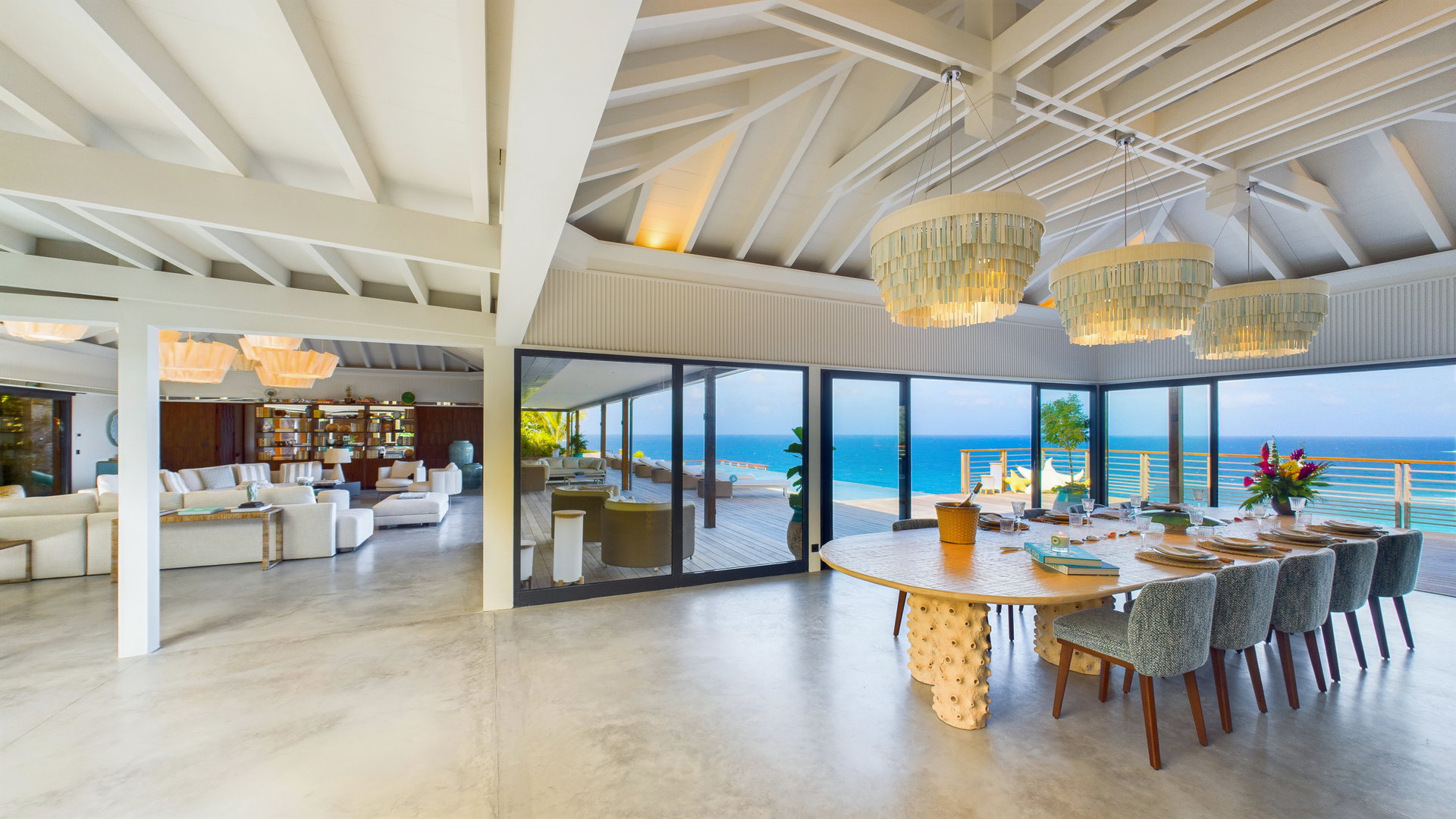Built across two levels, villa BRAHAMA blends seamlessly into a a beautiful and outstanding environment. On the main level, the living area features an expansive lounge with rounded sofas beneath a ceiling dotted with pendant lights. At the front, floor‑to‑ceiling openings lead to the pool terrace, framing the majestic sweep of the turquoise ocean, a hue that you’ll find throughout the interior décor, mixed with soft ivory tones. At the back, the lounge opens onto a lush landscaped terrace that brings freshness and charm, centered around a romantic dining table. On the side, the kitchen includes a central island and full equipment perfect for hosting a private chef for events, with a dining area set at an angle to the living room, creating a warm, inviting atmosphere around the pool.