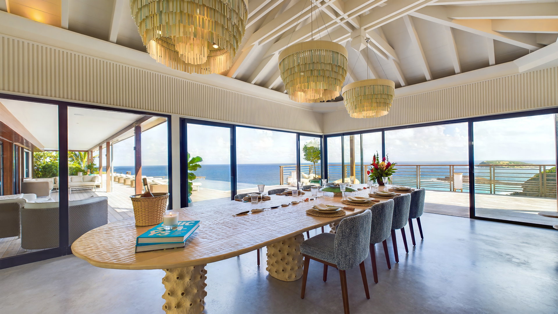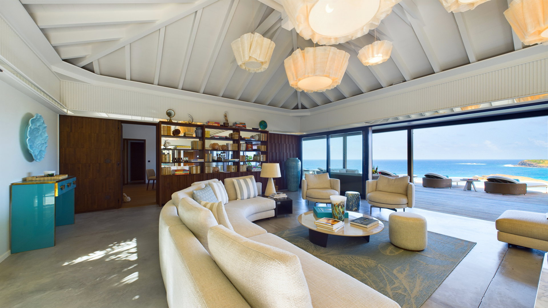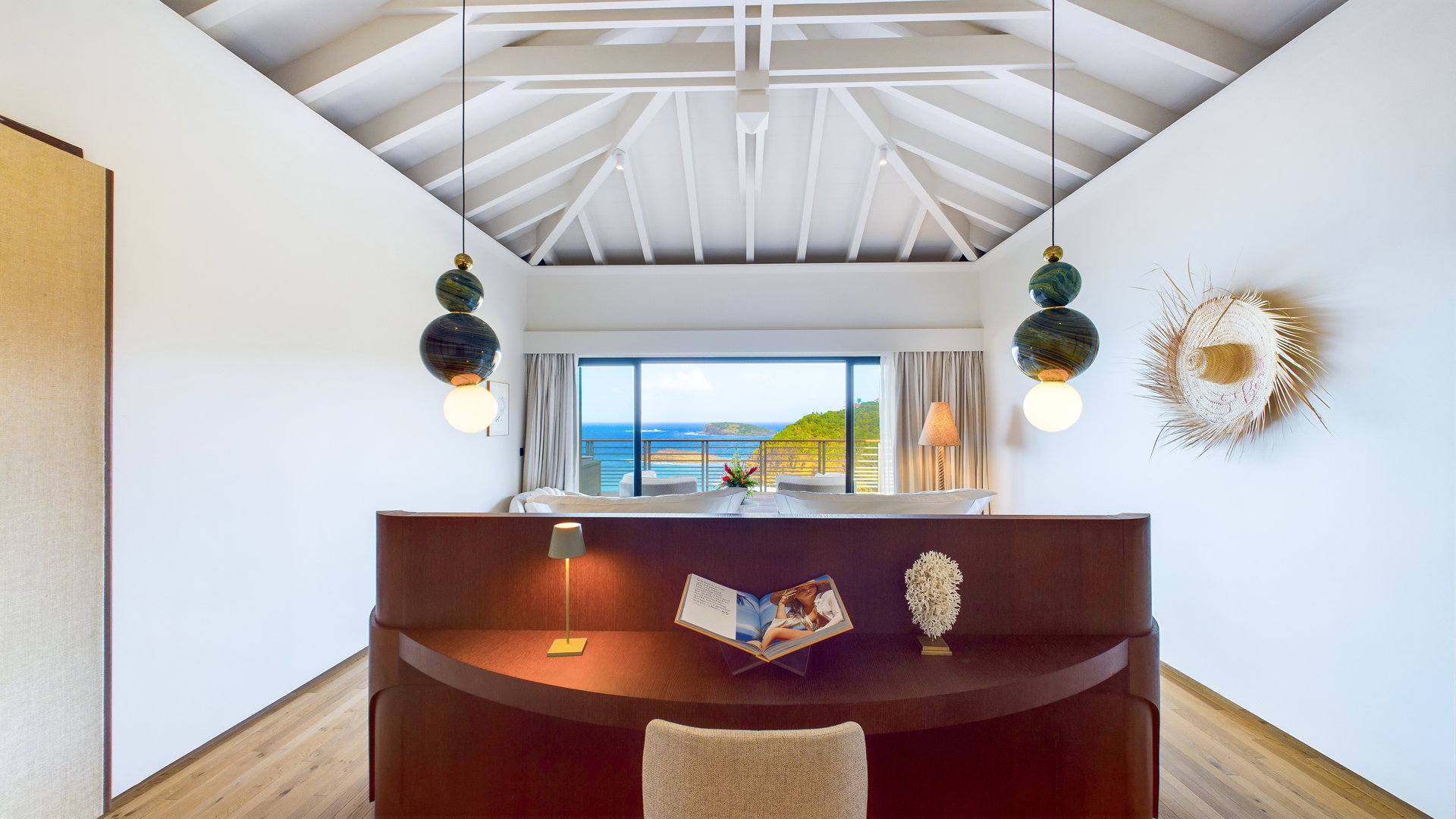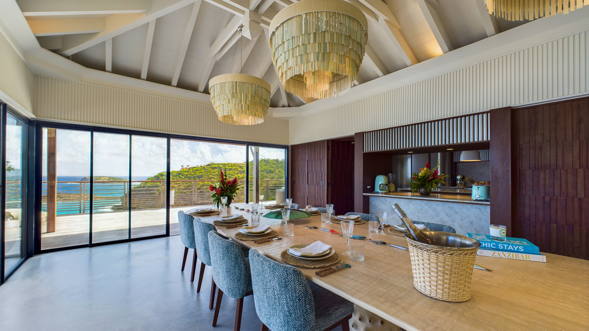 Built across two levels, villa BRAHAMA blends seamlessly into a a beautiful and outstanding environment. On the main level, the living area features an expansive lounge with rounded sofas beneath a ceiling dotted with pendant lights. At the front, floor‑to‑ceiling openings lead to the pool terrace, framing the majestic sweep of the turquoise ocean, a hue that you’ll find throughout the interior décor, mixed with soft ivory tones. At the back, the lounge opens onto a lush landscaped terrace that brings freshness and charm, centered around a romantic dining table. On the side, the kitchen includes a central island and full equipment perfect for hosting a private chef for events, with a dining area set at an angle to the living room, creating a warm, inviting atmosphere around the pool.