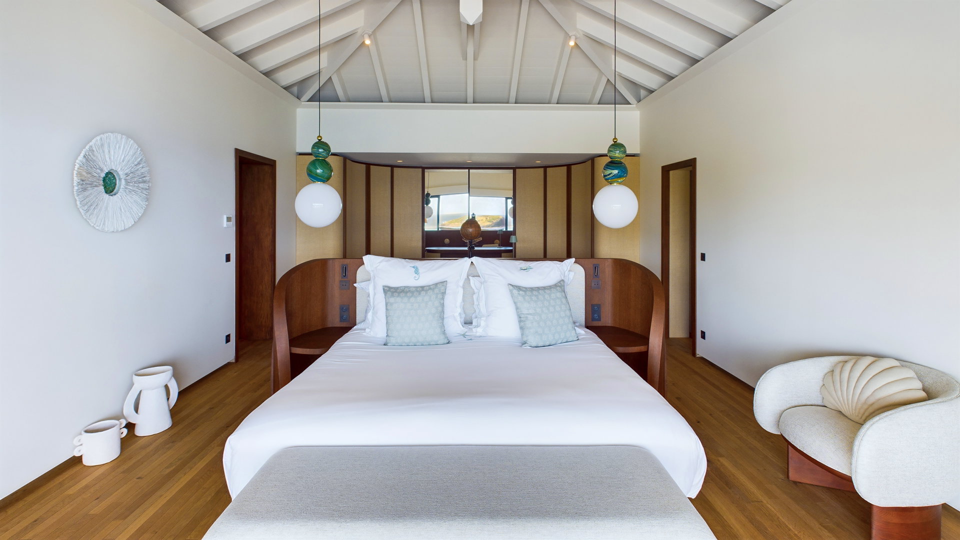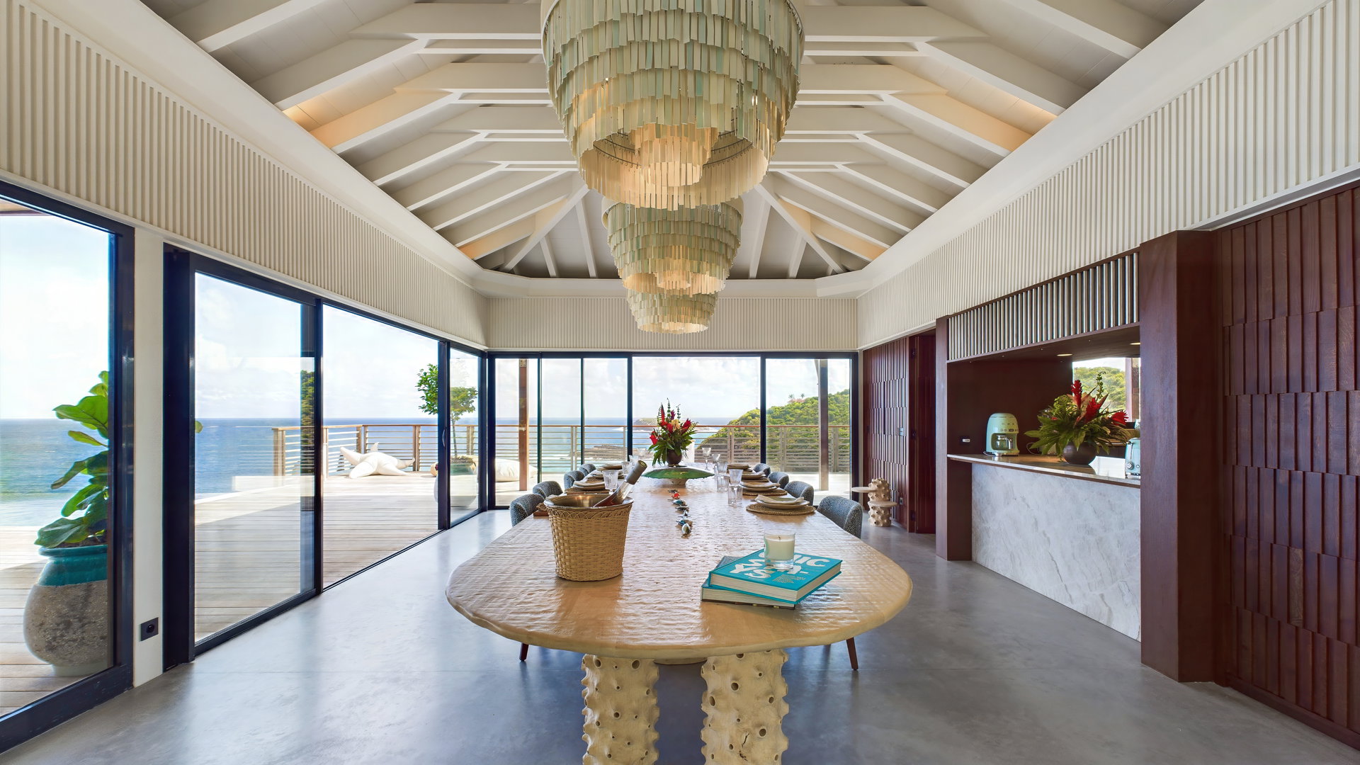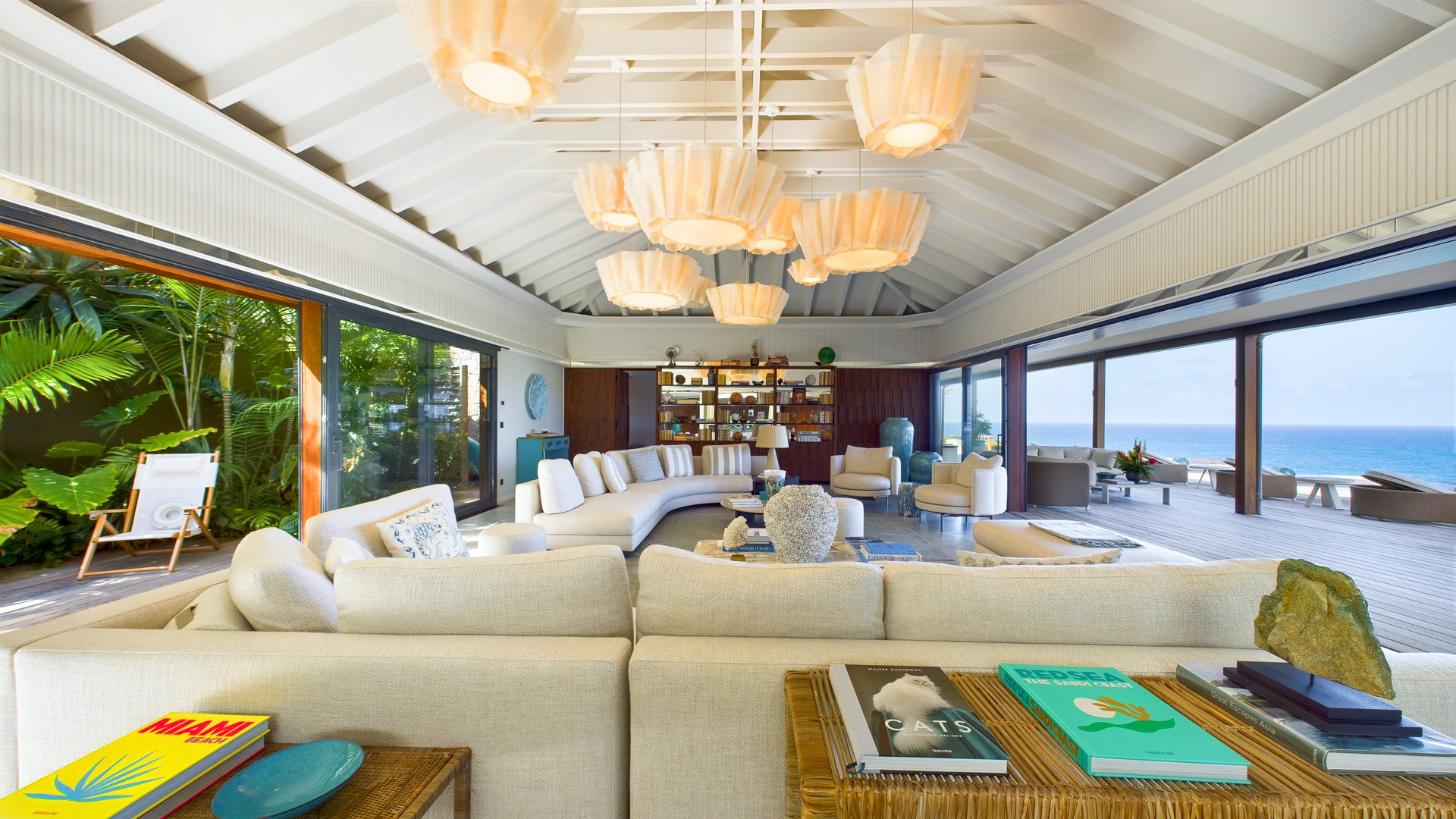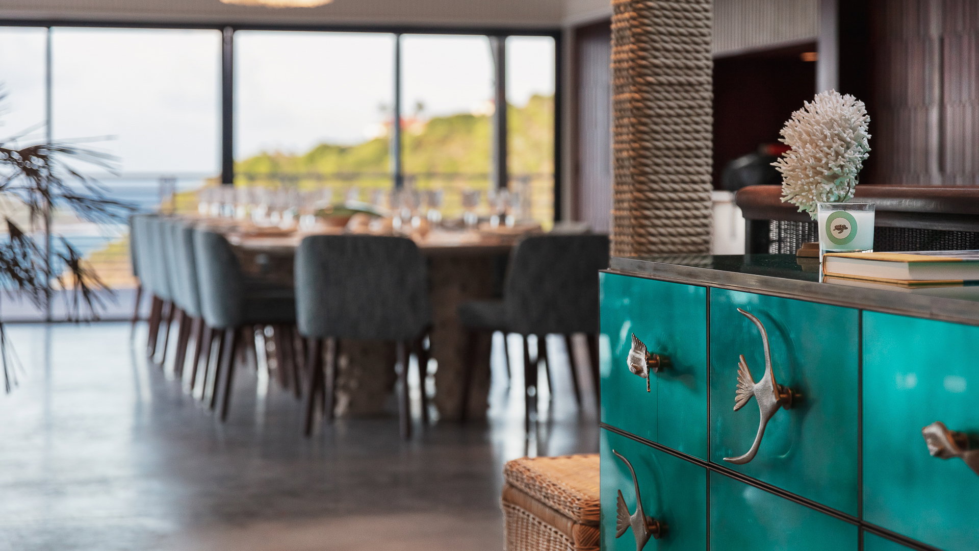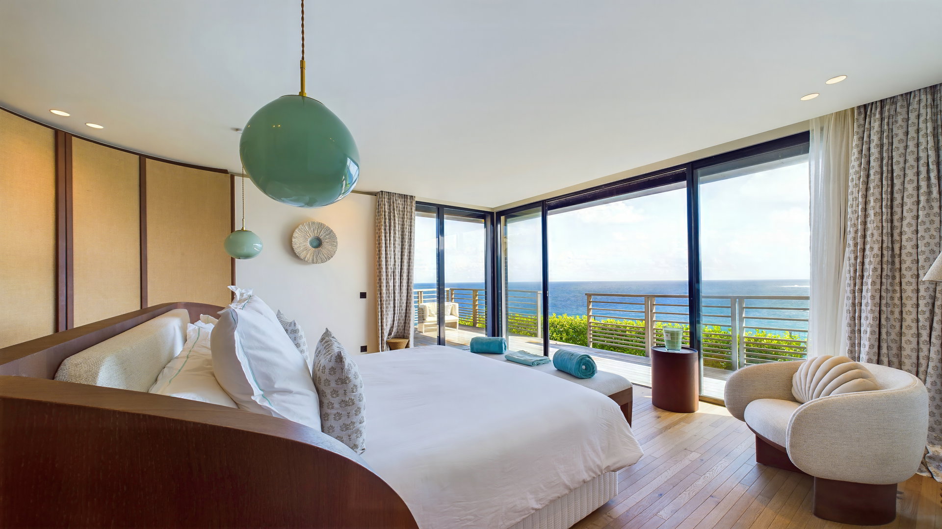 Built across two levels, villa BRAHAMA blends seamlessly into a a beautiful and outstanding environment. On the main level, the living area features an expansive lounge with rounded sofas beneath a ceiling dotted with pendant lights. At the front, floor‑to‑ceiling openings lead to the pool terrace, framing the majestic sweep of the turquoise ocean, a hue that you’ll find throughout the interior décor, mixed with soft ivory tones. At the back, the lounge opens onto a lush landscaped terrace that brings freshness and charm, centered around a romantic dining table. On the side, the kitchen includes a central island and full equipment perfect for hosting a private chef for events, with a dining area set at an angle to the living room, creating a warm, inviting atmosphere around the pool.