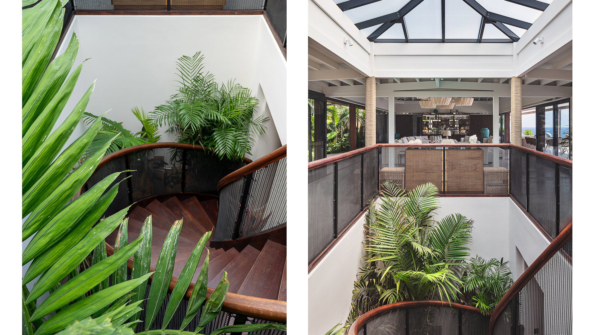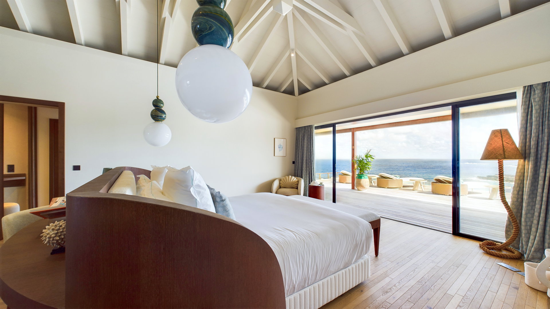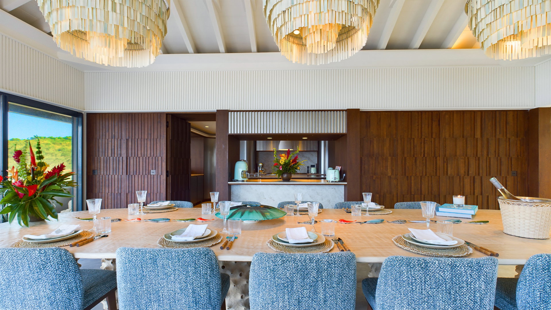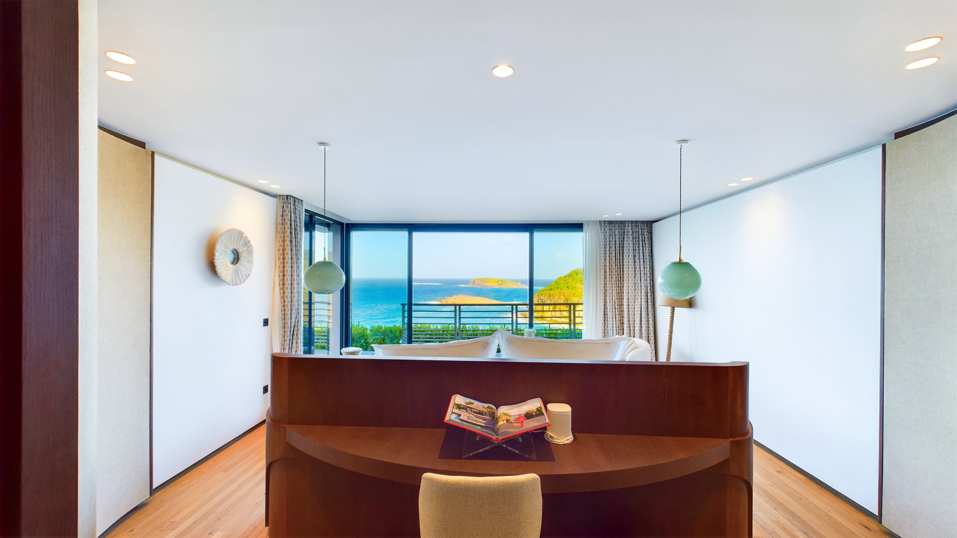 Built across two levels, villa BRAHAMA blends seamlessly into a a beautiful and outstanding environment. On the main level, the living area features an expansive lounge with rounded sofas beneath a ceiling dotted with pendant lights. At the front, floor‑to‑ceiling openings lead to the pool terrace, framing the majestic sweep of the turquoise ocean, a hue that you’ll find throughout the interior décor, mixed with soft ivory tones. At the back, the lounge opens onto a lush landscaped terrace that brings freshness and charm, centered around a romantic dining table. On the side, the kitchen includes a central island and full equipment perfect for hosting a private chef for events, with a dining area set at an angle to the living room, creating a warm, inviting atmosphere around the pool.