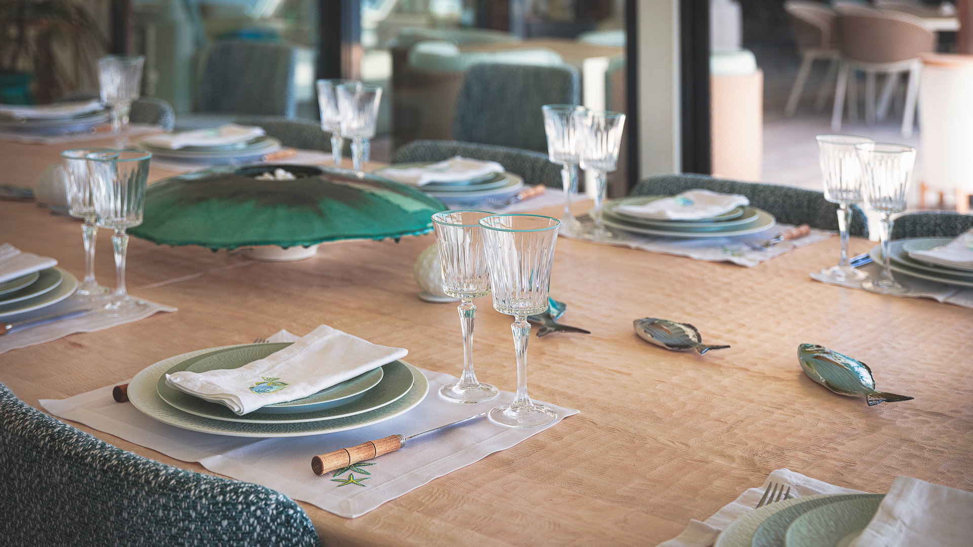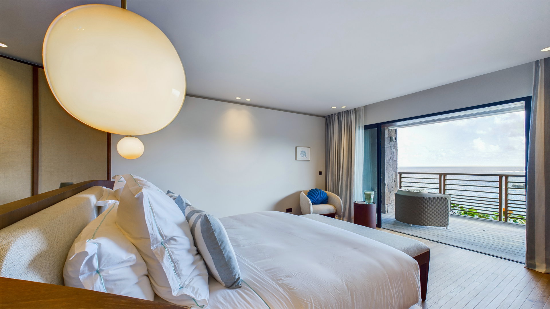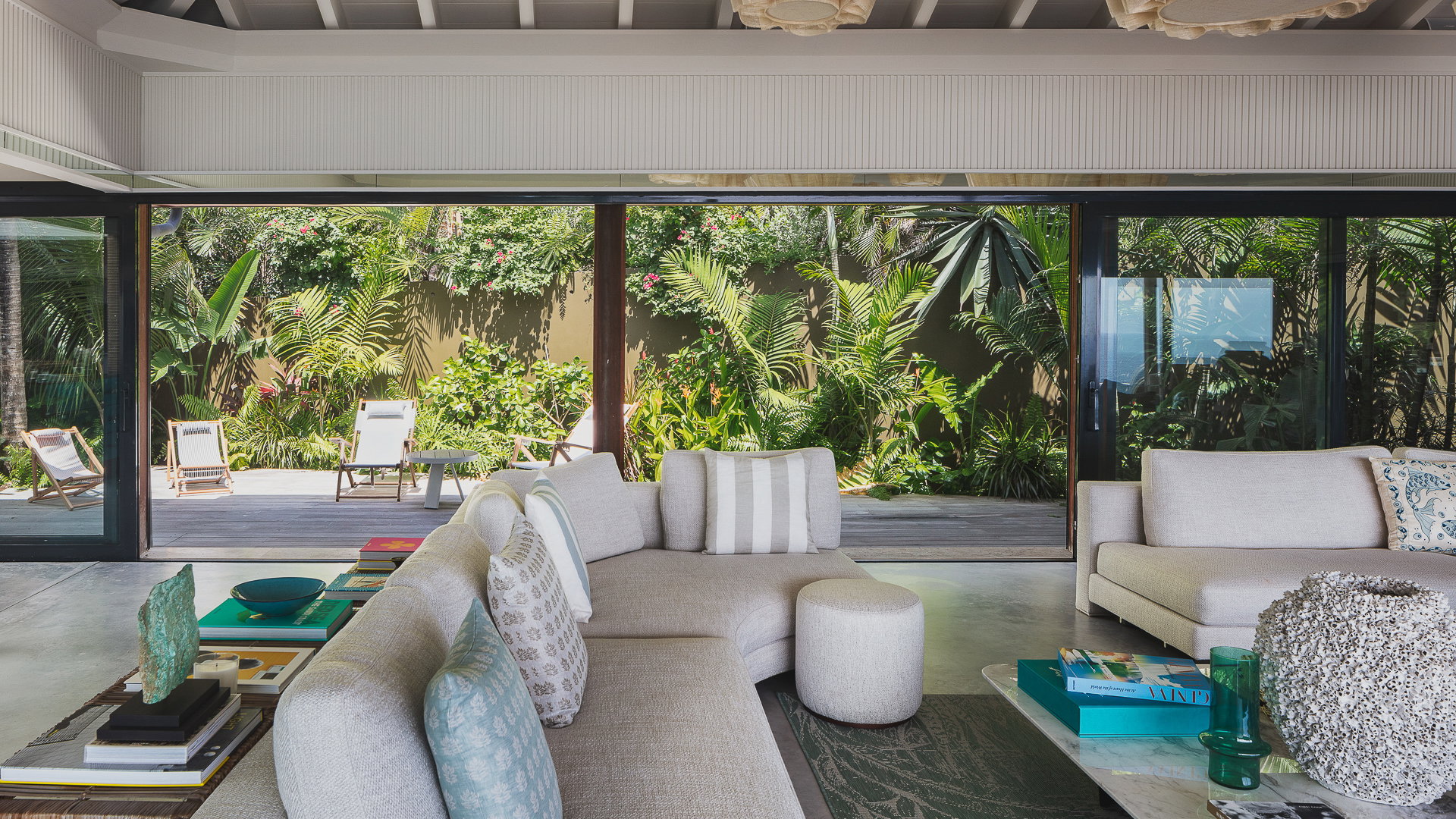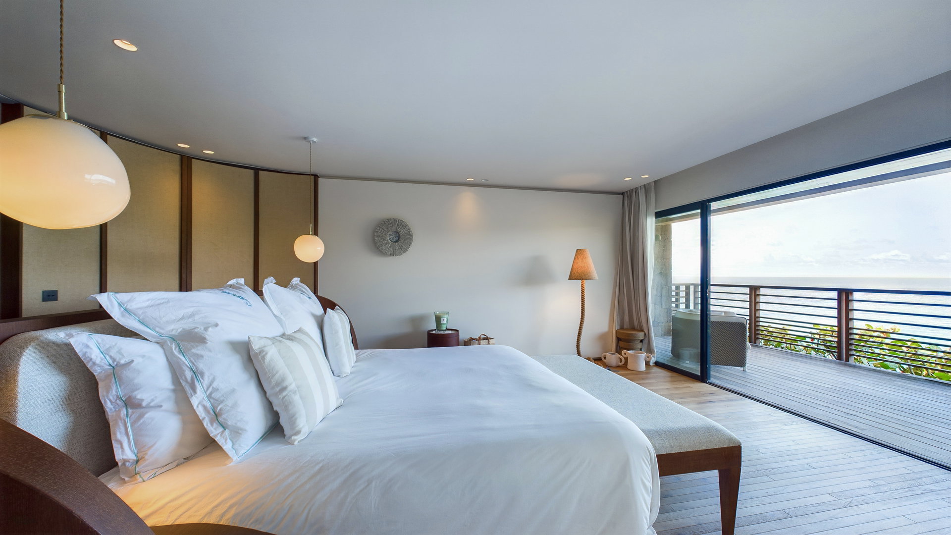 Built across two levels, villa BRAHAMA blends seamlessly into a a beautiful and outstanding environment. On the main level, the living area features an expansive lounge with rounded sofas beneath a ceiling dotted with pendant lights. At the front, floor‑to‑ceiling openings lead to the pool terrace, framing the majestic sweep of the turquoise ocean, a hue that you’ll find throughout the interior décor, mixed with soft ivory tones. At the back, the lounge opens onto a lush landscaped terrace that brings freshness and charm, centered around a romantic dining table. On the side, the kitchen includes a central island and full equipment perfect for hosting a private chef for events, with a dining area set at an angle to the living room, creating a warm, inviting atmosphere around the pool.