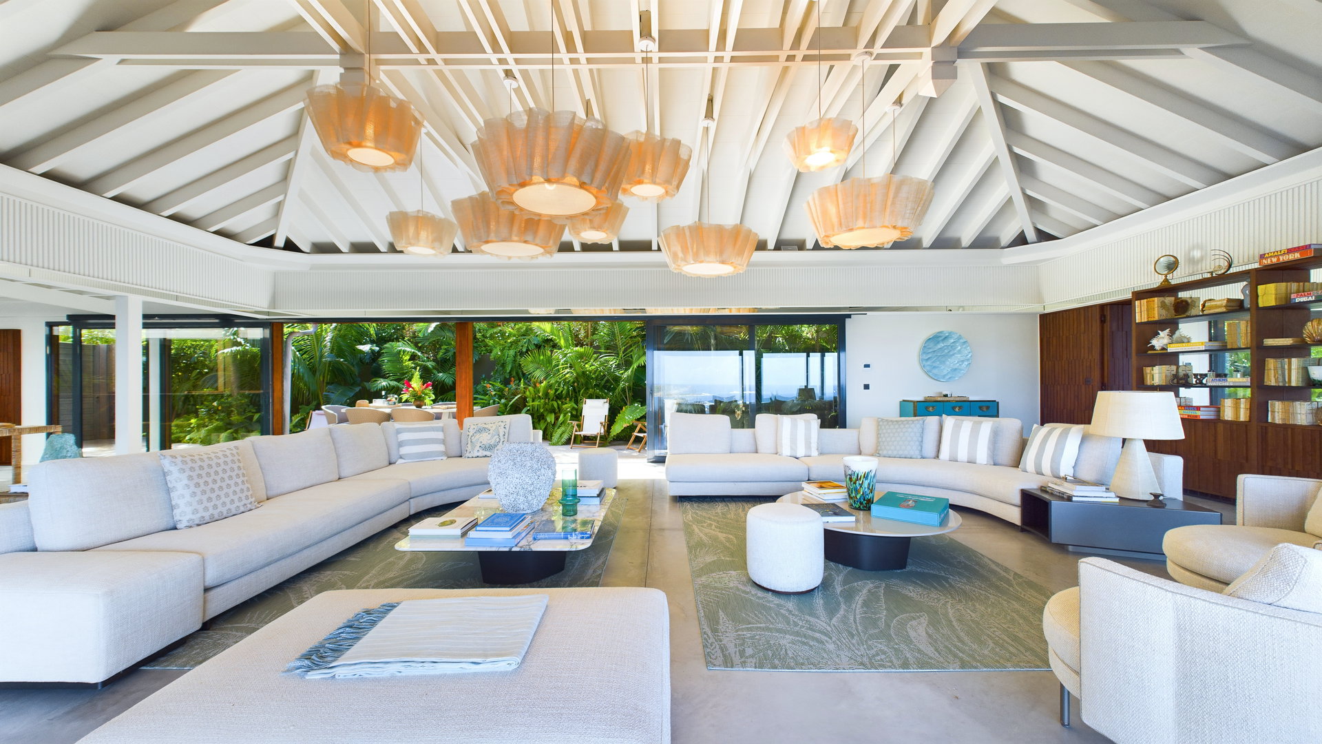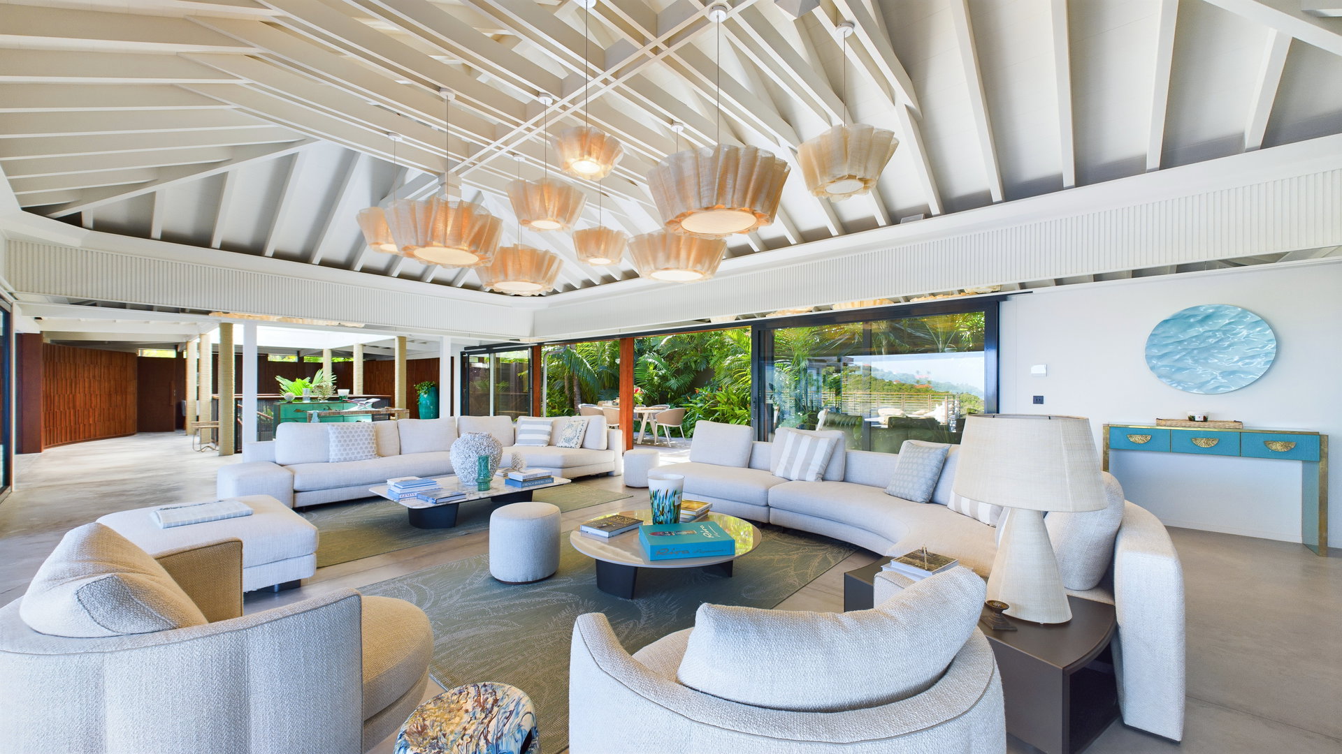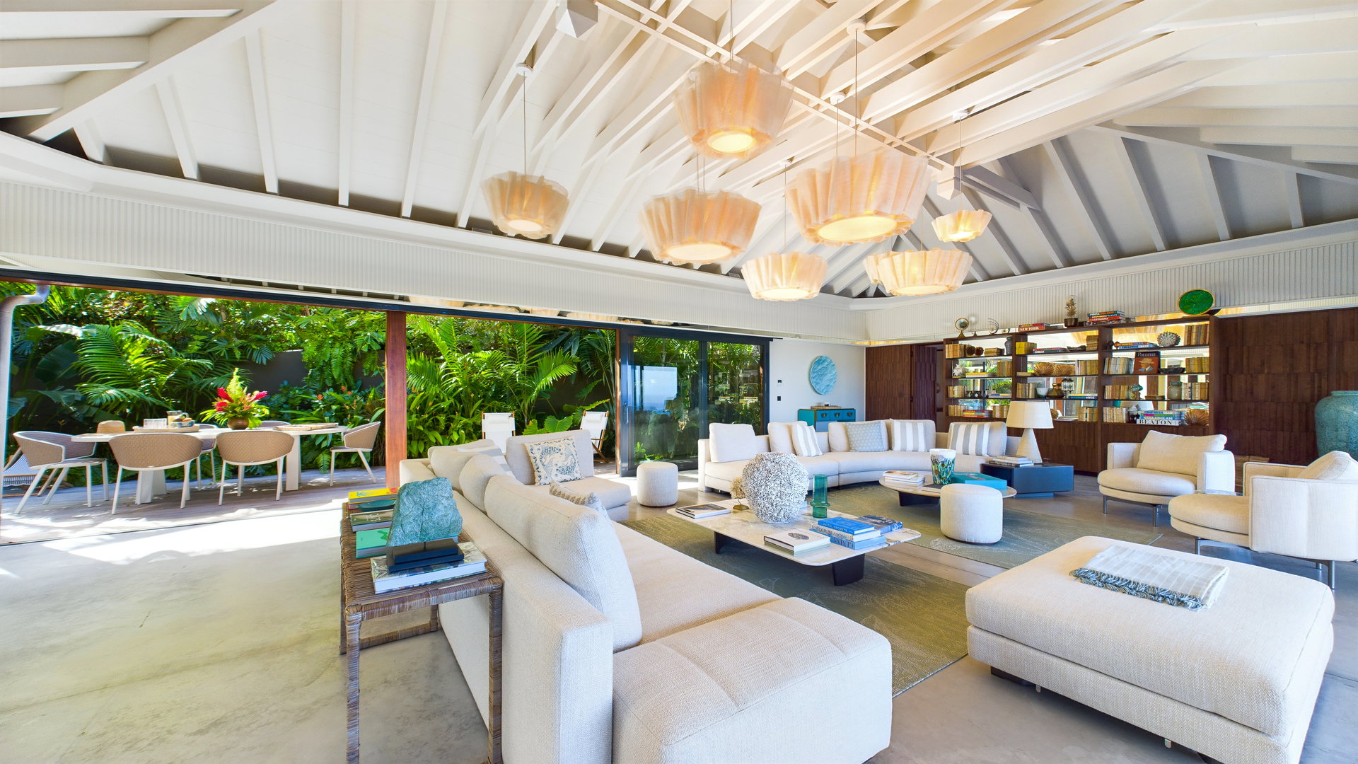 Located at the entrance level. Huge covered but also Air-conditoned living room with tropical breezes opening onto a rock garden on one side and the pool patio with ocean views on the other.