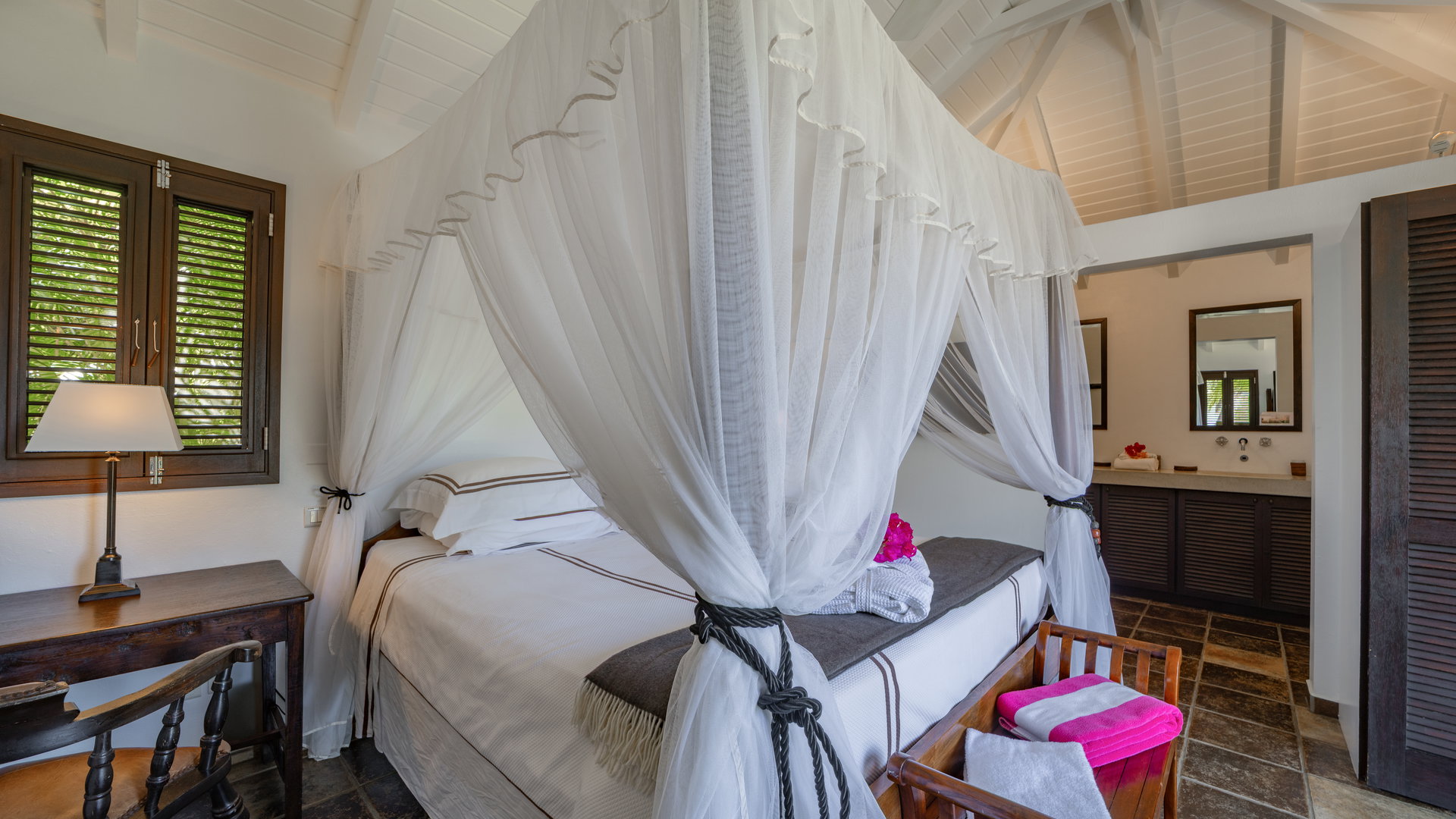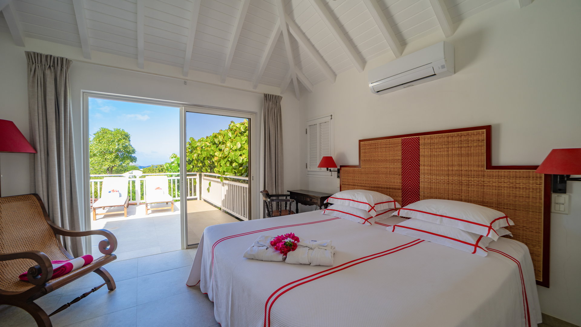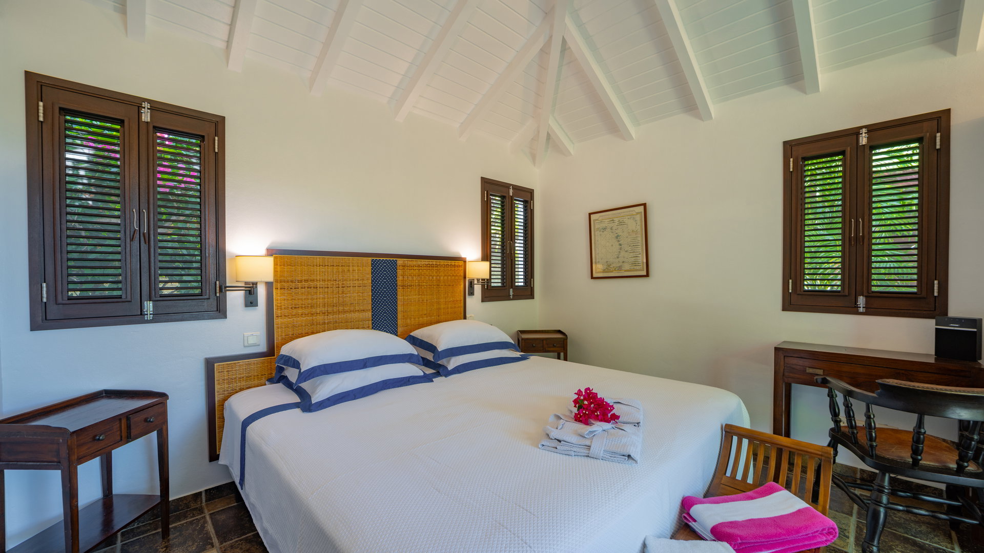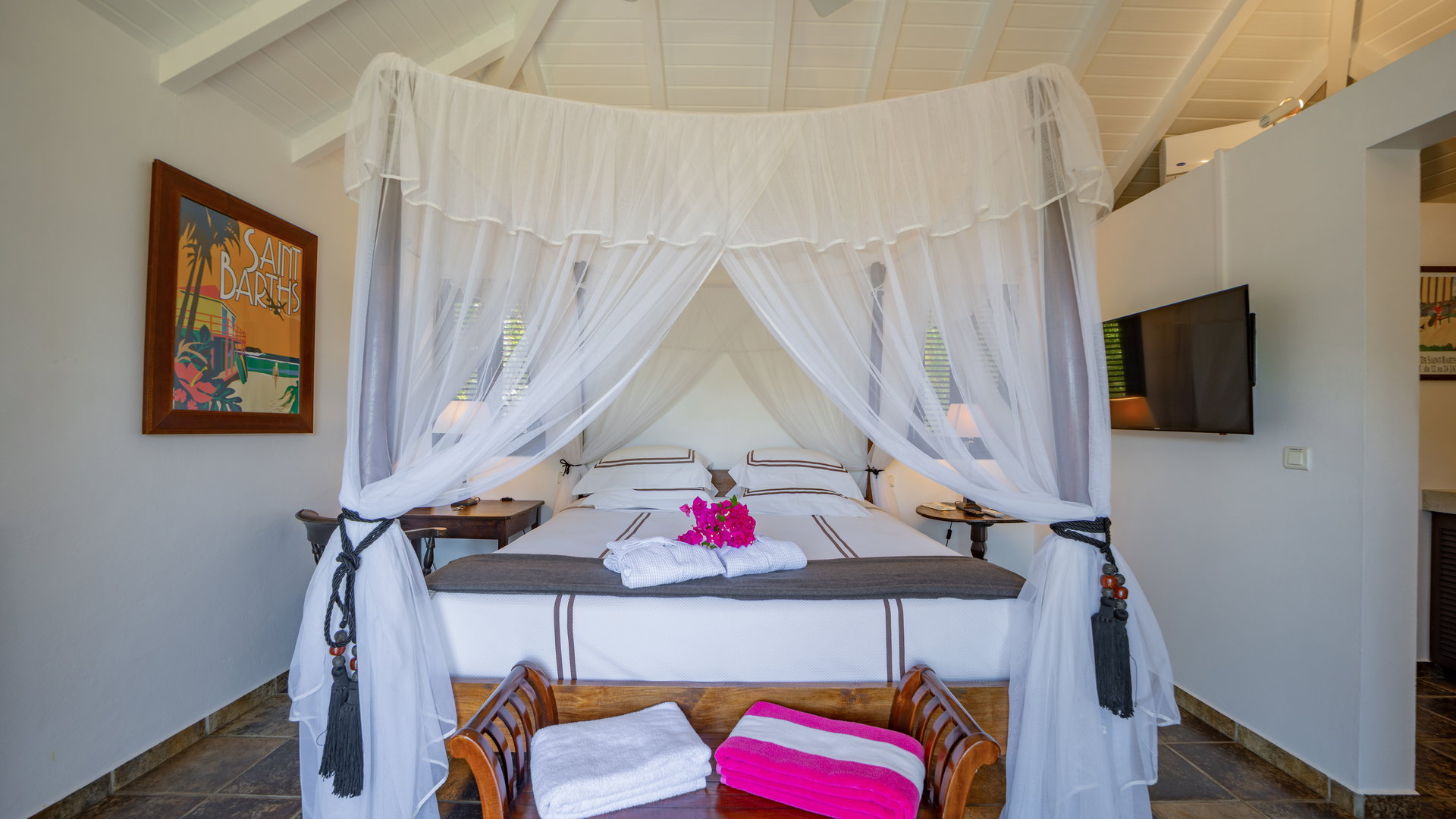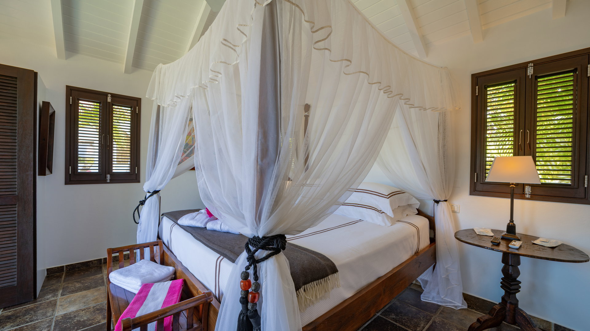 The vacation rental St-Barts KIR ROYAL consists of four bedrooms, each with an en-suite bathroom and either a king-size canopy bed or convertible twin beds. Two bedrooms are located near the main living area, while the other two are in the bungalow. You’ll love the views of the surrounding landscape, which create a soothing, restful atmosphere ideal for relaxation.