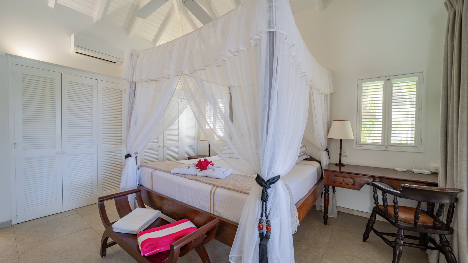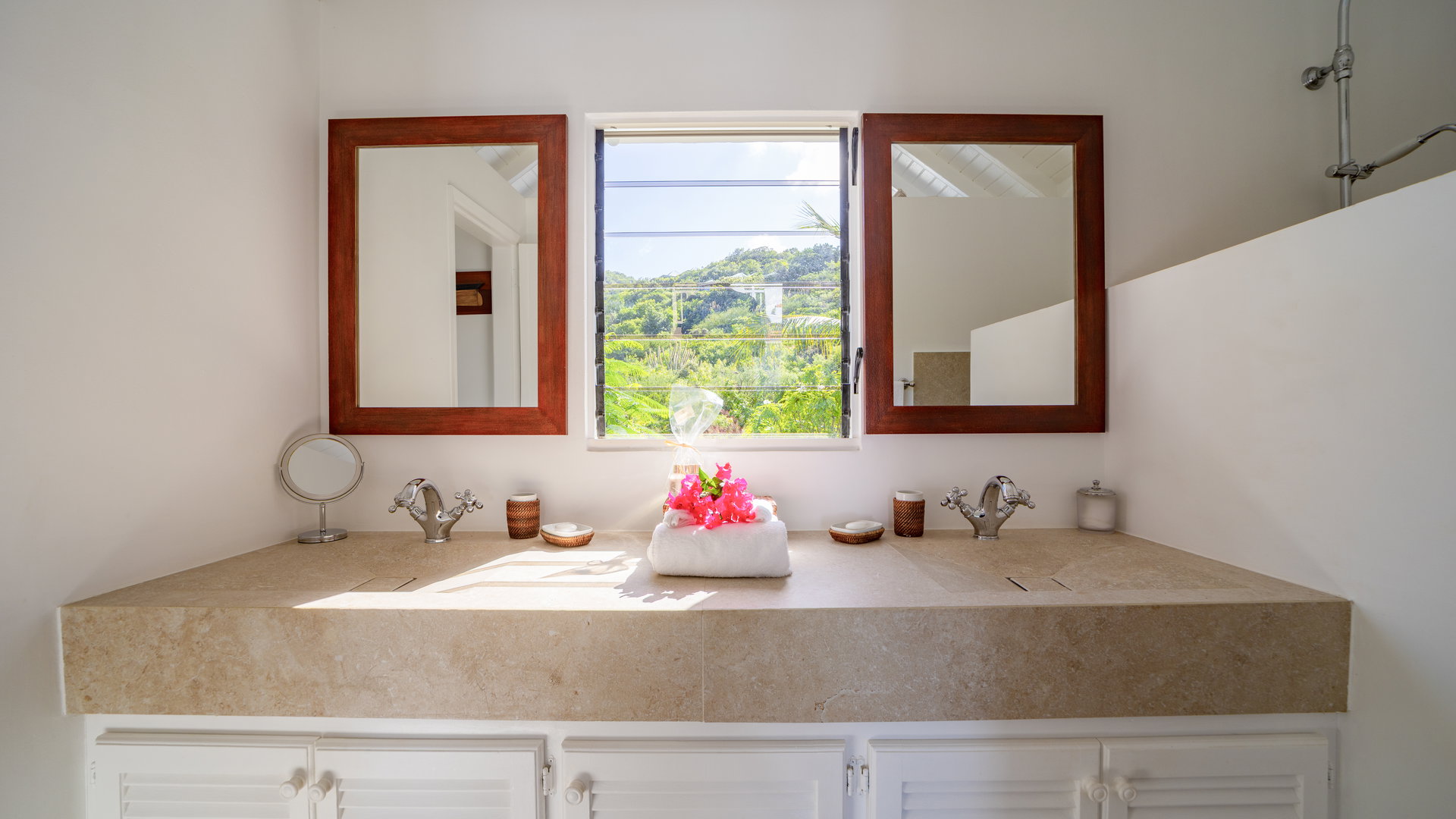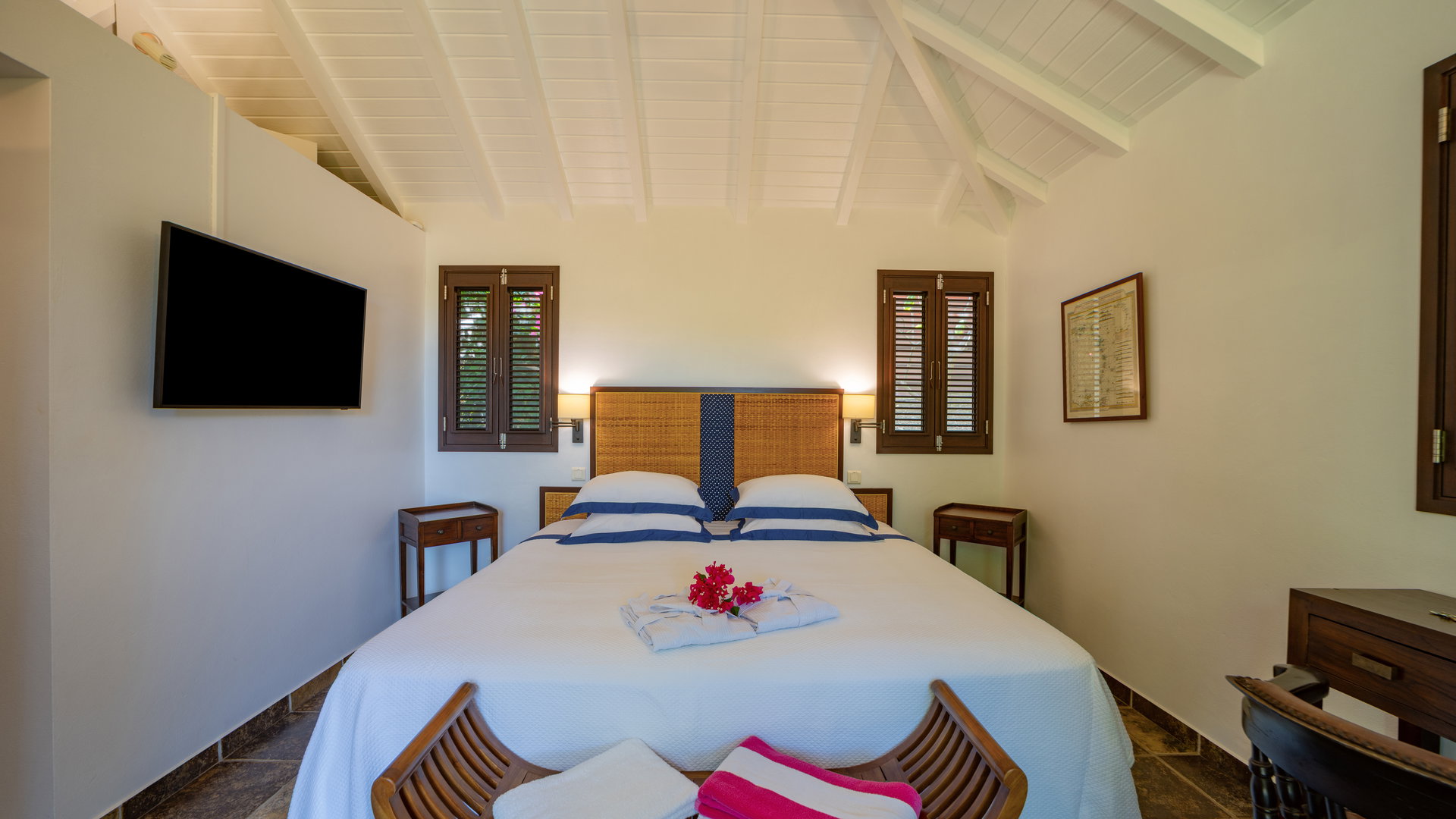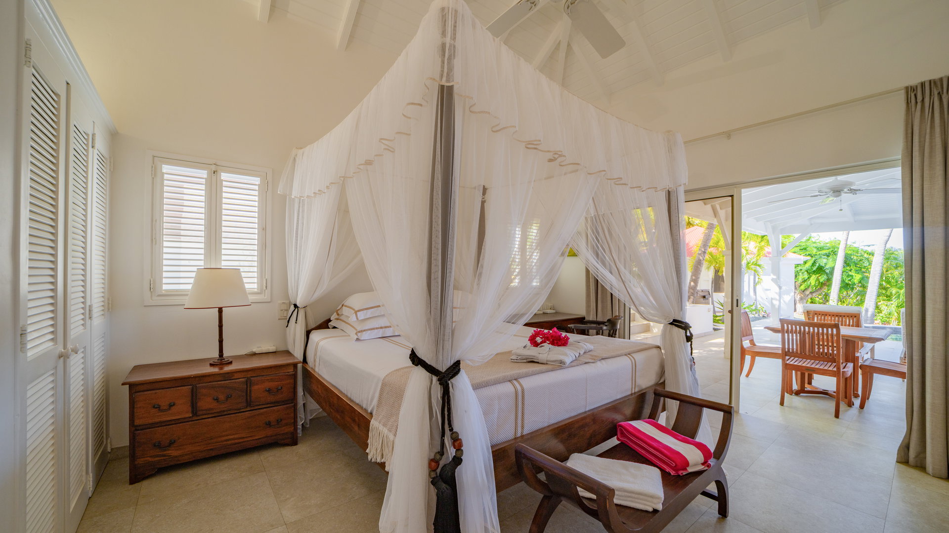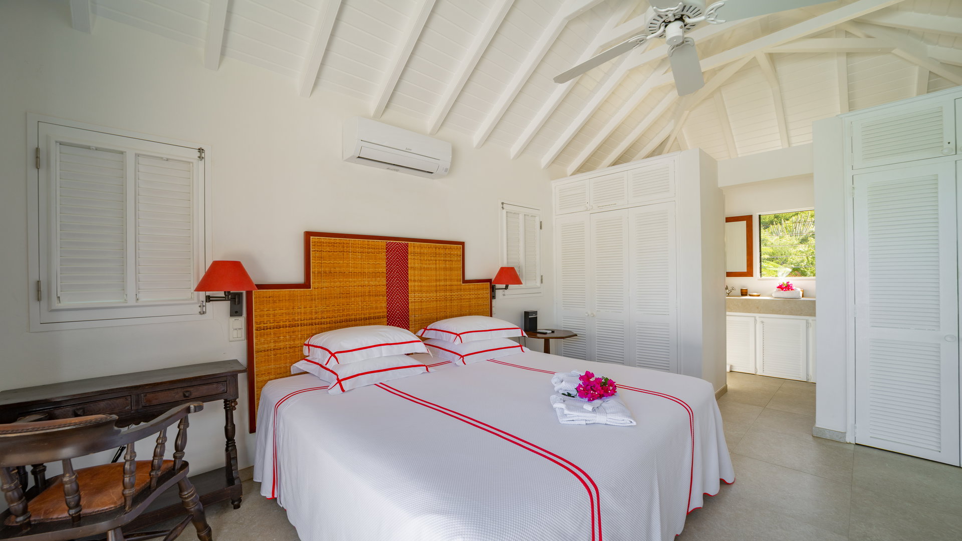The vacation rental St-Barts KIR ROYAL consists of four bedrooms, each with an en-suite bathroom and either a king-size canopy bed or convertible twin beds. Two bedrooms are located near the main living area, while the other two are in the bungalow. You’ll love the views of the surrounding landscape, which create a soothing, restful atmosphere ideal for relaxation.