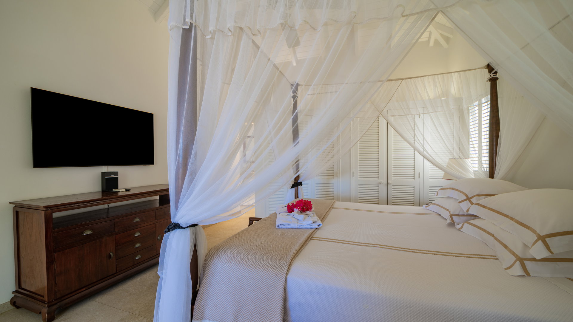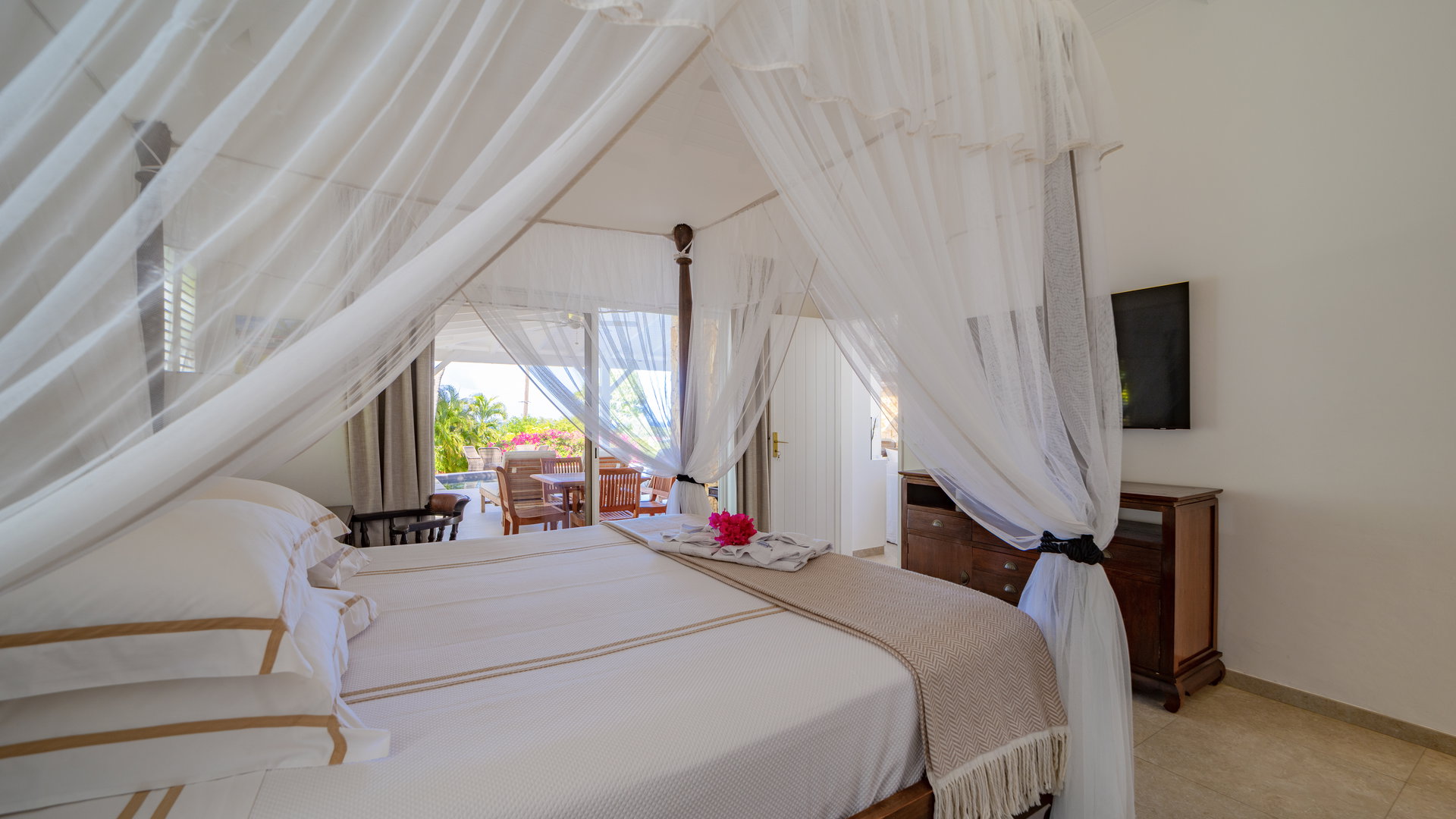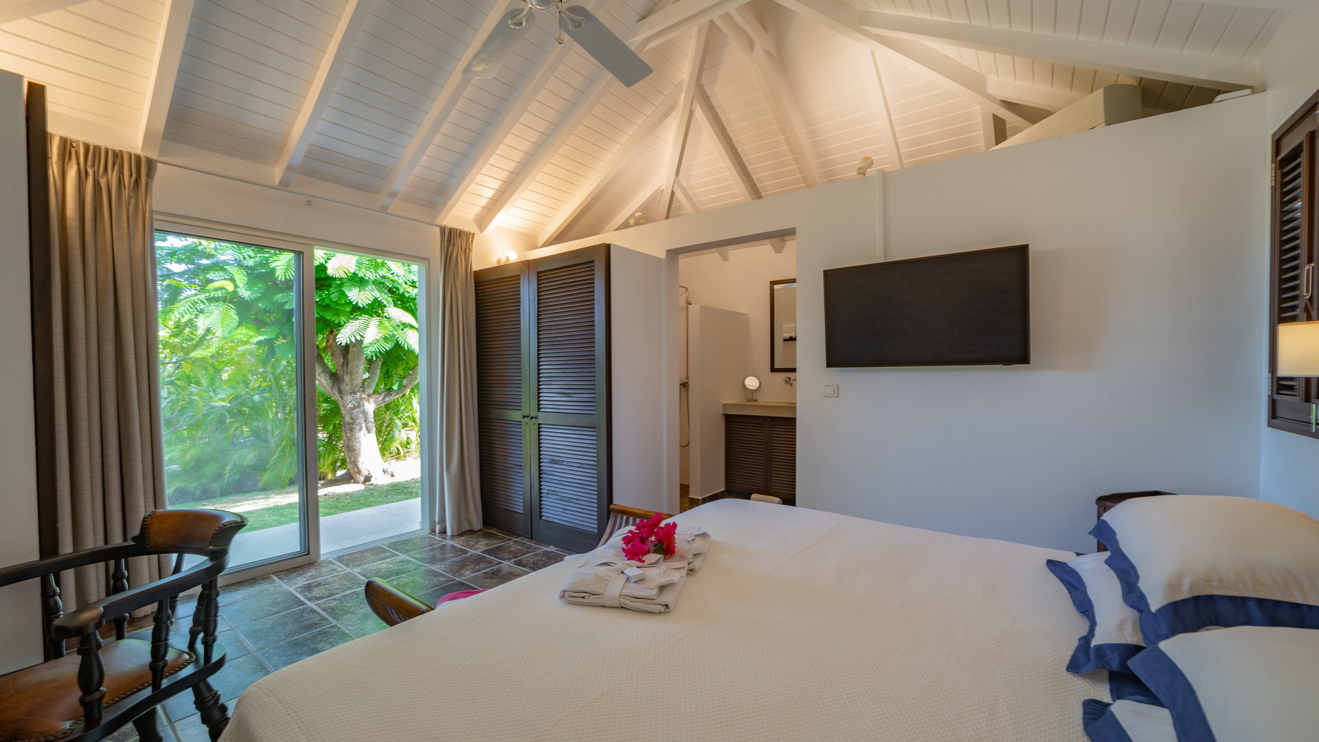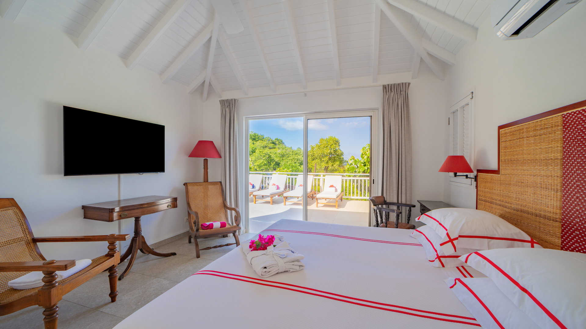 The vacation rental St-Barts KIR ROYAL consists of four bedrooms, each with an en-suite bathroom and either a king-size canopy bed or convertible twin beds. Two bedrooms are located near the main living area, while the other two are in the bungalow. You’ll love the views of the surrounding landscape, which create a soothing, restful atmosphere ideal for relaxation.