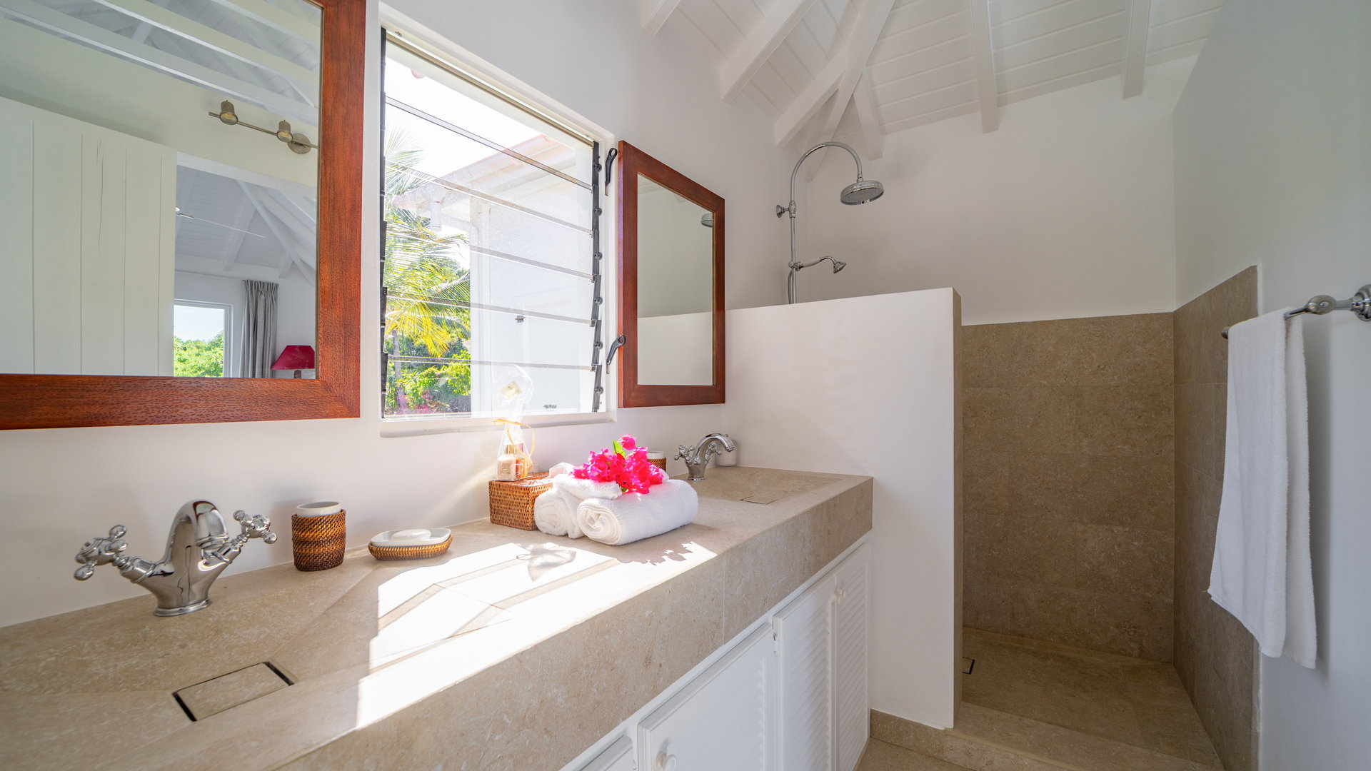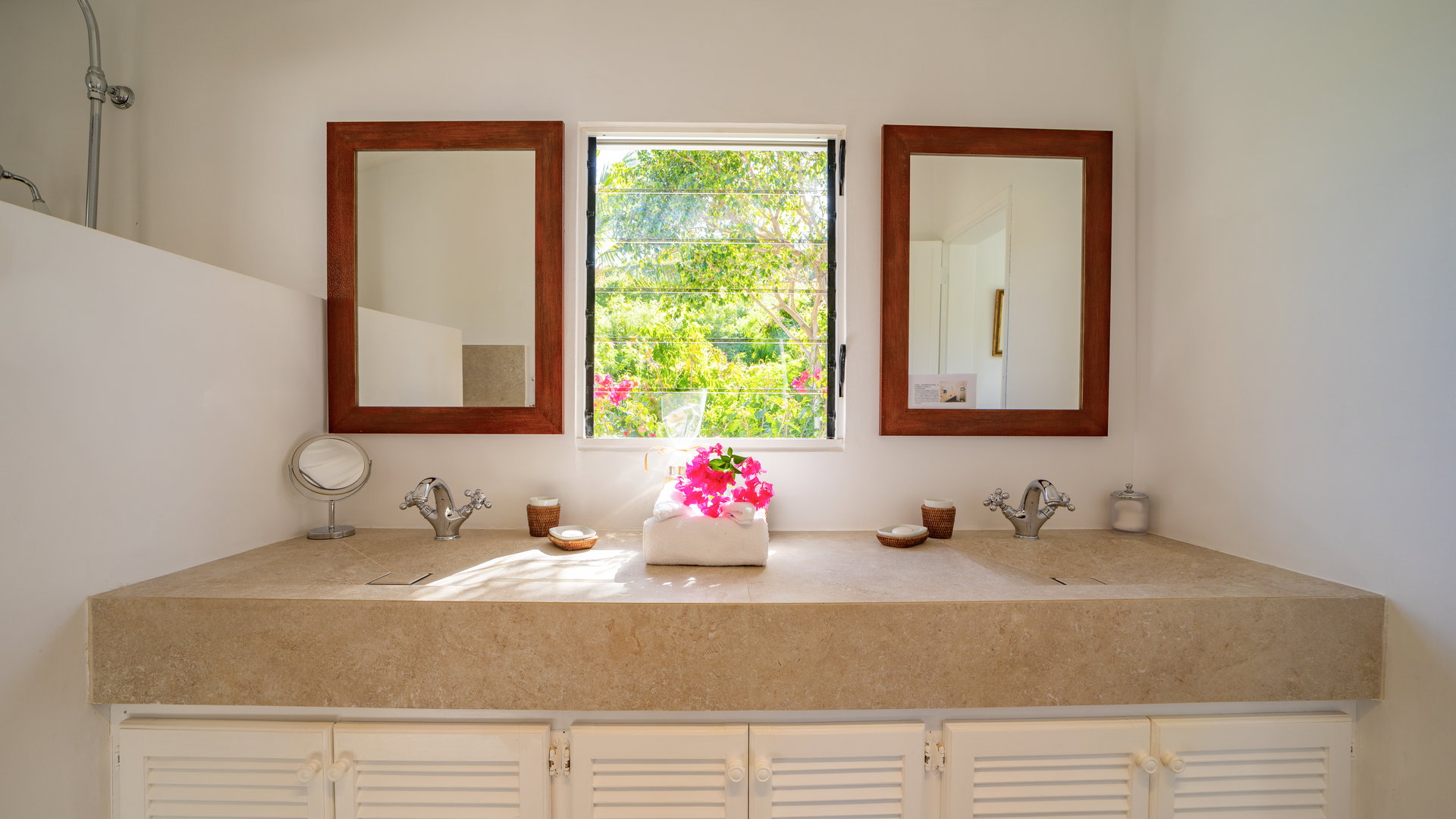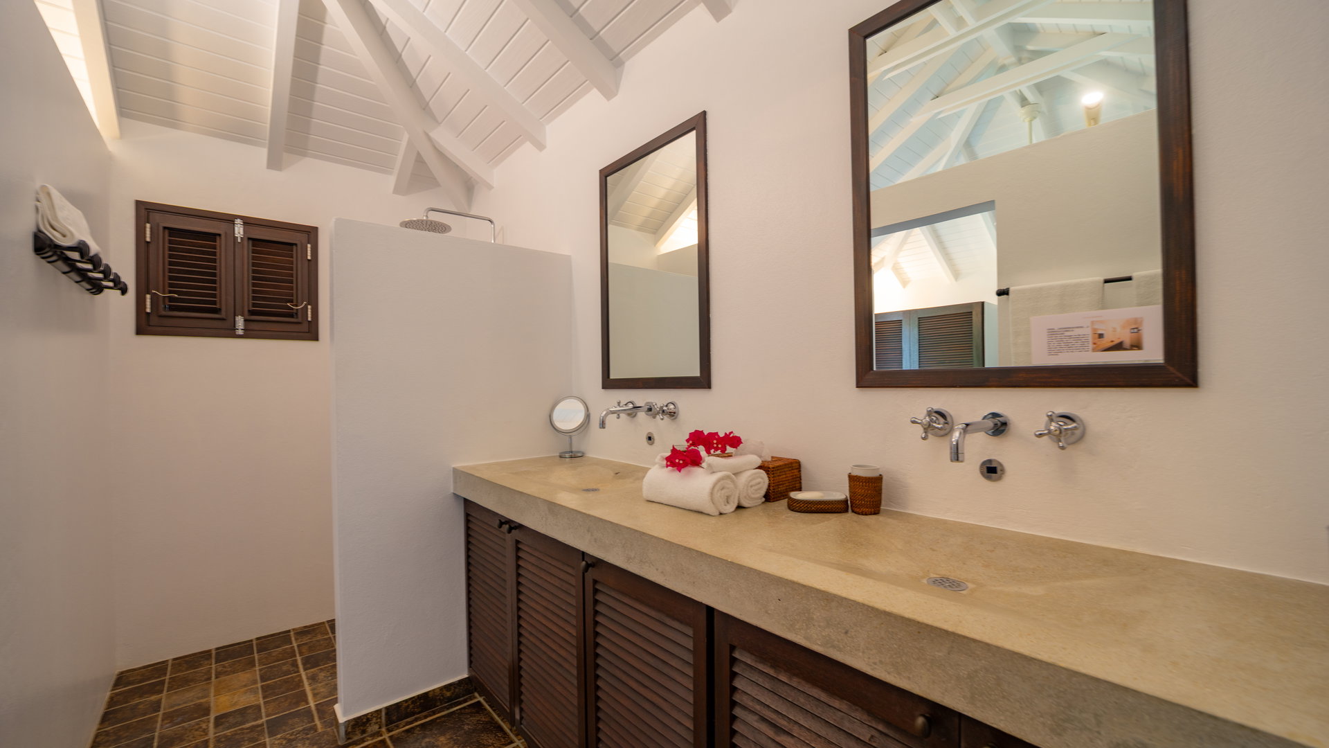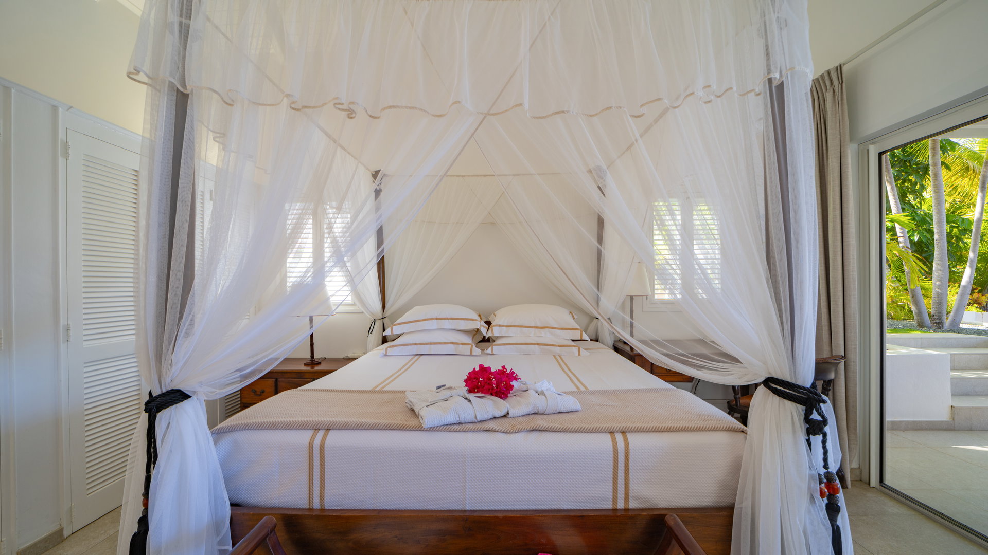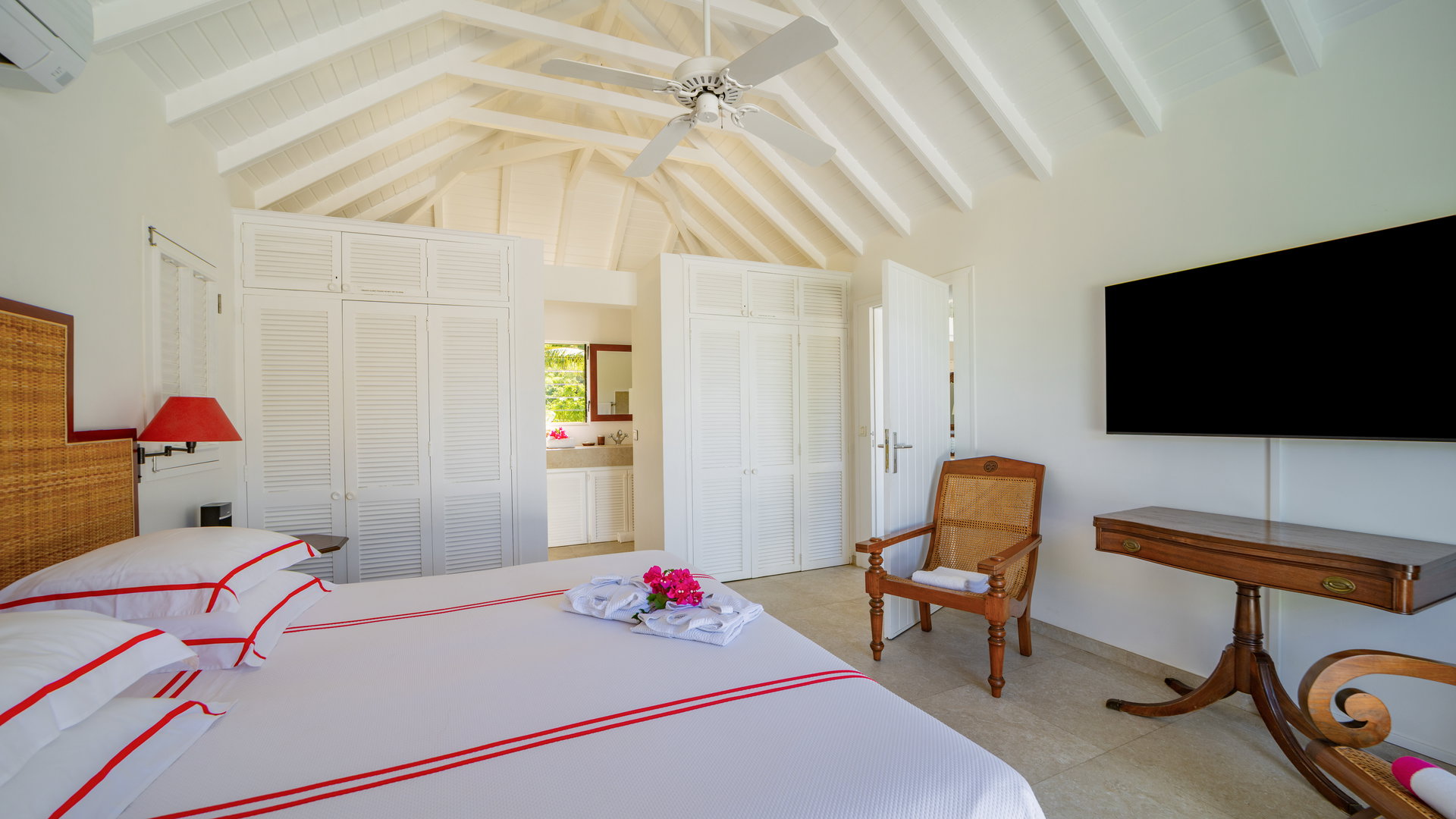The vacation rental St-Barts KIR ROYAL consists of four bedrooms, each with an en-suite bathroom and either a king-size canopy bed or convertible twin beds. Two bedrooms are located near the main living area, while the other two are in the bungalow. You’ll love the views of the surrounding landscape, which create a soothing, restful atmosphere ideal for relaxation.