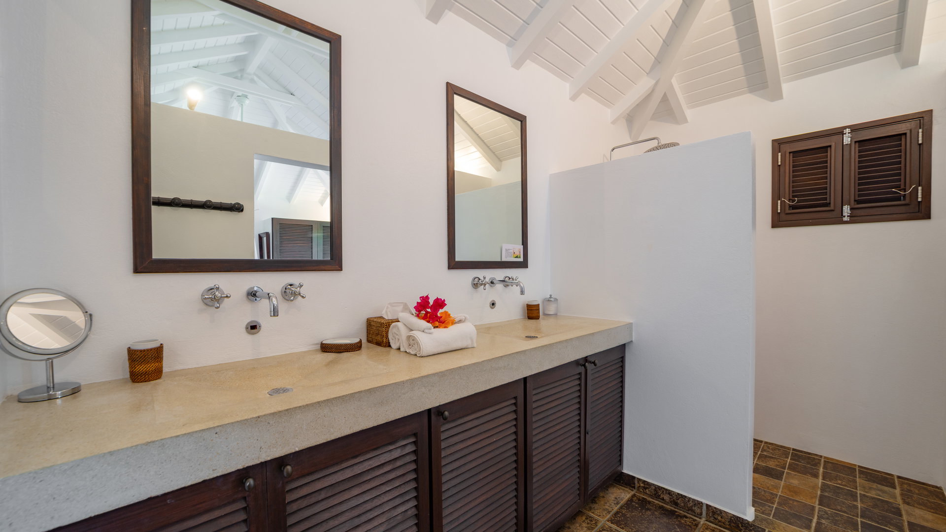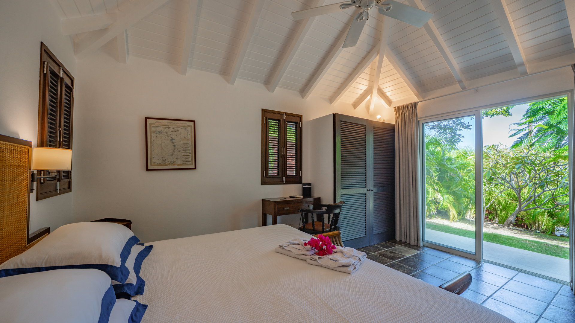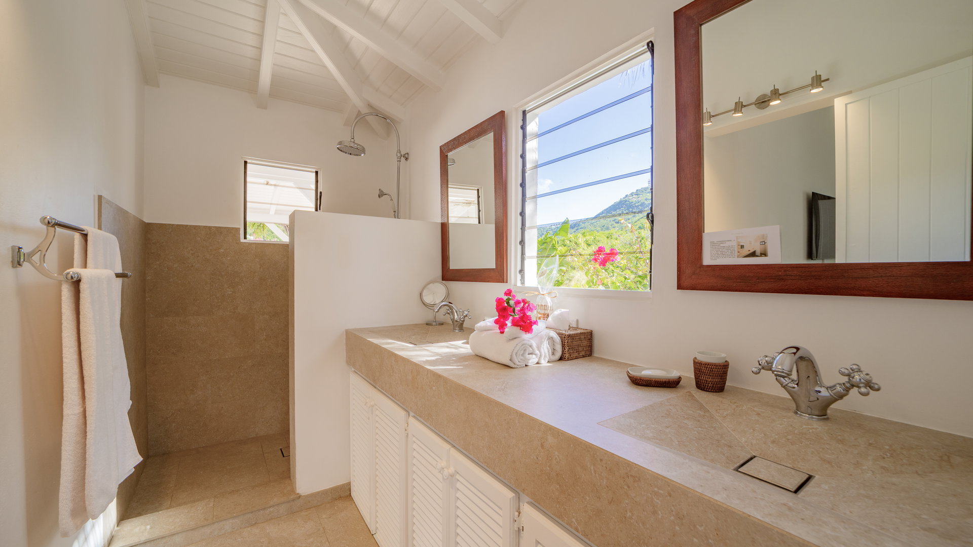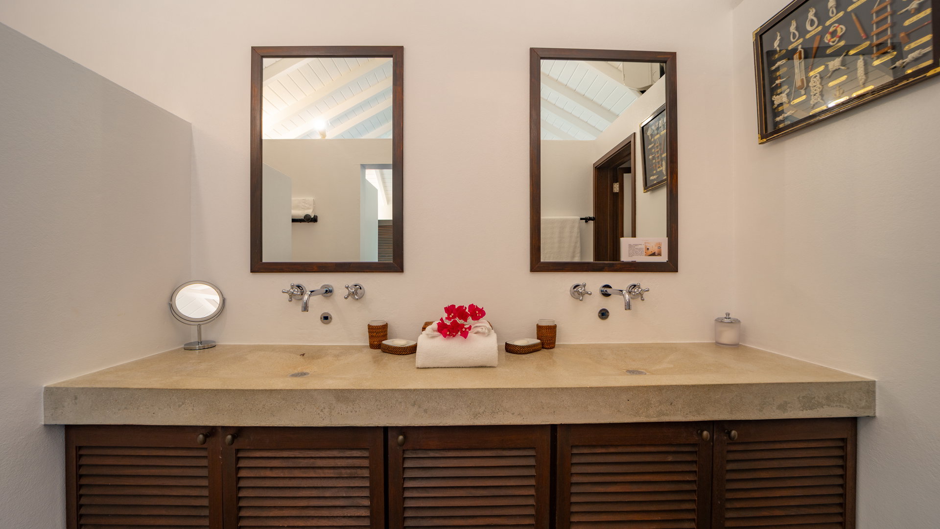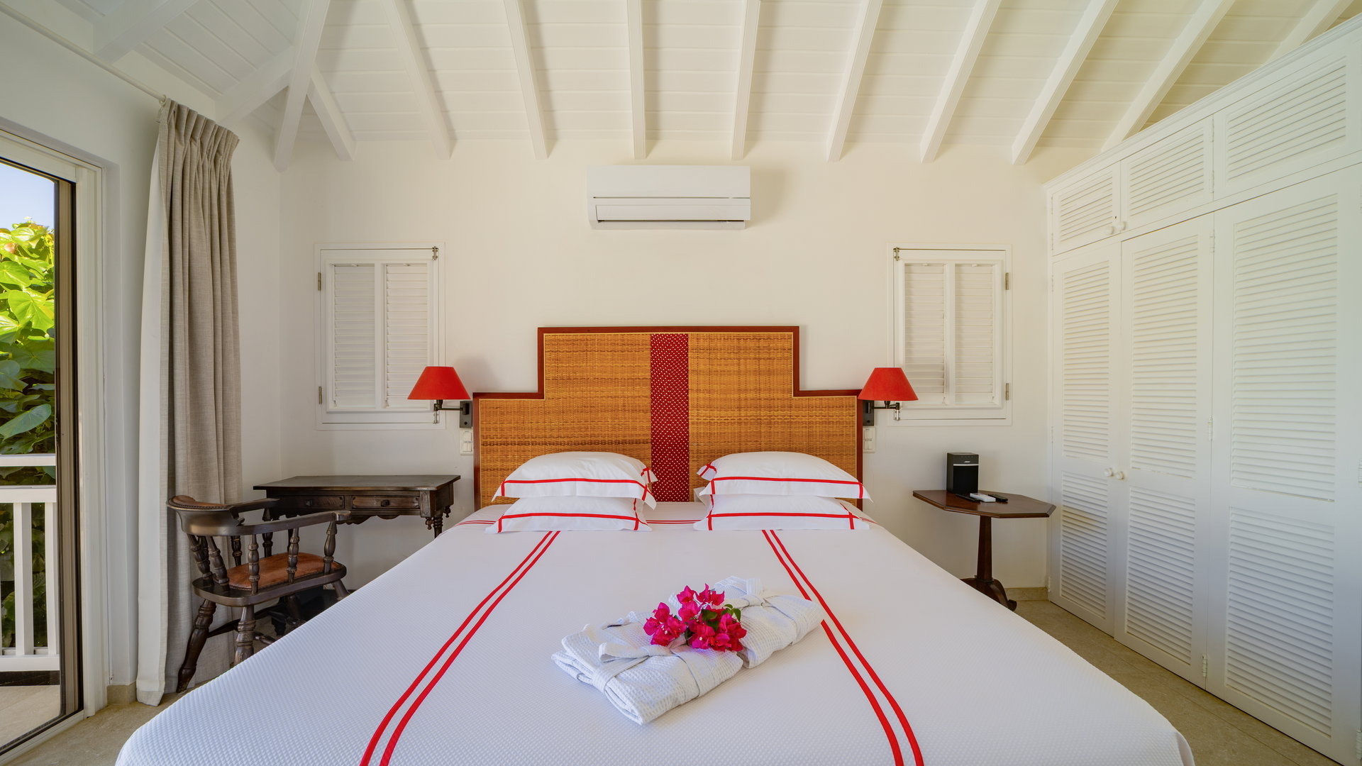 The vacation rental St-Barts KIR ROYAL consists of four bedrooms, each with an en-suite bathroom and either a king-size canopy bed or convertible twin beds. Two bedrooms are located near the main living area, while the other two are in the bungalow. You’ll love the views of the surrounding landscape, which create a soothing, restful atmosphere ideal for relaxation.