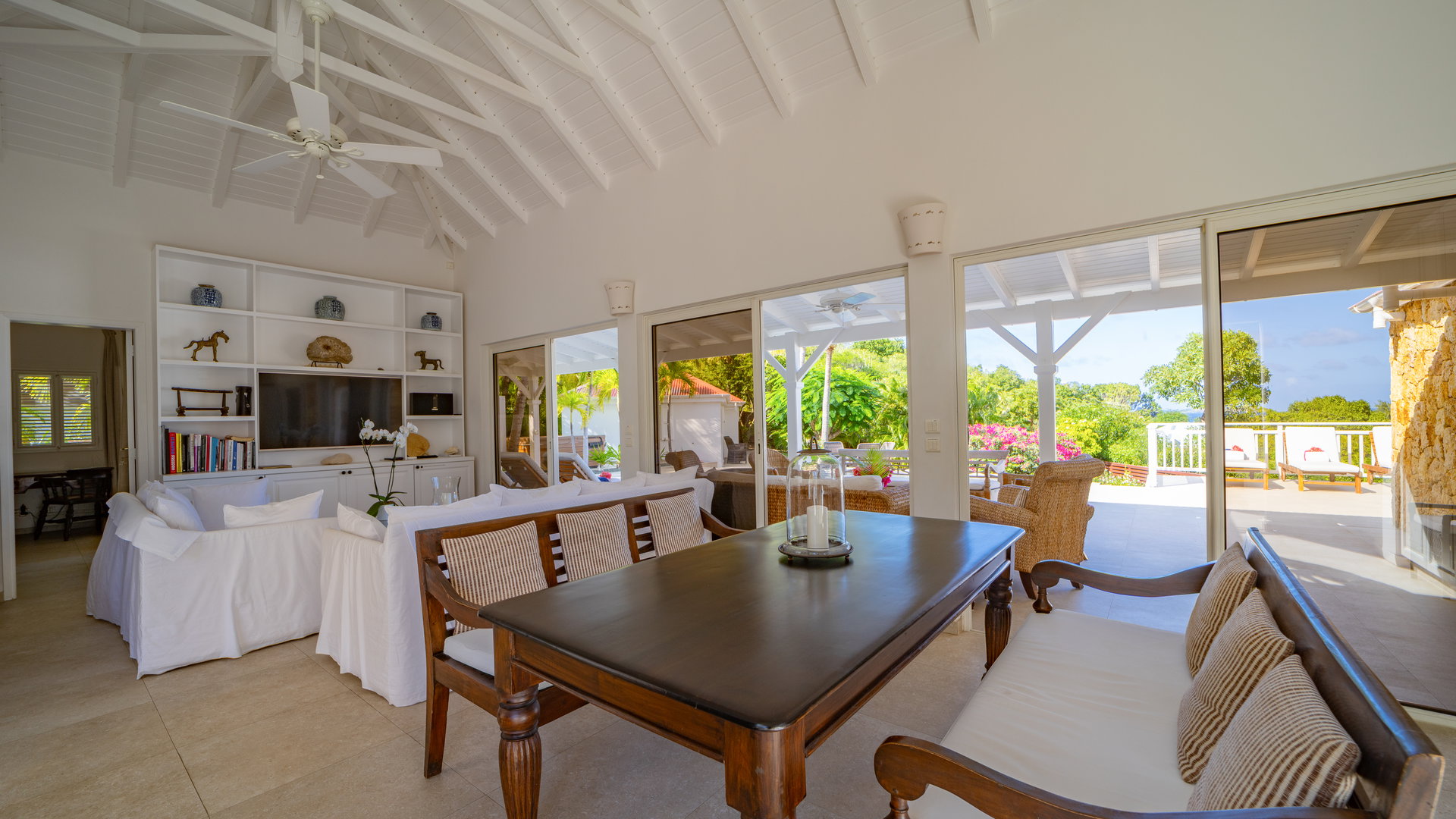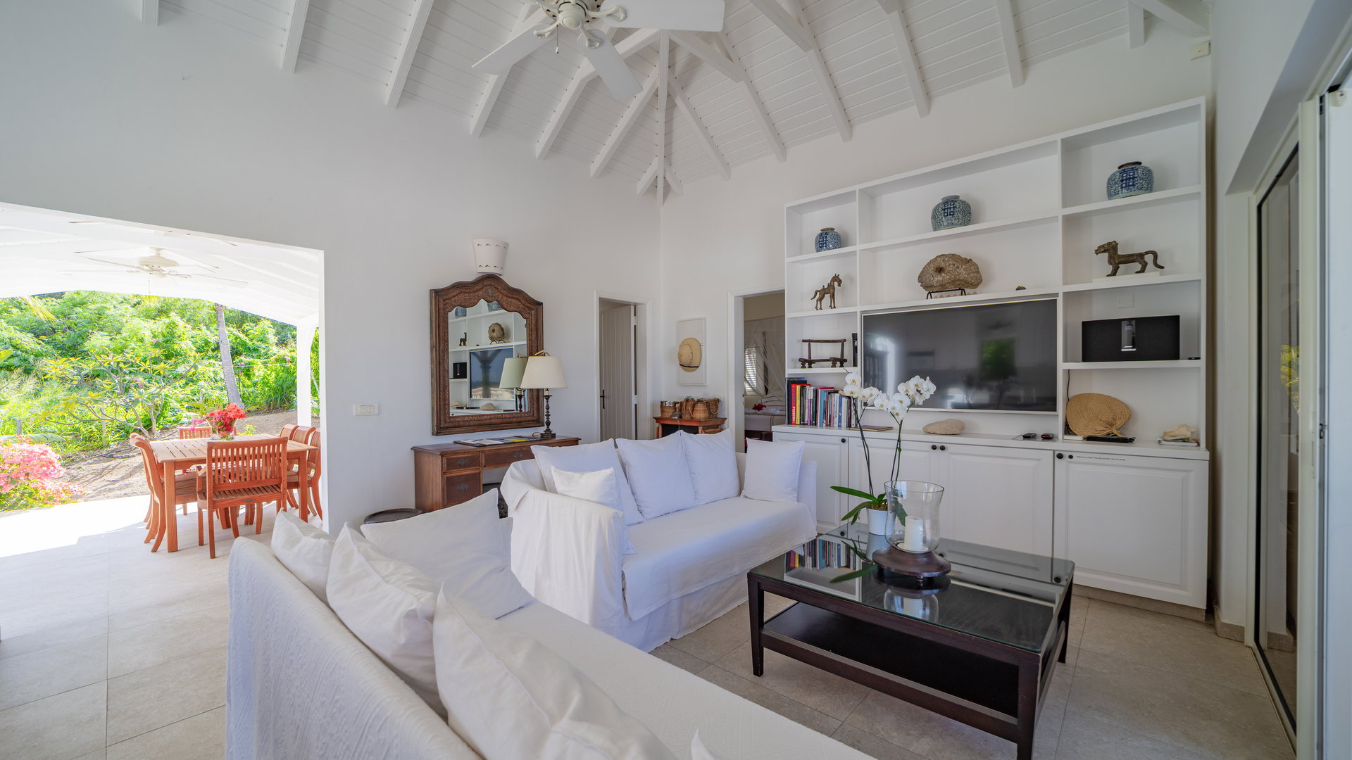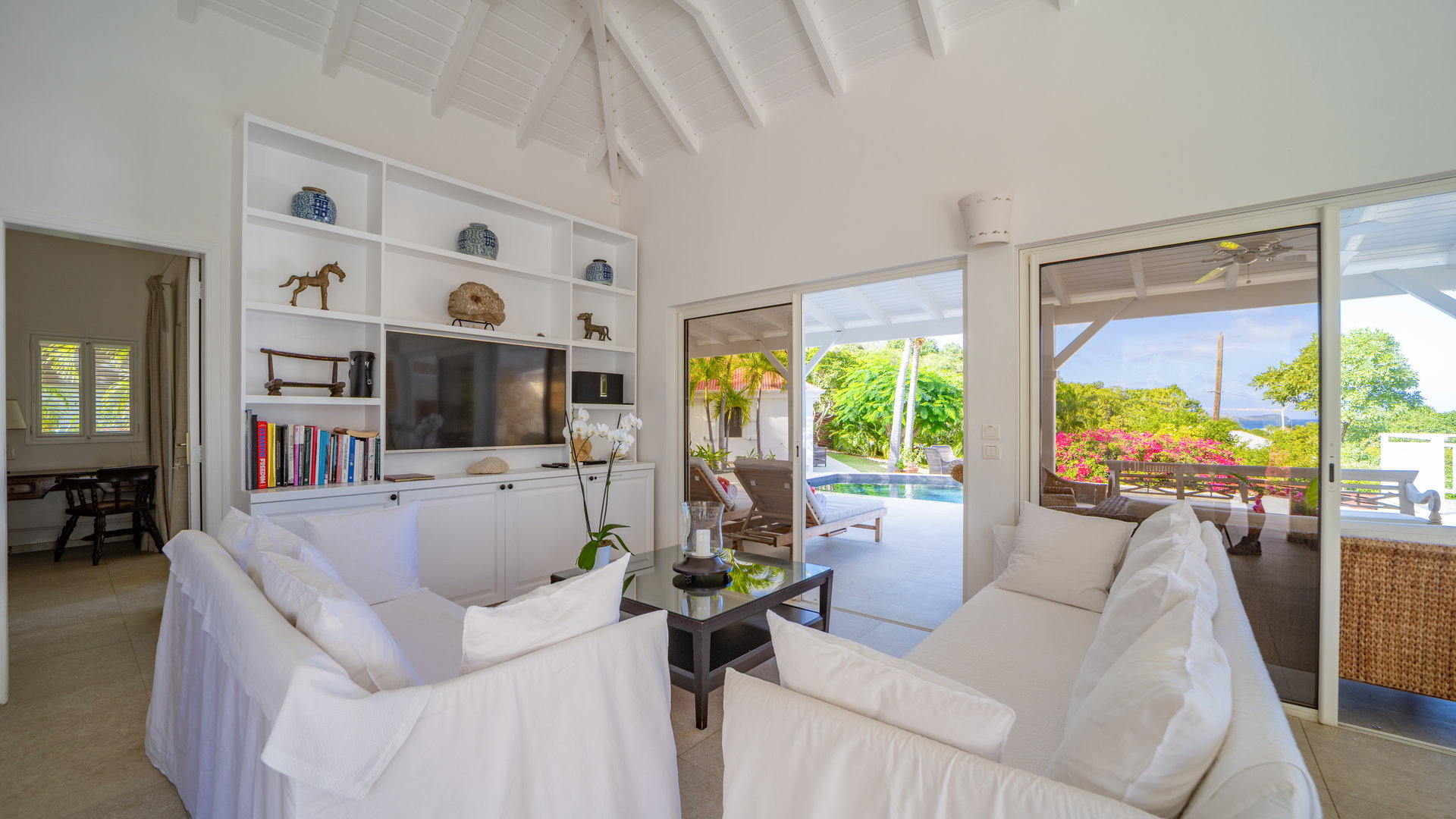 Built across a main house and a separate bungalow, villa St-Barts KIR ROYAL boasts spacious living areas gently cooled by the island’s trade winds. Fully air-conditioned, the main living space includes a cozy lounge with a plush sofa and HD screen, a dining area with exquisite wooden benches and a perfectly equipped kitchen. Woven textures and dark wood accents create a warm, refined ambiance beneath vaulted ceilings and crisp white walls. You’ll love the well-stocked library for quiet moments of reading in a peaceful, contemplative atmosphere.