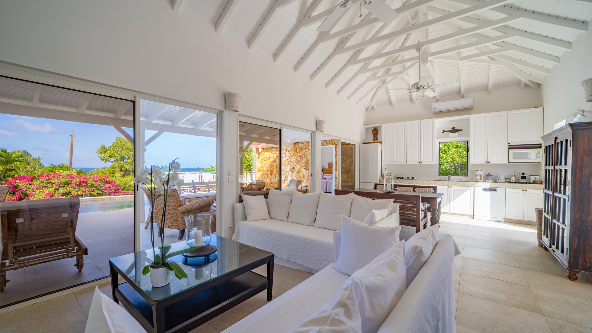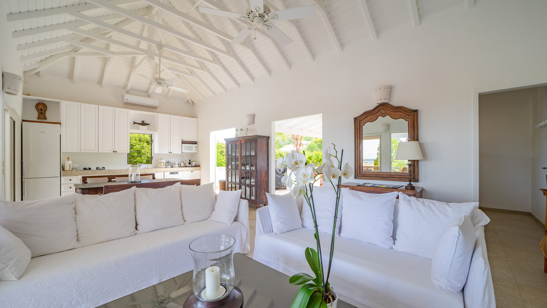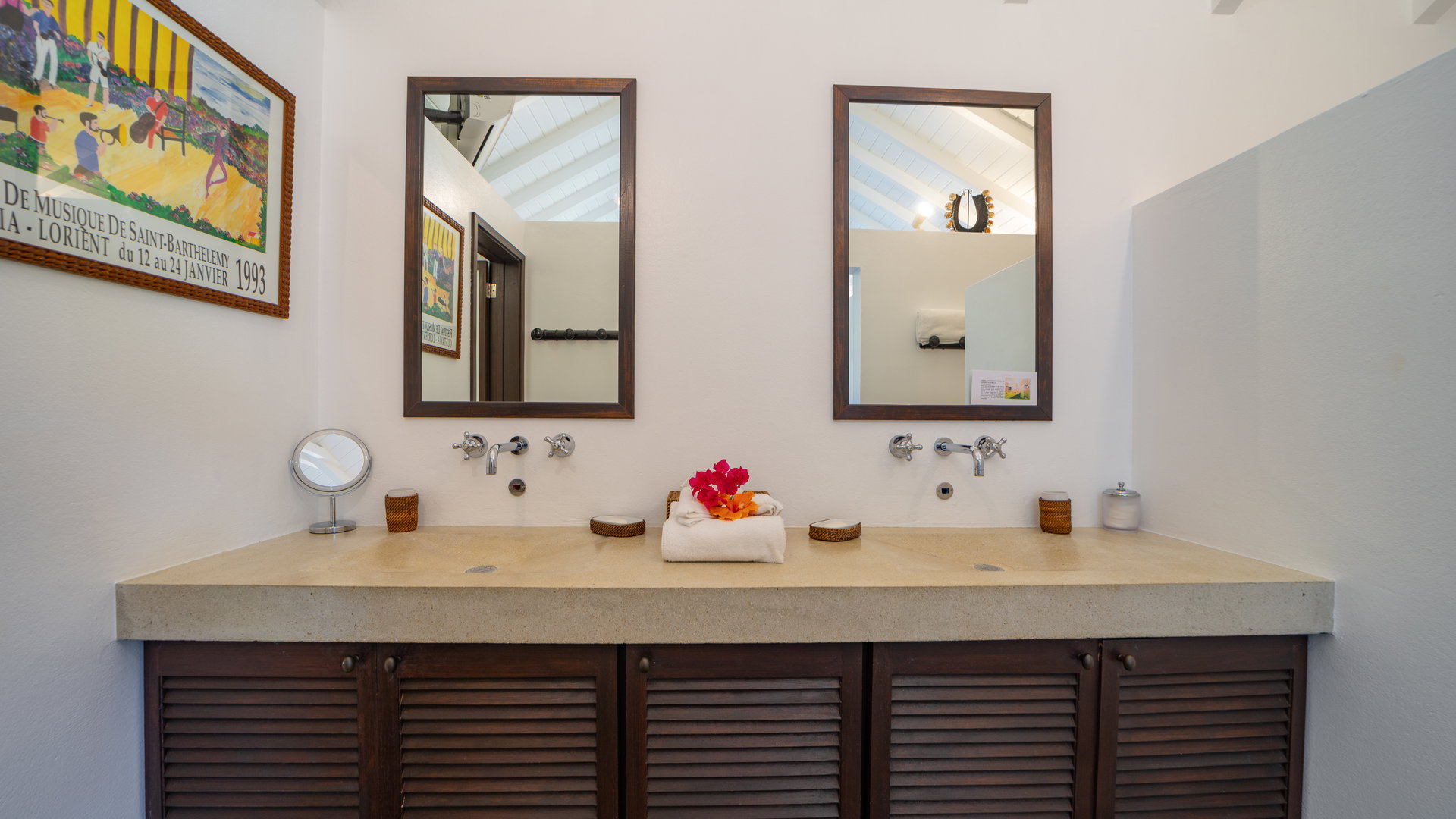 Built across a main house and a separate bungalow, villa St-Barts KIR ROYAL boasts spacious living areas gently cooled by the island’s trade winds. Fully air-conditioned, the main living space includes a cozy lounge with a plush sofa and HD screen, a dining area with exquisite wooden benches and a perfectly equipped kitchen. Woven textures and dark wood accents create a warm, refined ambiance beneath vaulted ceilings and crisp white walls. You’ll love the well-stocked library for quiet moments of reading in a peaceful, contemplative atmosphere.