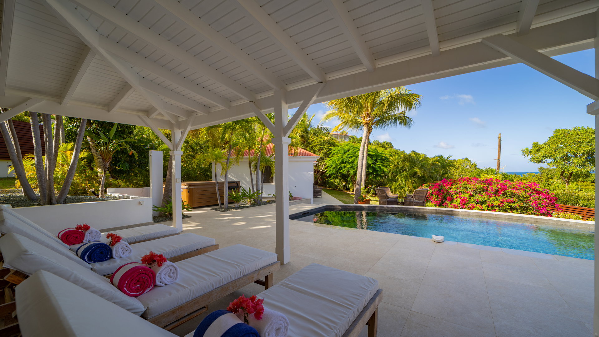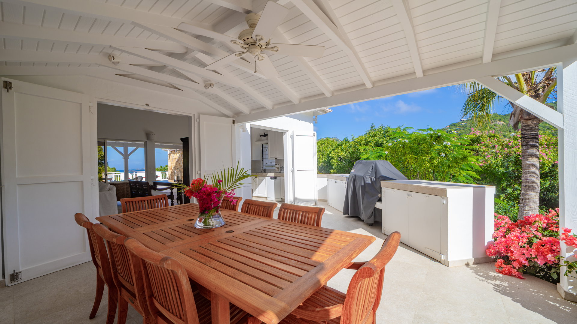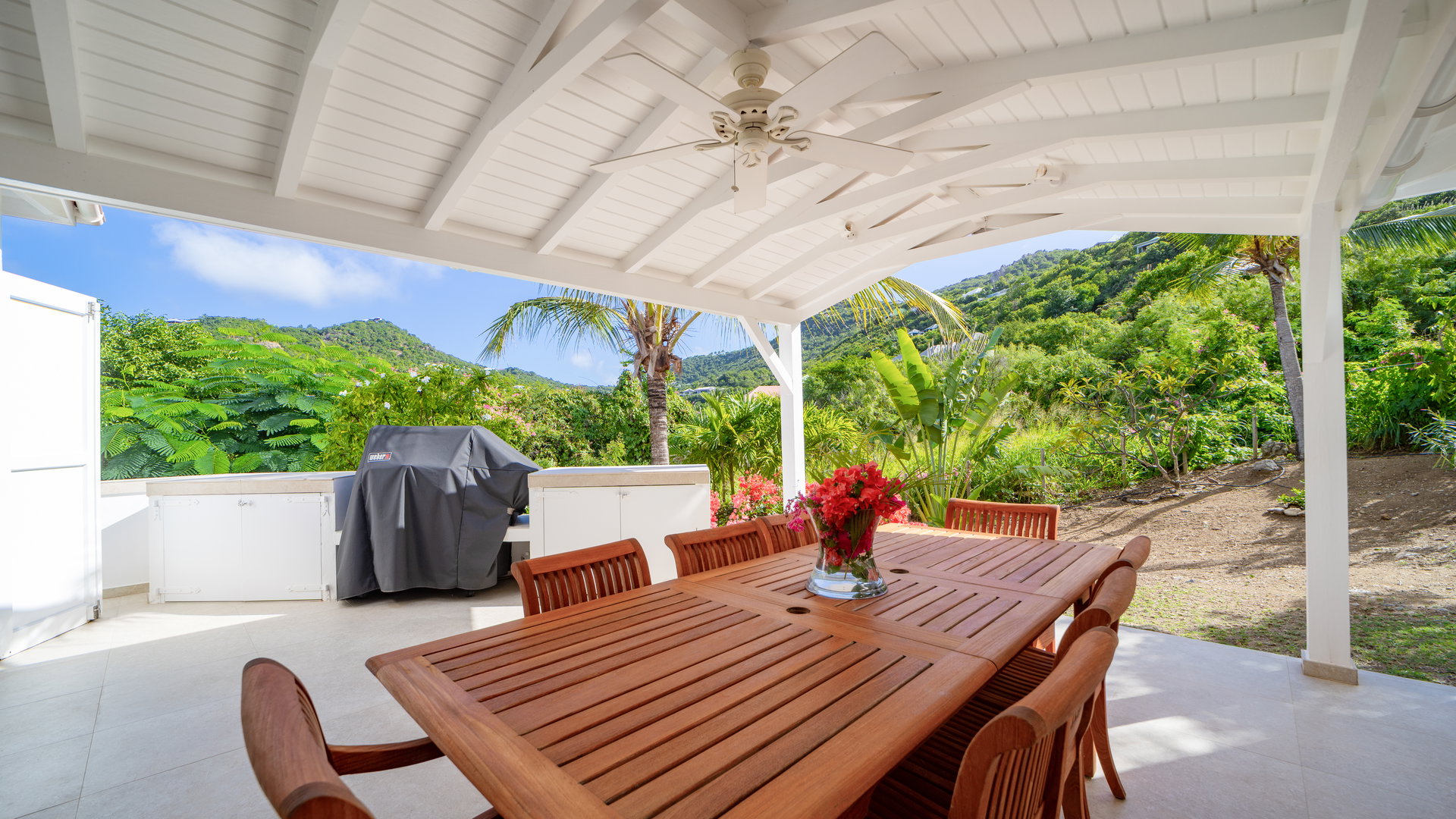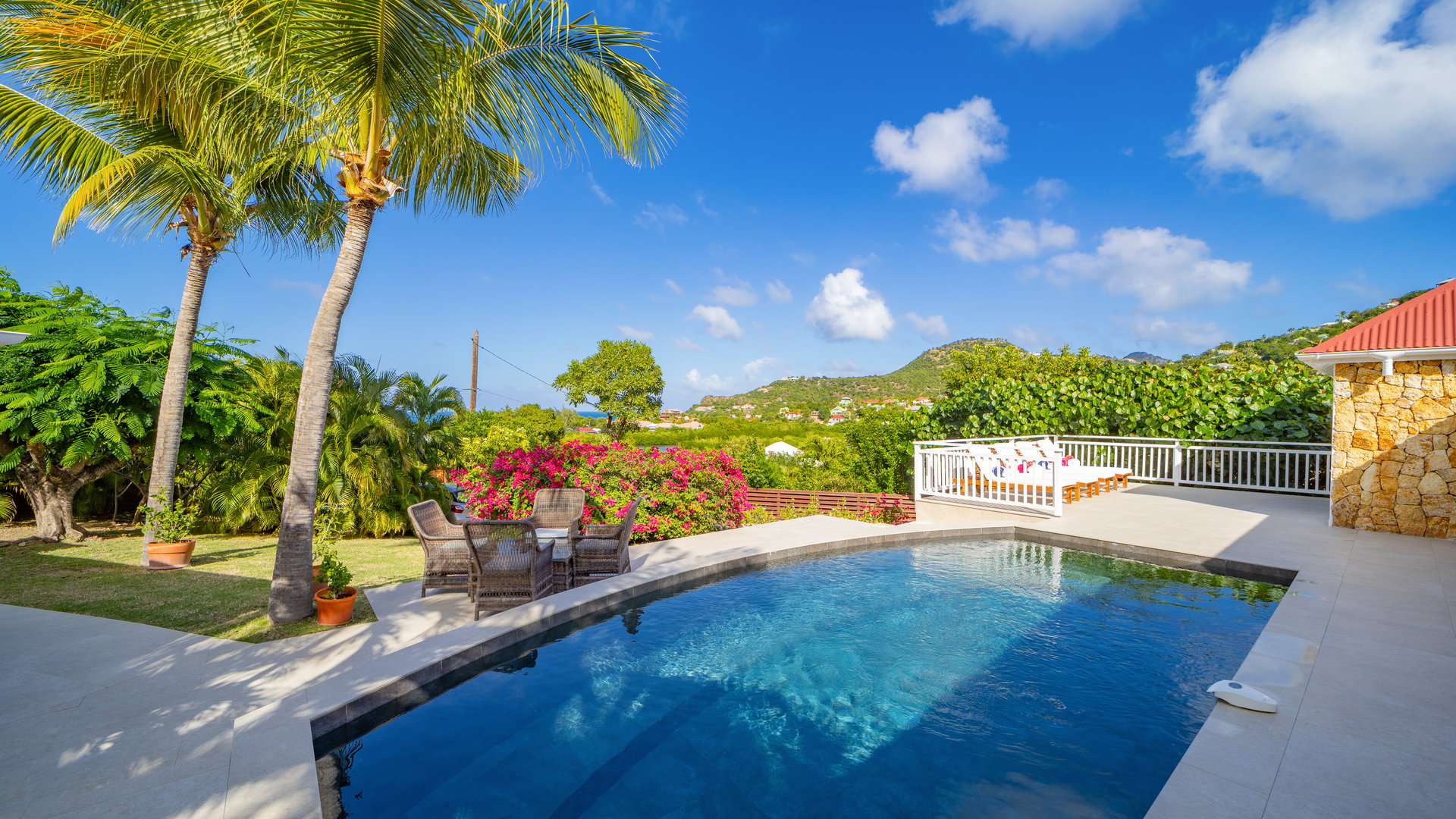 At the front of the villa St-Barts KIR ROYAL, the terrace opens onto a lovely 4x8m swimming pool and a jacuzzi facing the surrounding landscape and, in the distance, the deep-blue ocean. There are sun loungers lining the edge of the pool, set against pale stone tiling that contrasts beautifully with the water and the green foliage. Beneath the covered area, an outdoor lounge with armchairs and a coffee table offers the perfect spot to relax and enjoy the view. The rear terrace, accessible from the living room, features a charming al fresco dining area for up to eight guests, surrounded by lush garden greenery. A barbecue is available for savoring delicious meals cooked under the stars.