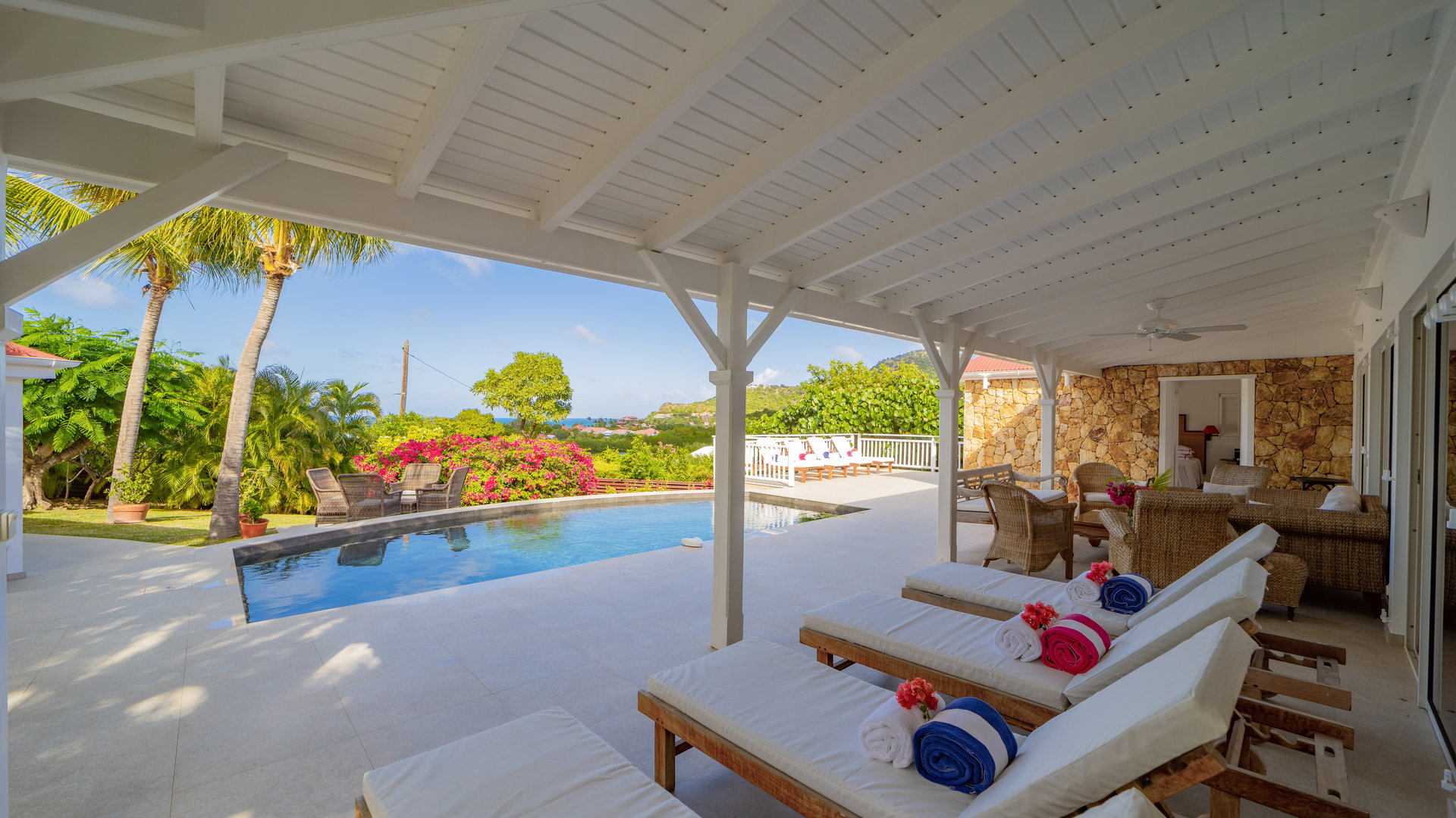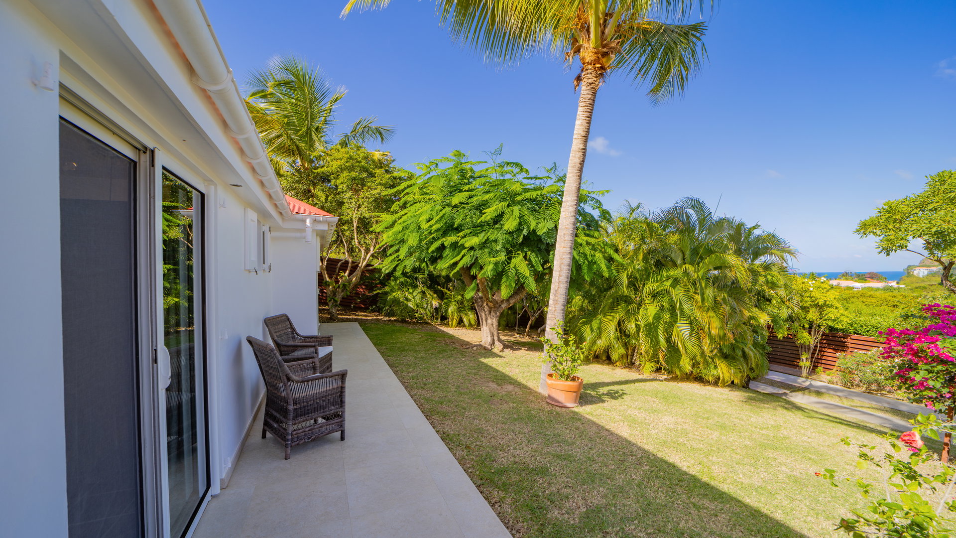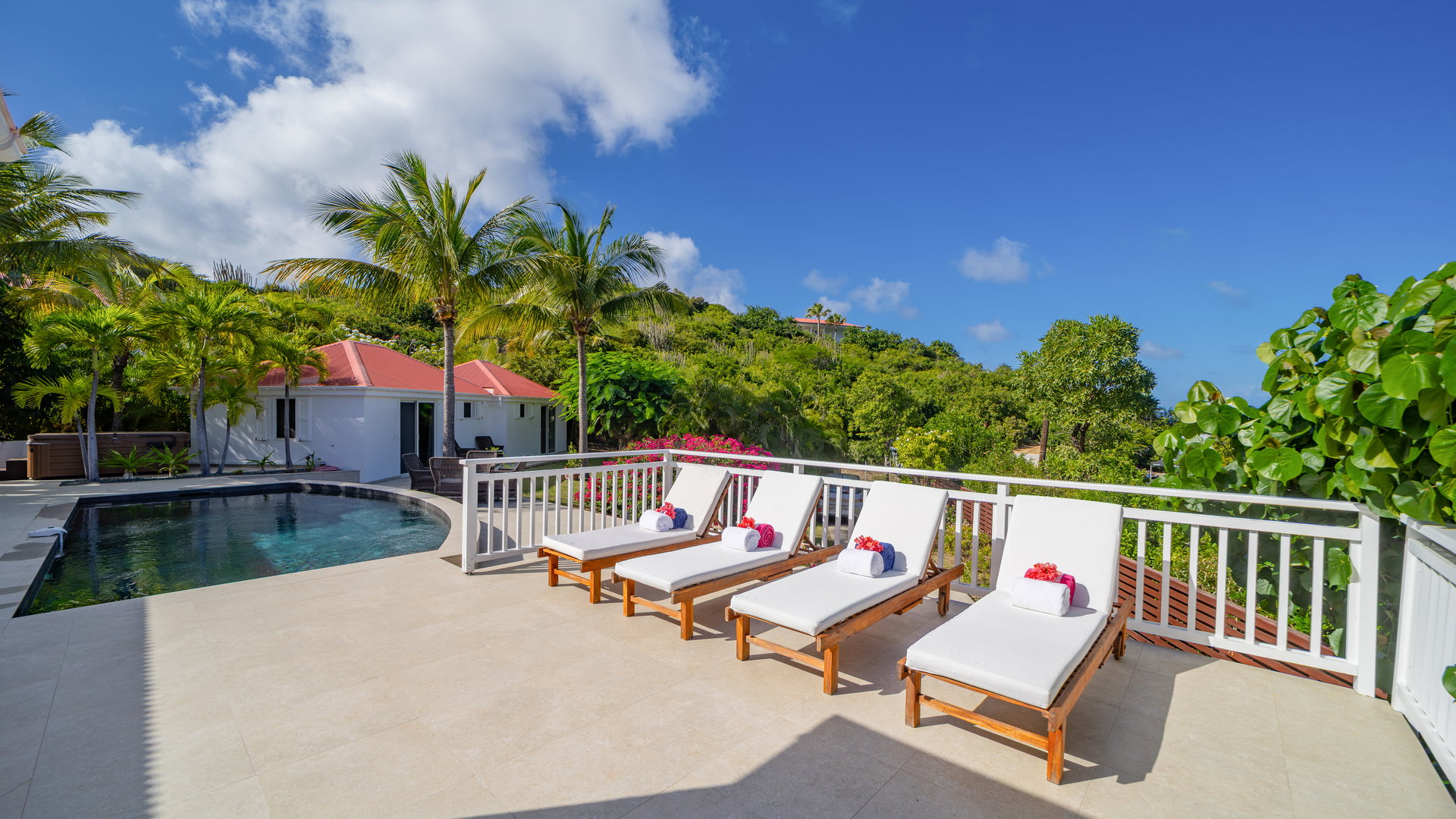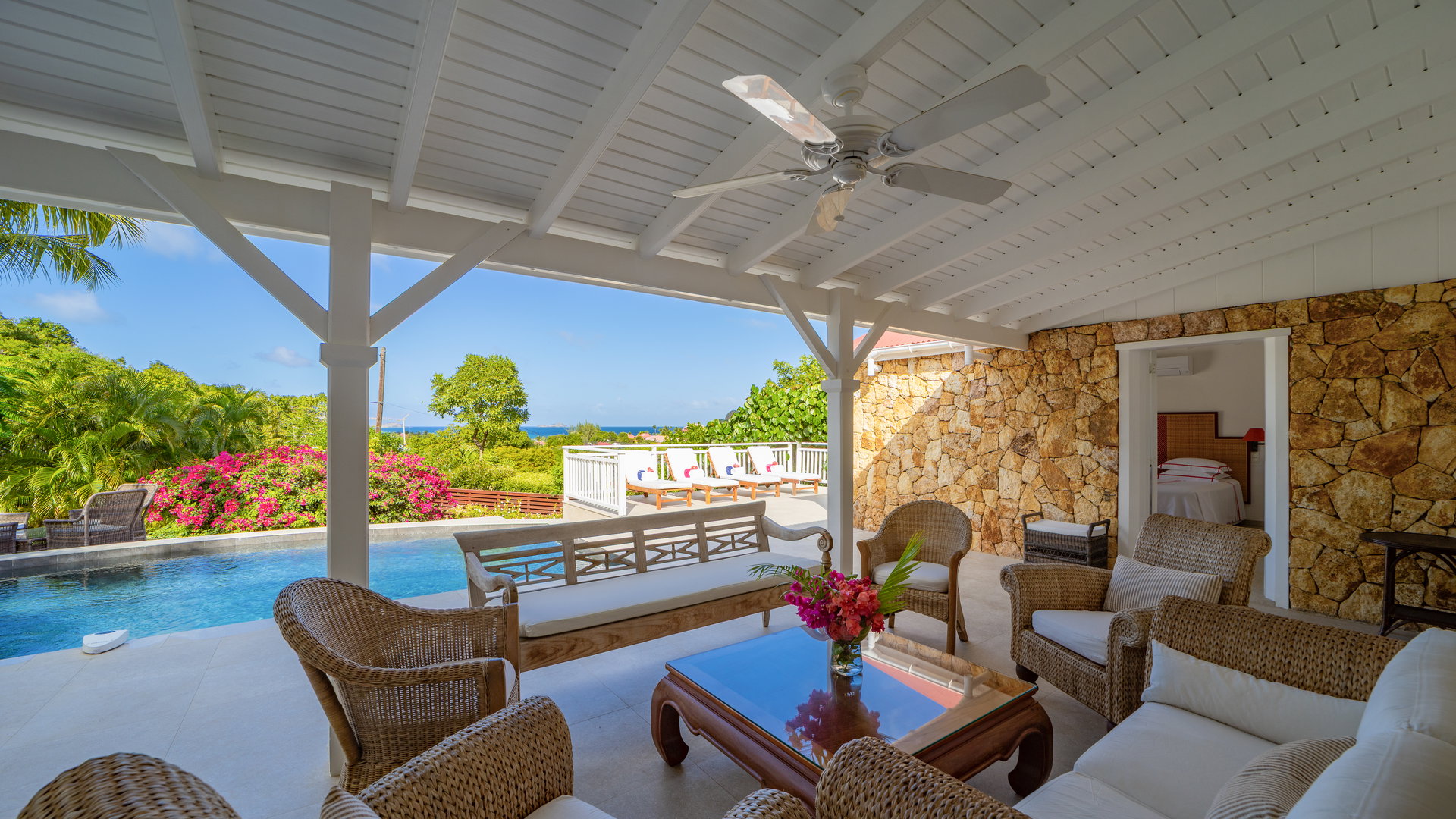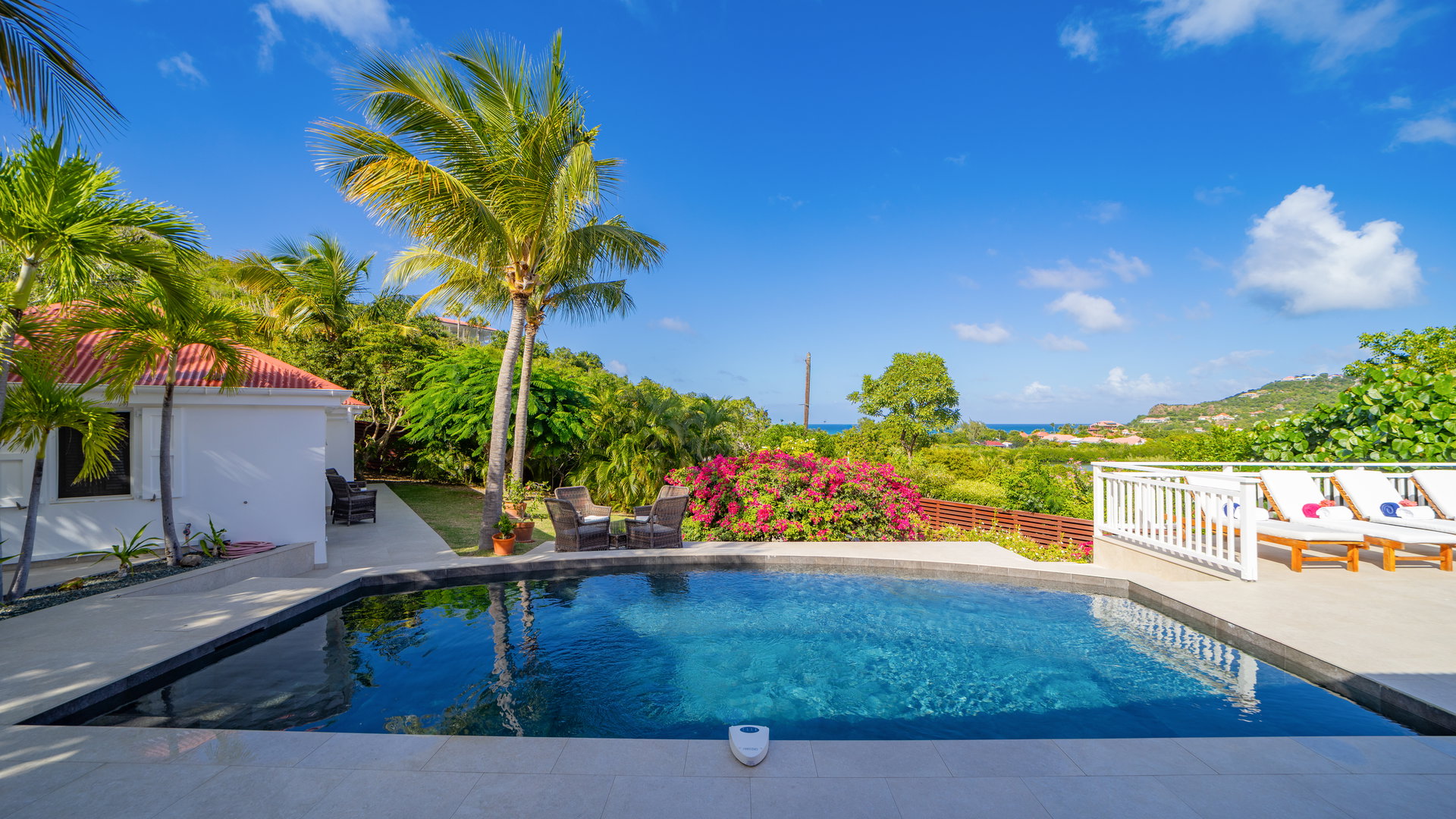 At the front of the villa St-Barts KIR ROYAL, the terrace opens onto a lovely 4x8m swimming pool and a jacuzzi facing the surrounding landscape and, in the distance, the deep-blue ocean. There are sun loungers lining the edge of the pool, set against pale stone tiling that contrasts beautifully with the water and the green foliage. Beneath the covered area, an outdoor lounge with armchairs and a coffee table offers the perfect spot to relax and enjoy the view. The rear terrace, accessible from the living room, features a charming al fresco dining area for up to eight guests, surrounded by lush garden greenery. A barbecue is available for savoring delicious meals cooked under the stars.