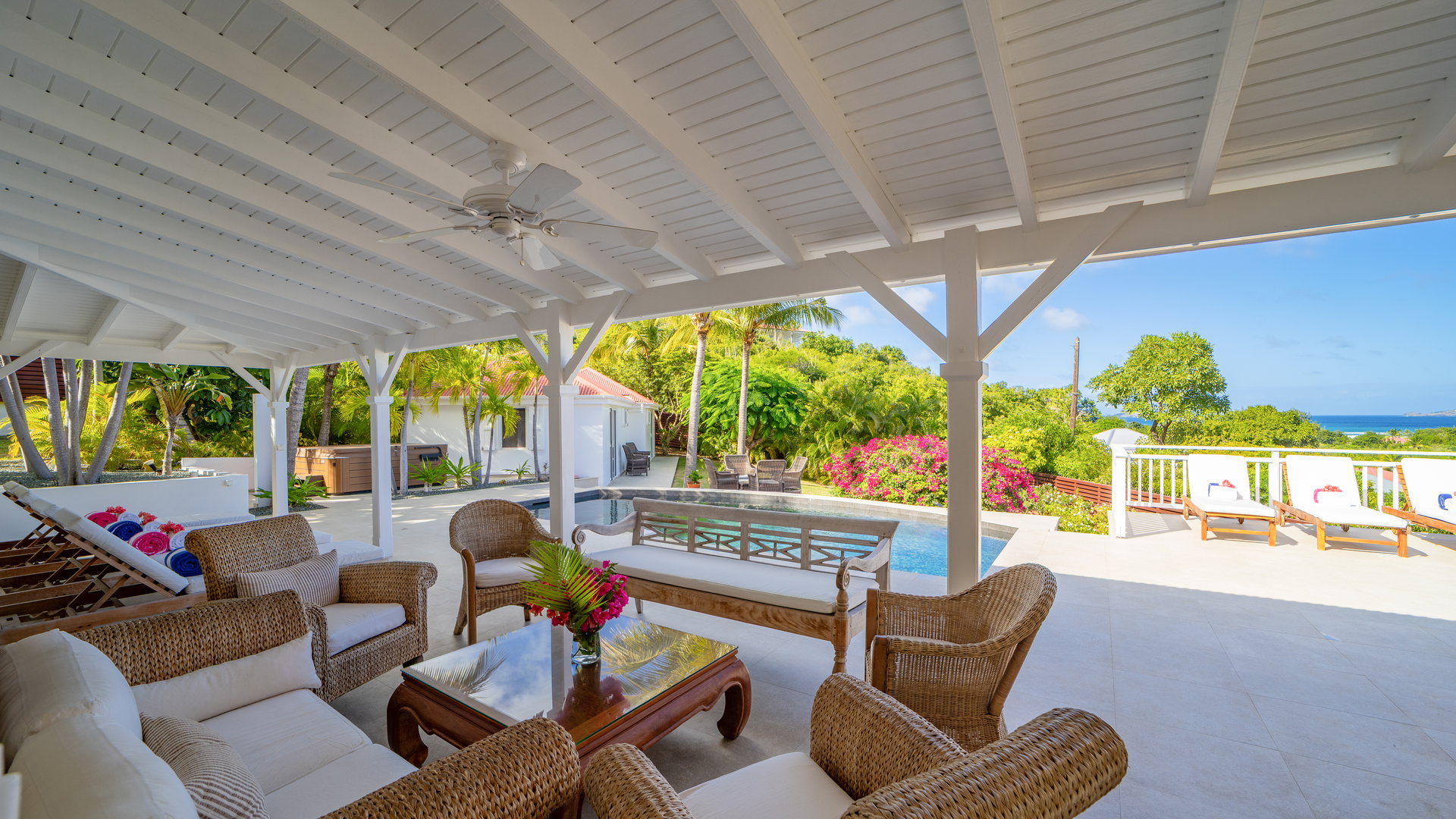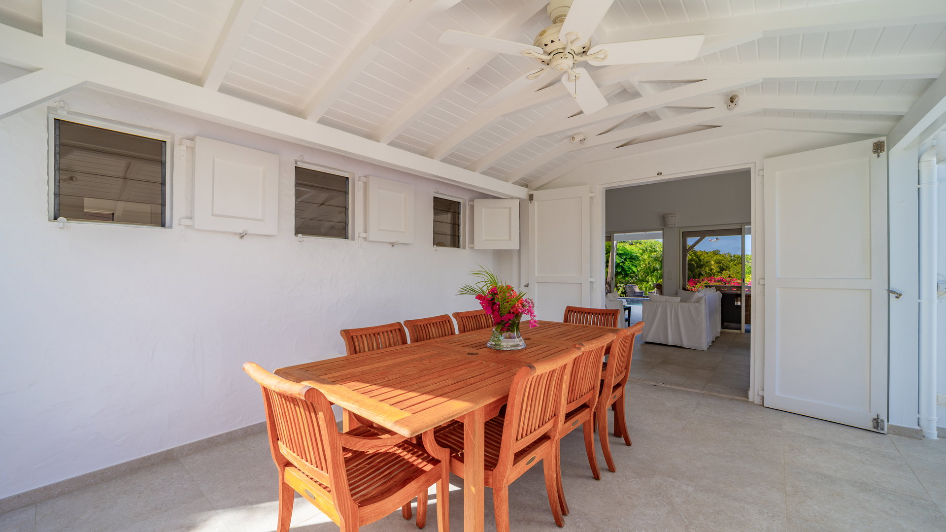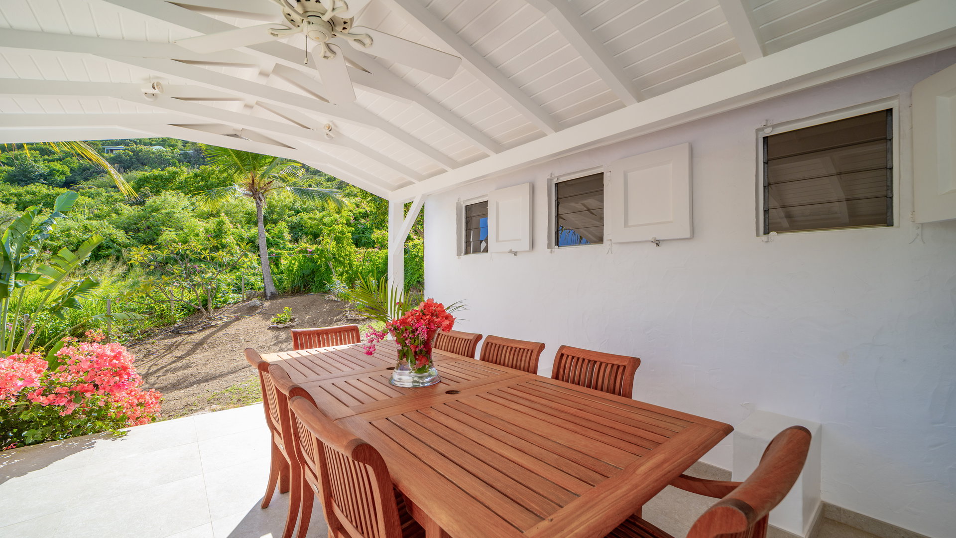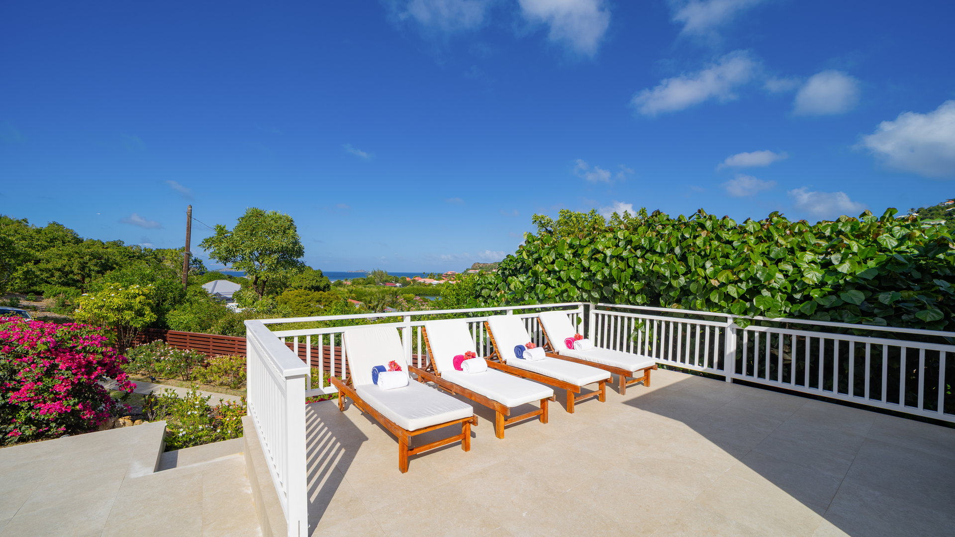 At the front of the villa St-Barts KIR ROYAL, the terrace opens onto a lovely 4x8m swimming pool and a jacuzzi facing the surrounding landscape and, in the distance, the deep-blue ocean. There are sun loungers lining the edge of the pool, set against pale stone tiling that contrasts beautifully with the water and the green foliage. Beneath the covered area, an outdoor lounge with armchairs and a coffee table offers the perfect spot to relax and enjoy the view. The rear terrace, accessible from the living room, features a charming al fresco dining area for up to eight guests, surrounded by lush garden greenery. A barbecue is available for savoring delicious meals cooked under the stars.