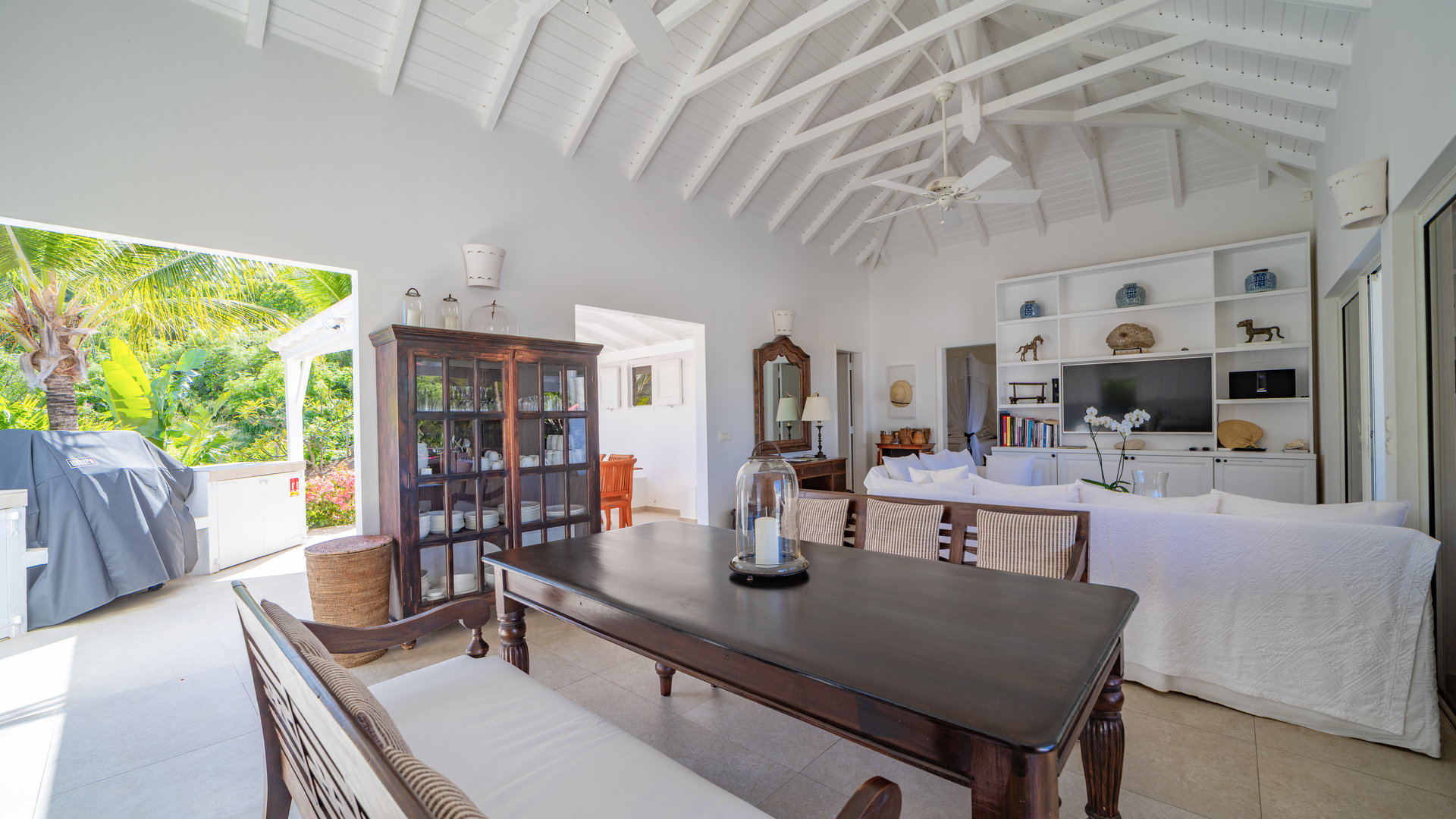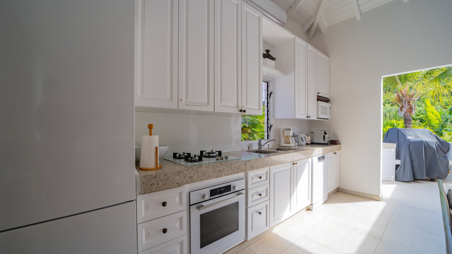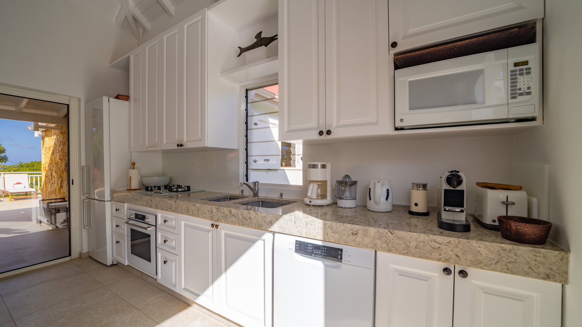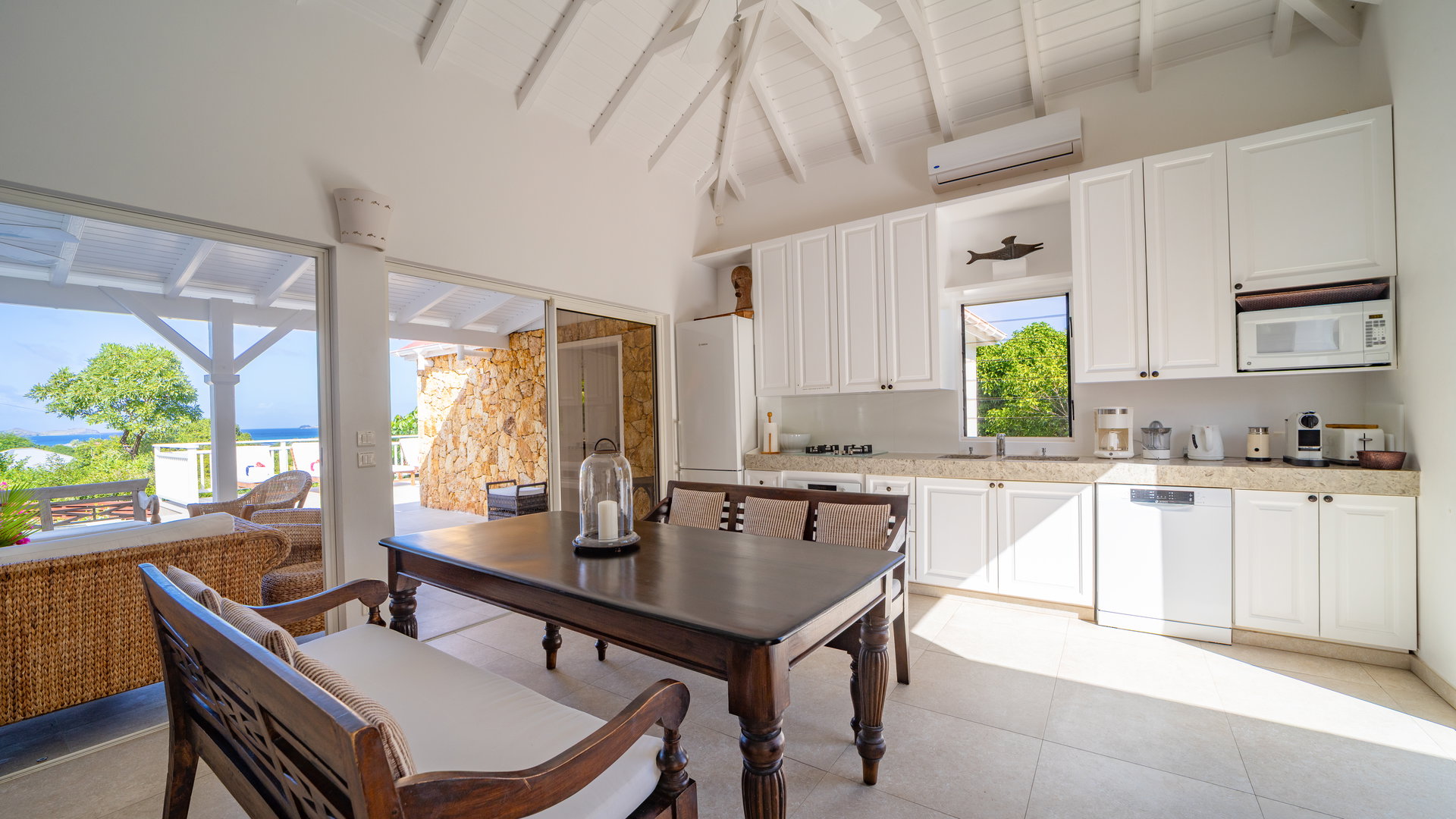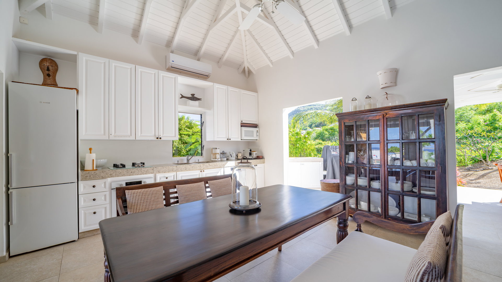 Fully equipped kitchen. Electric oven, gas stove, microwave, refrigerator, mixer, centrifuge, freezer, dishwasher, Nespresso machine, blender, kettle, toaster, breakfast bar. Indoor dining table. Outdoor dining table under an ajoupa. Between the kitchen and the living room is a small indoor dining table with bench-style seating. There’s also an interior courtyard with a second large dining table, complete with a gas grill for island-style cookouts.